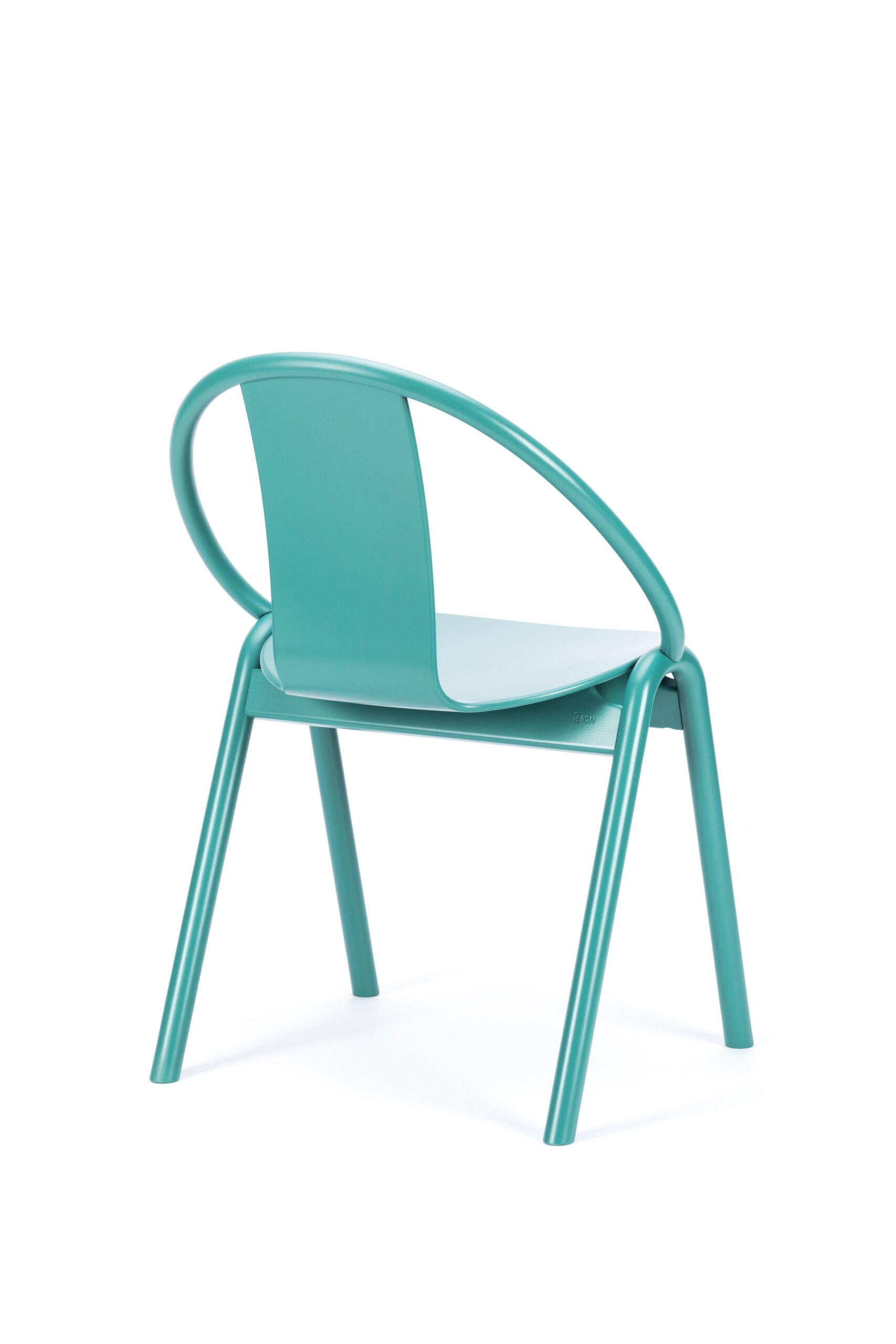Inspired by the shape of a tennis racket, the design takes advantage of Ton’s signature wood-bending technique and applies it to a form normally seen in metal furniture.