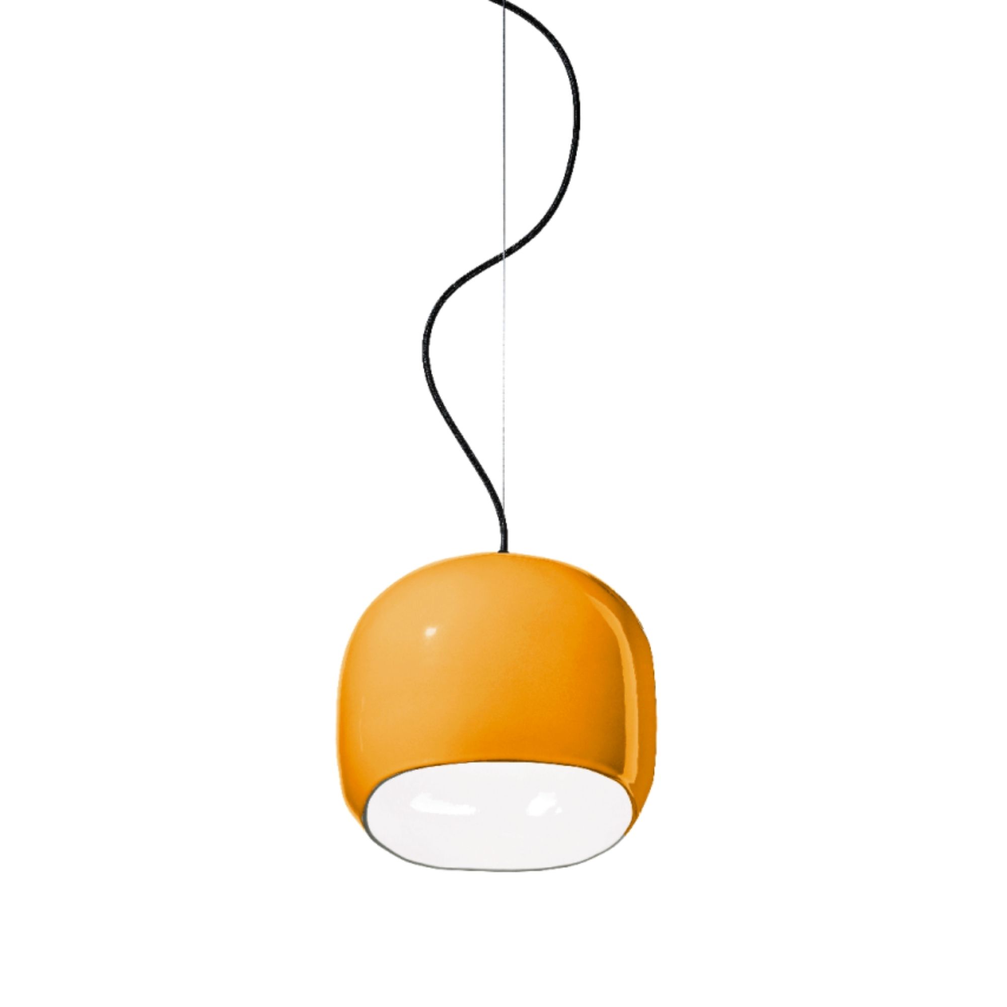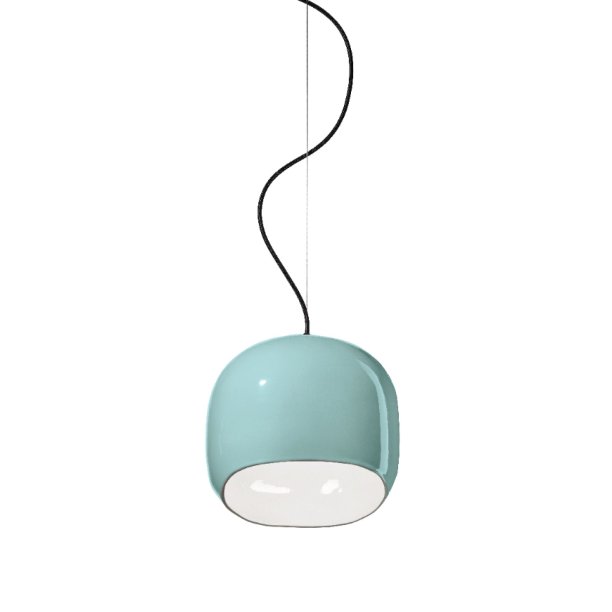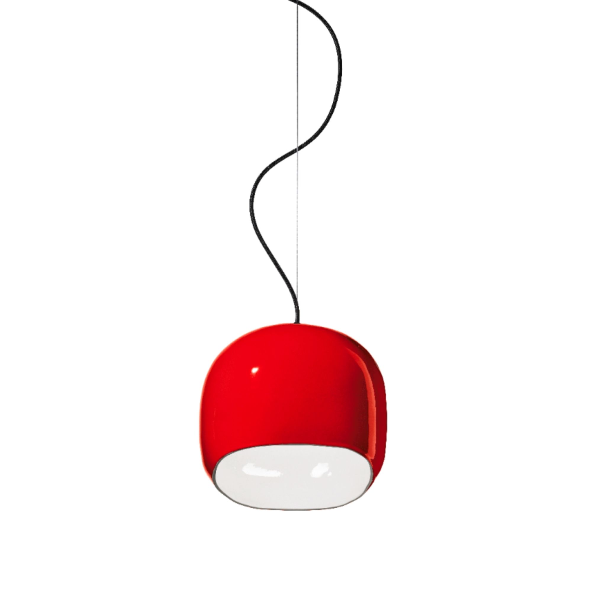 Ayrton Pendant by Ferroluce draws inspiration from the sleek, reflective surfaces of racing helmets. Its glossy ceramic body captures and enhances surrounding light, outlining shimmering contours and creating depth on its vitreous skin. The lower section is carefully cut to maximise output, ensuring a focused yet soft diffusion of light.