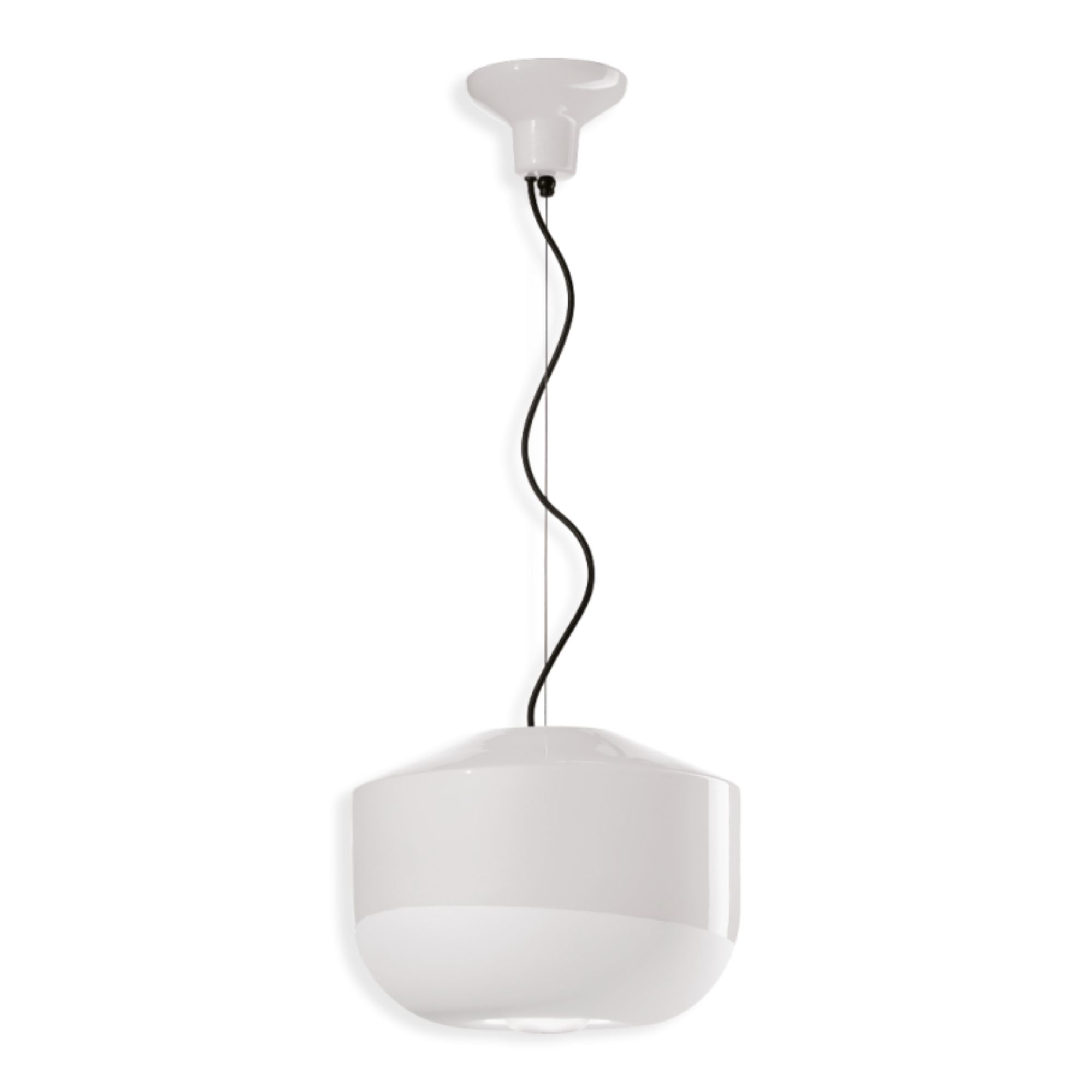 Bellota Pendant by Ferroluce is inspired by phyto-morphic forms, alternating between linear precision and wavy softness. Its sculptural ceramic body is enhanced by the traditional engobe technique, creating a unique interplay of glossy and matte finishes that emphasise its volume. The design feels both organic and architectural, with a light source that emerges unshielded to maximise illumination.