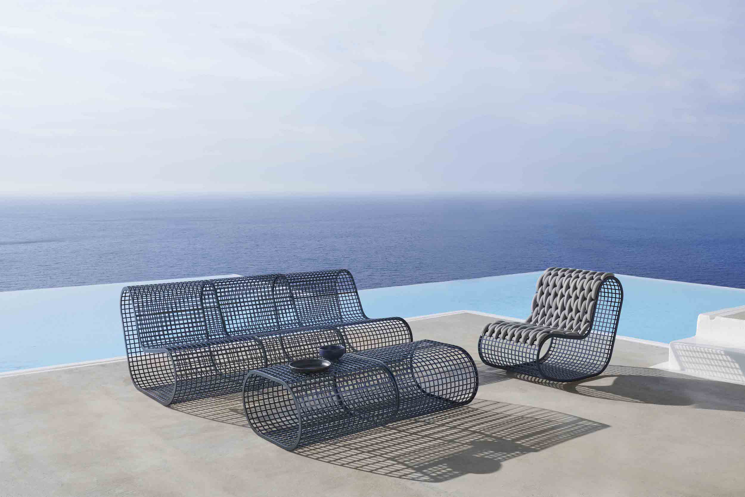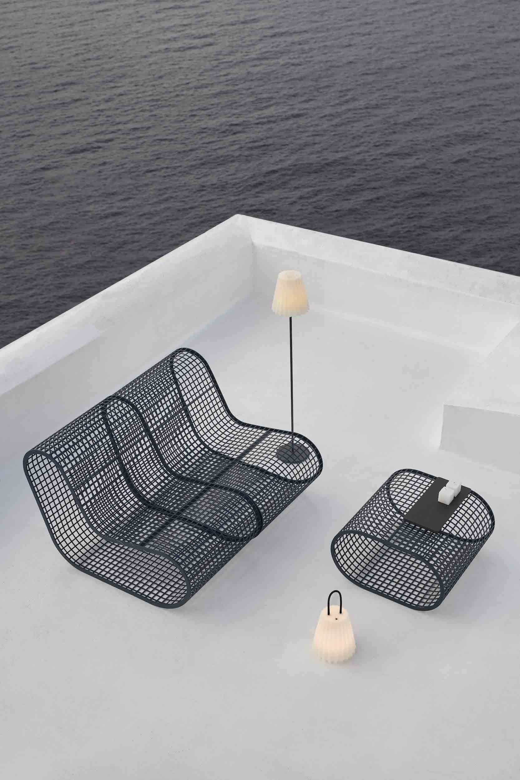 Buit Coffee Table by Gandiablasco is an outdoor table made with welded aluminium mesh, available in a variety of powder-coated finishes.