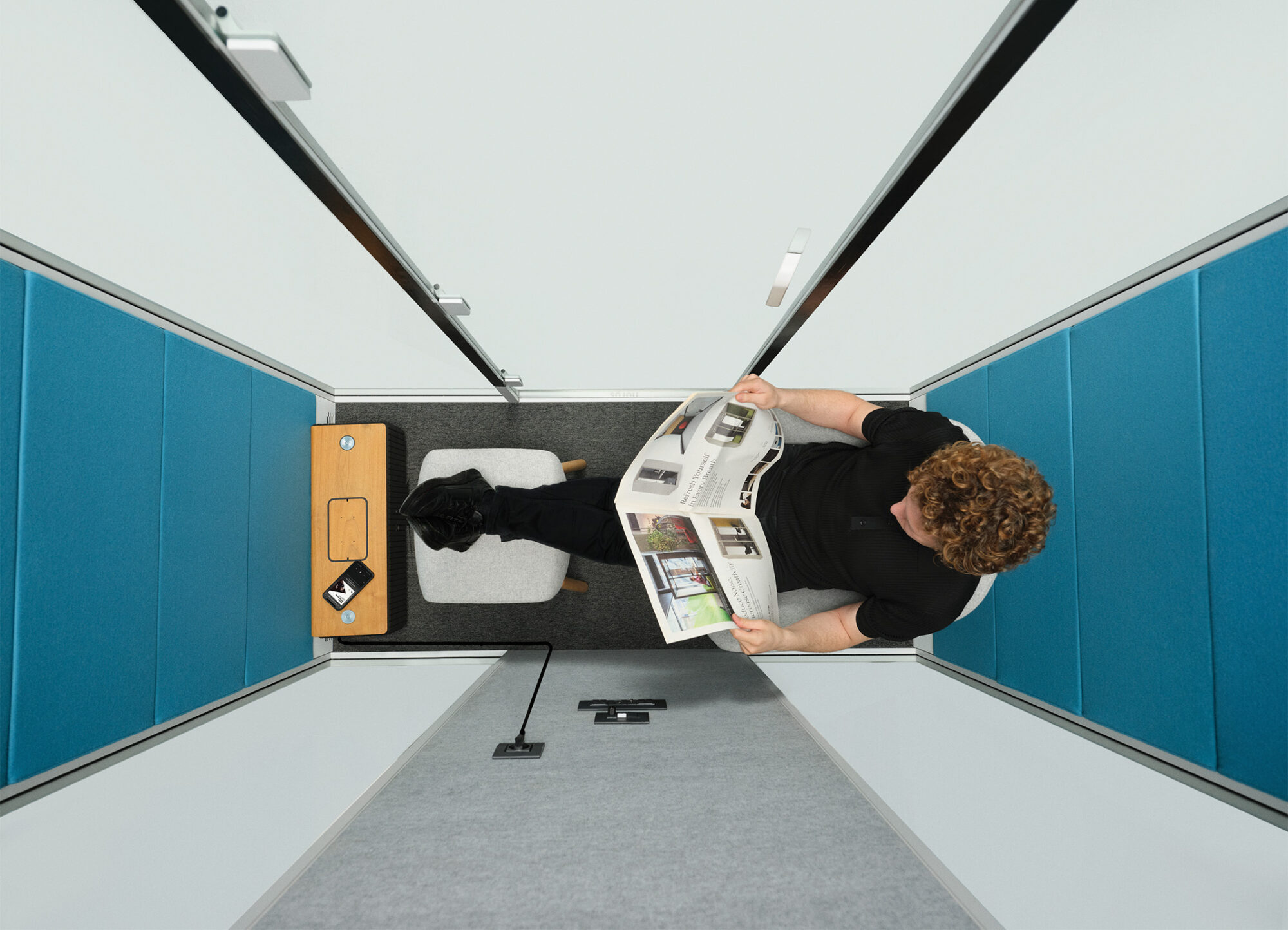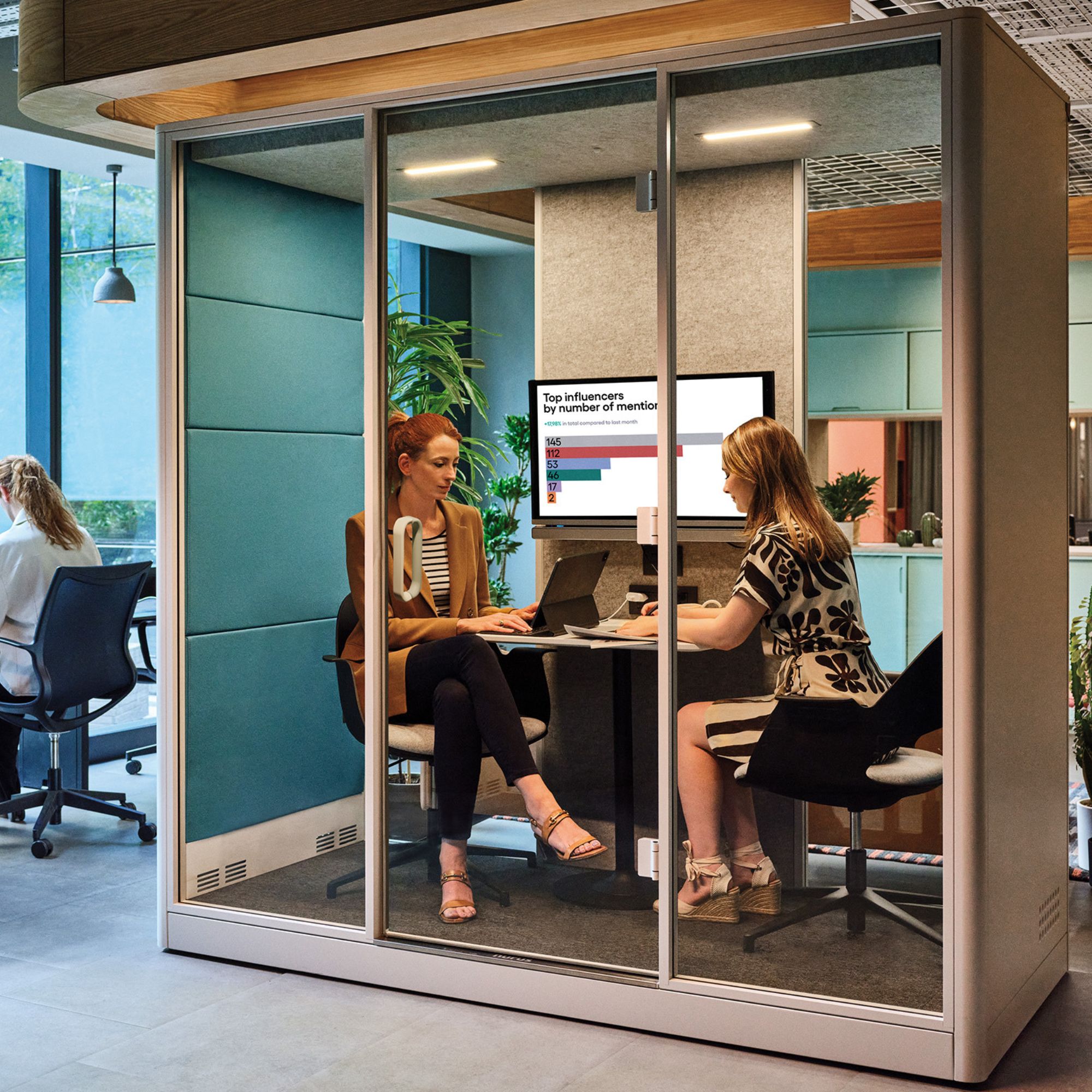 A meeting table and seamless media wall integration ensuring the perfect setup for every interaction. The integrated media wall enhances digital communication, featuring Links modules and broadcast lighting for stable connectivity and professional-quality video calls offering the optimal screen to space ratio within a 2.2sqm workspace.