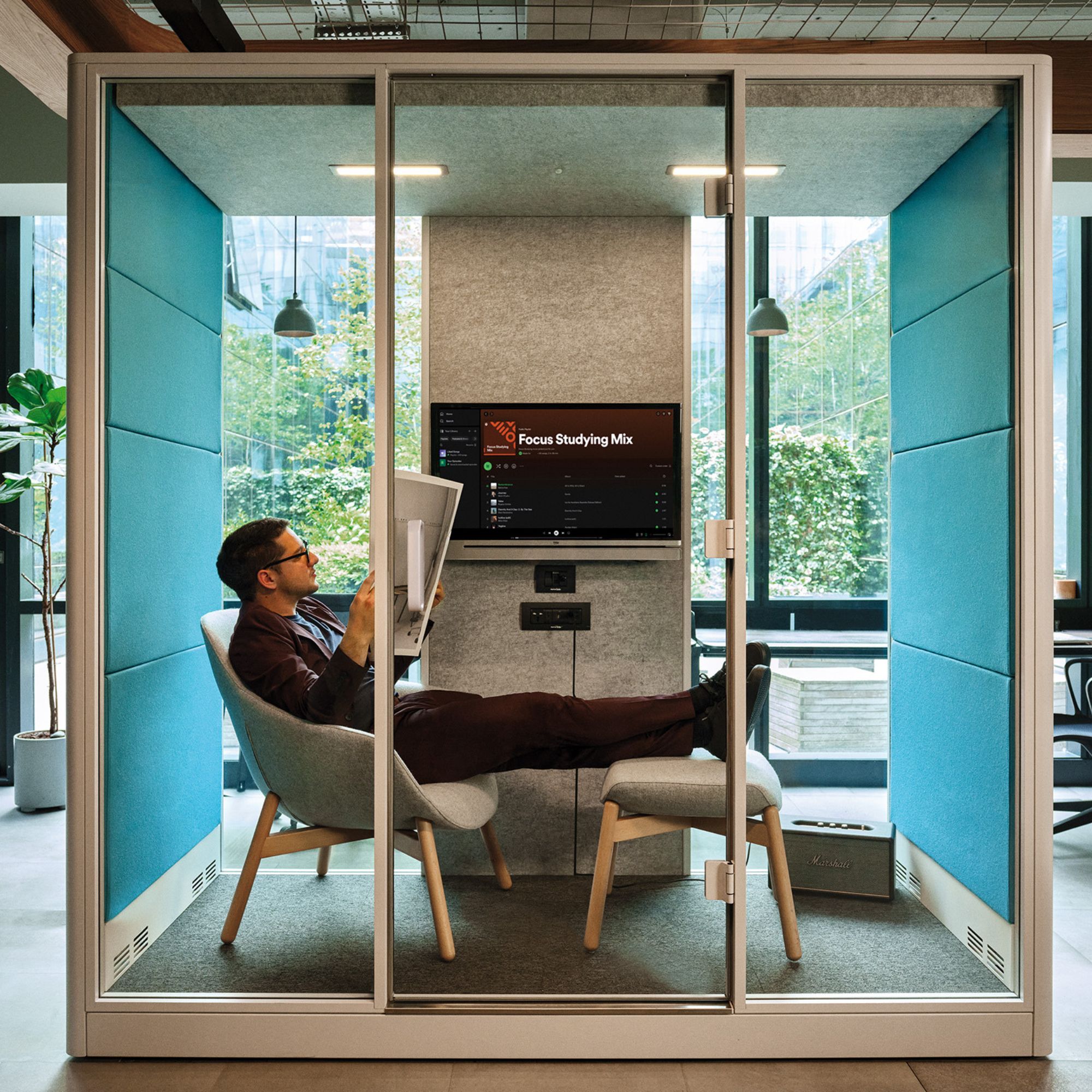 Additional thoughtful touches include, a main power unit, HDMI, ethernet and power sockets, built-in seating, dimmable 2700K warm lighting, motion detecting PIR sensor for automatic light, two coat hangers and fan activation. Castors and Seismic footplates provide safety and mobility for future proofing. Basotect G+ Acoustic Layering provides healthy and balanced acoustics for both high and low frequencies.