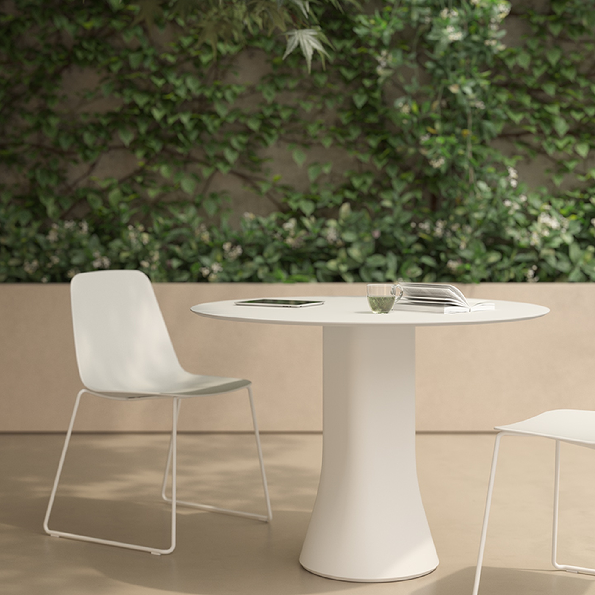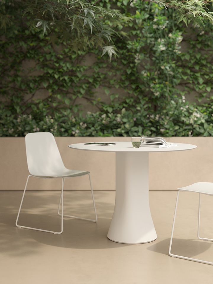Cambio Outdoor Table by Viccarbe is a refined outdoor table crafted for controlled environments, combining durable compact laminated surfaces with a sculptural central support. Its versatile forms and sizes accommodate a range of social settings, offering a harmonious balance of strength and elegance.