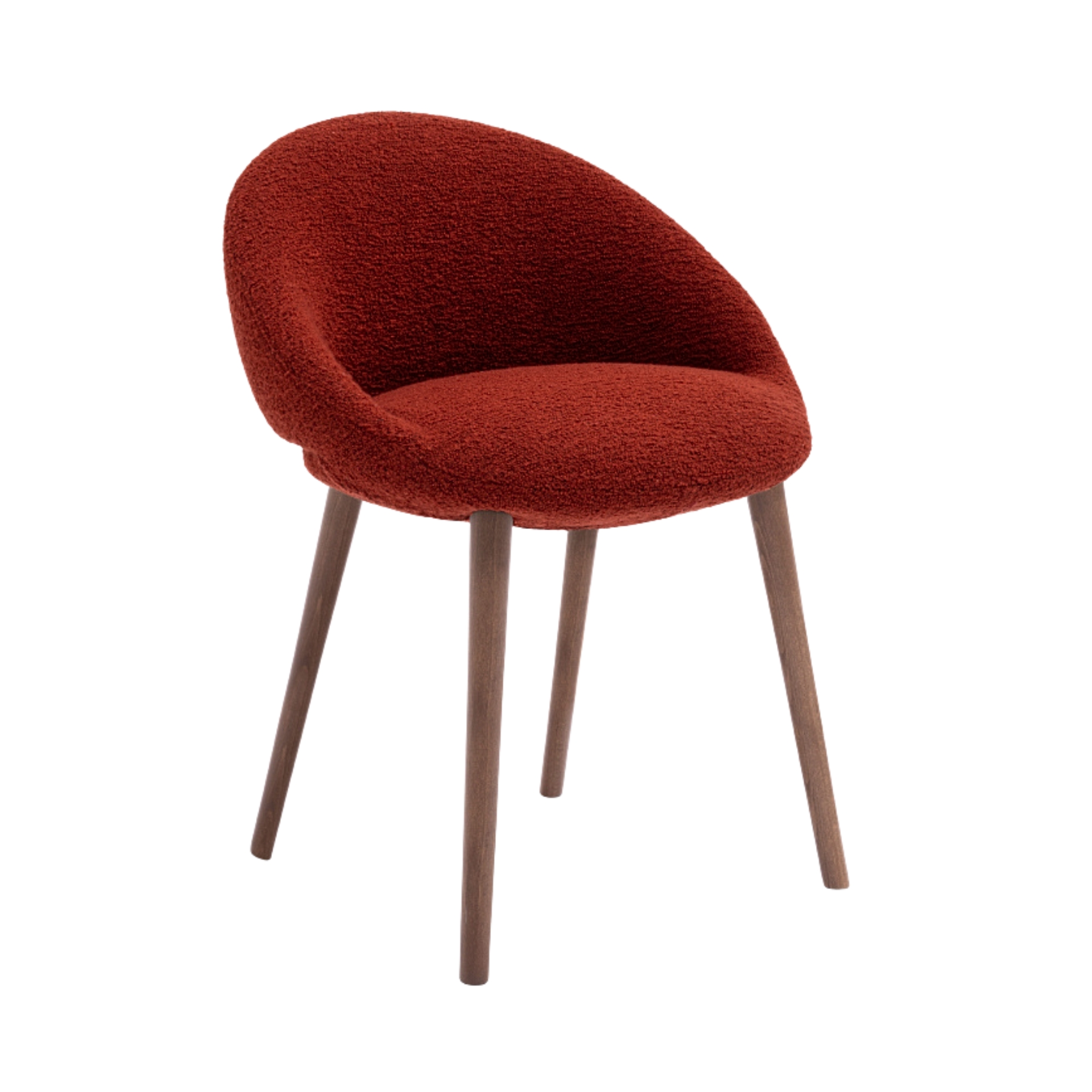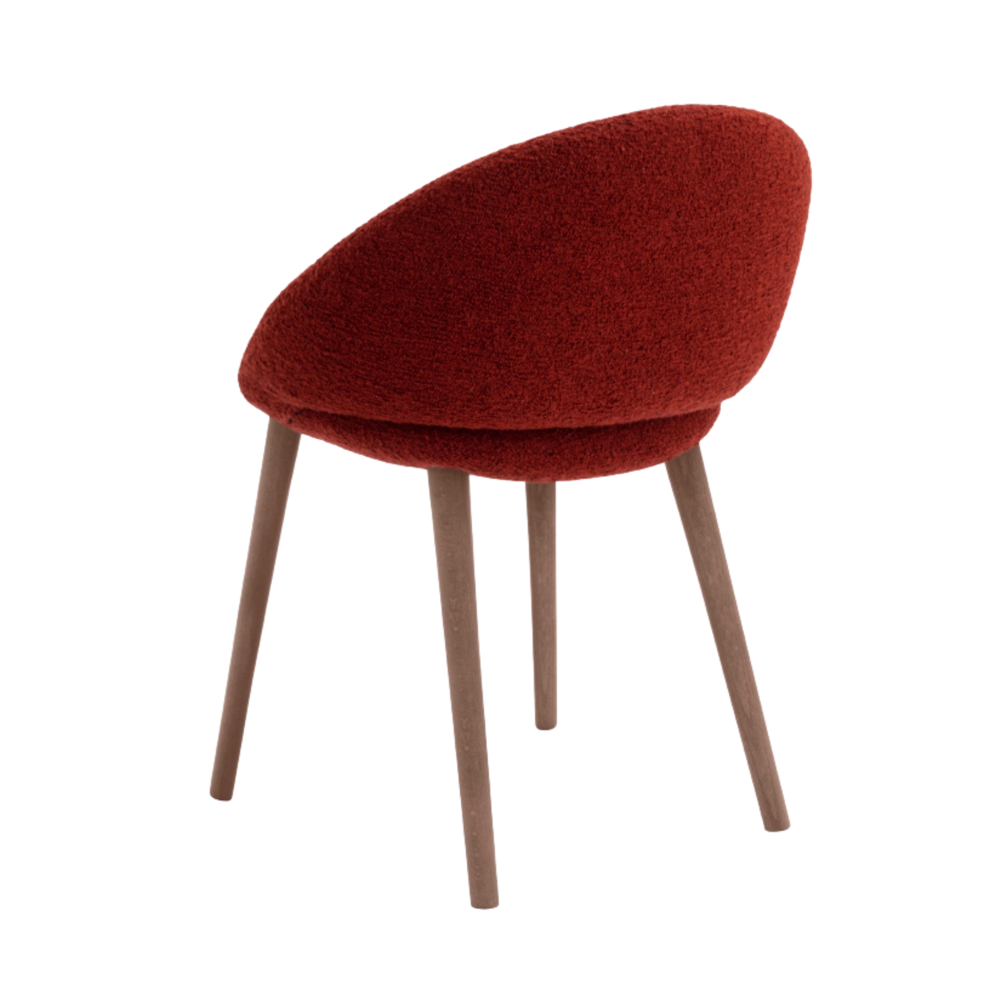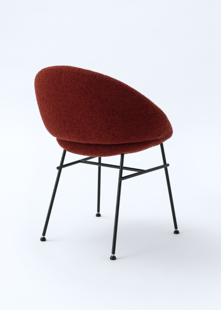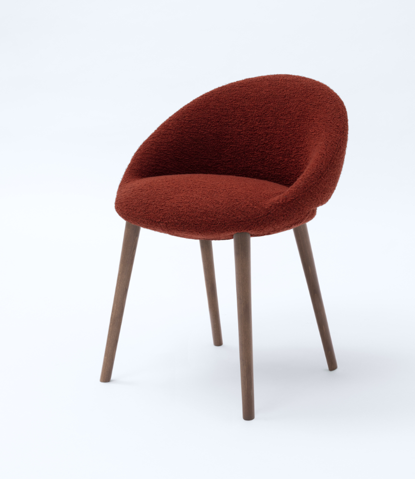 Its elegance and materiality are enhanced by soft textile upholstery, in a carefully chosen palette that lends it personality and character. The soft proportions of this model allow it to fit harmoniously around a table, both in private and public spaces, lending style and comfort.