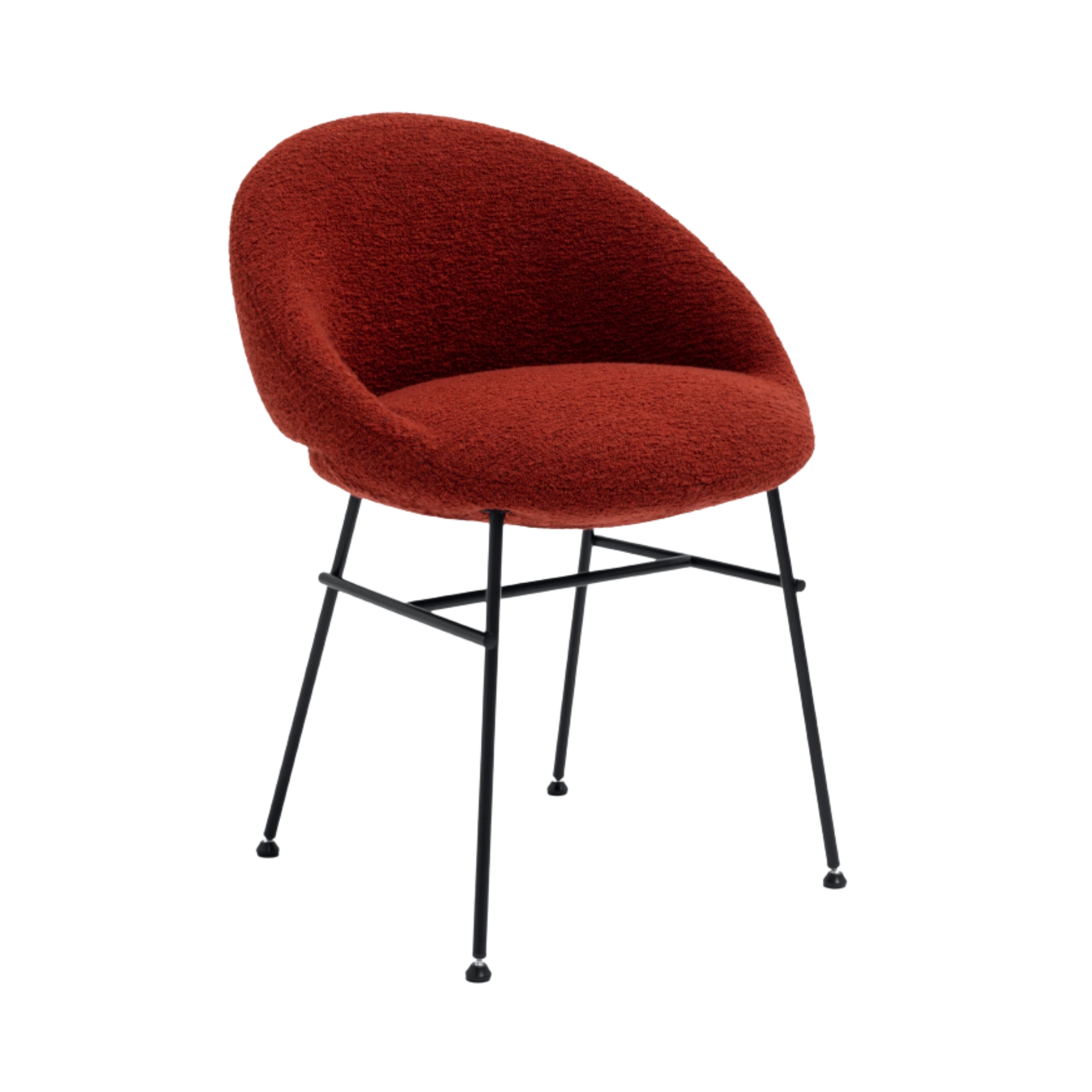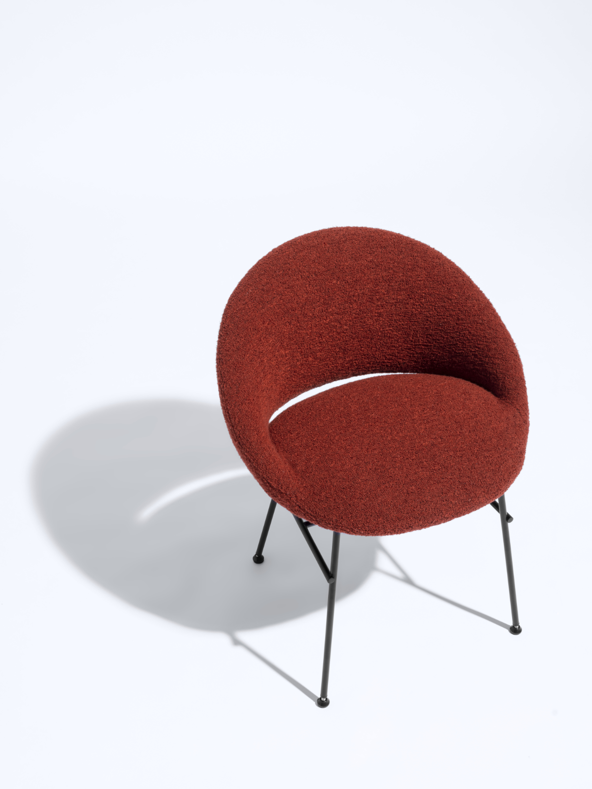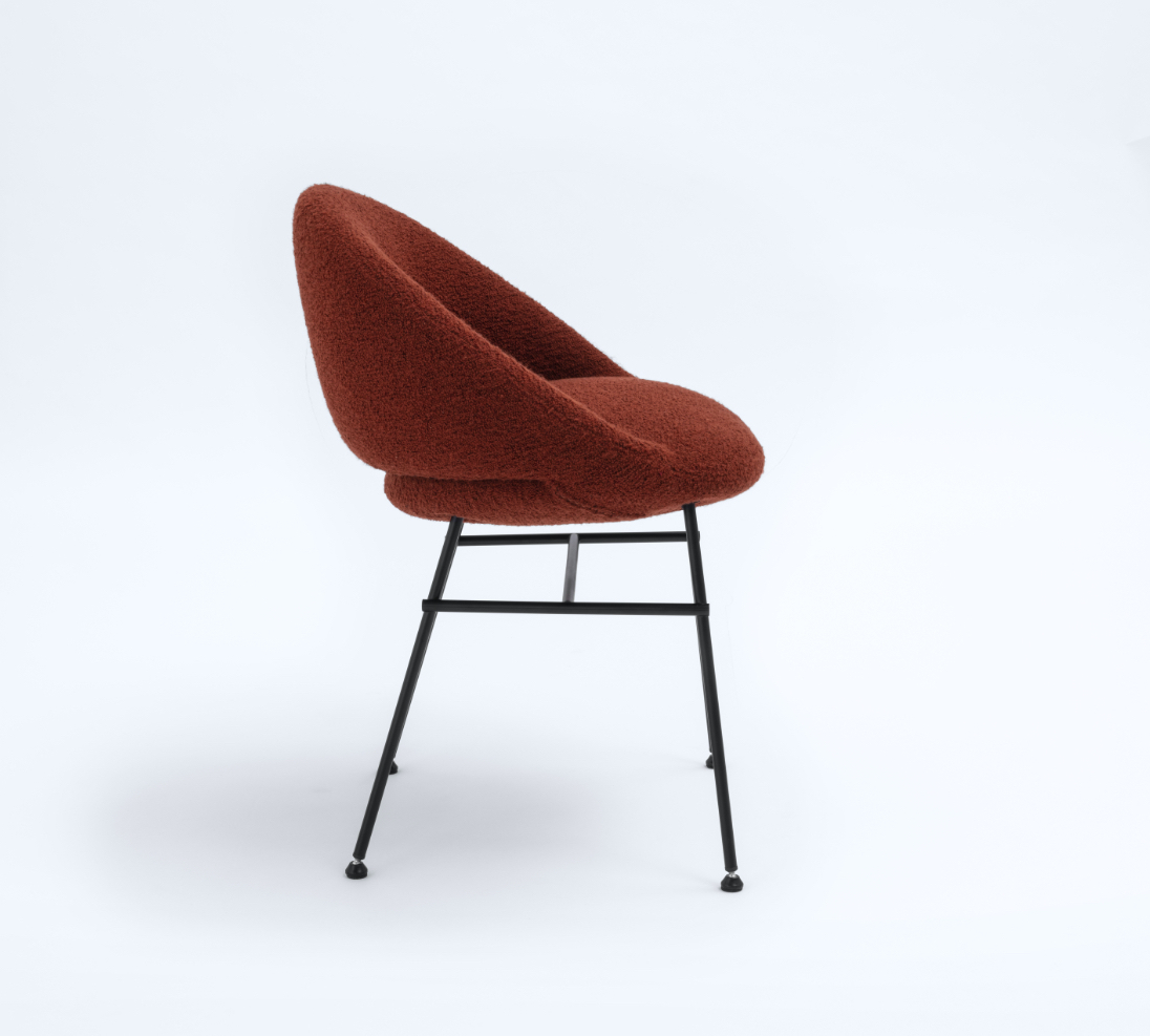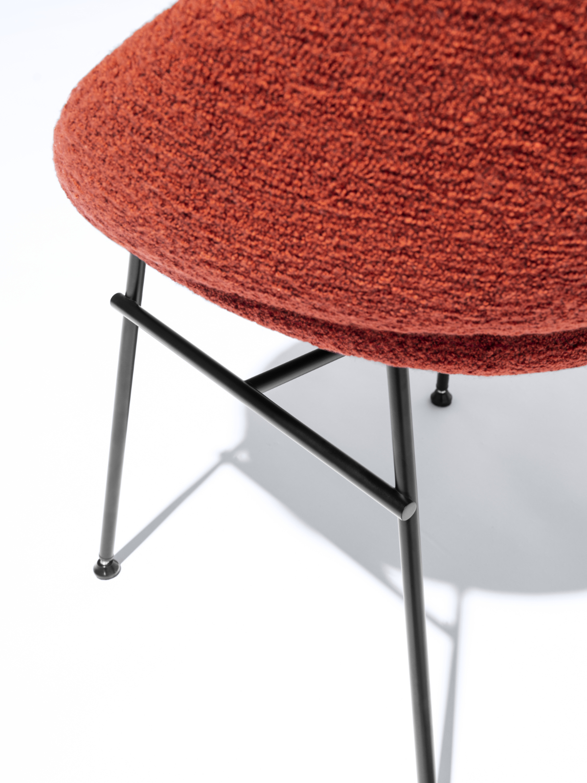 Its elegance and materiality are enhanced by soft textile upholstery, in a carefully chosen palette that lends it personality and character. The soft proportions of this model allow it to fit harmoniously around a table, both in private and public spaces, lending style and comfort.