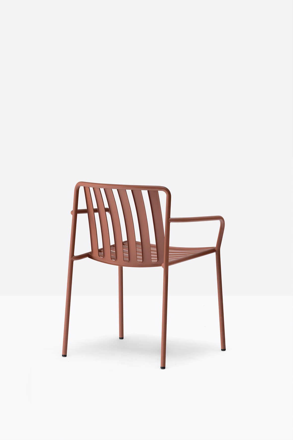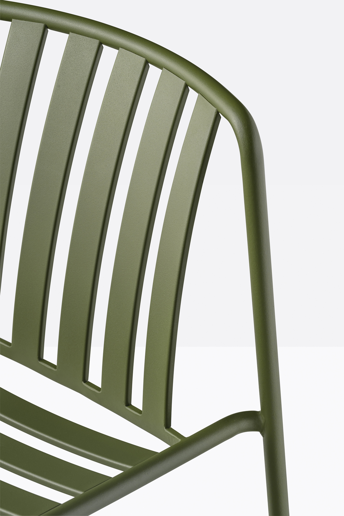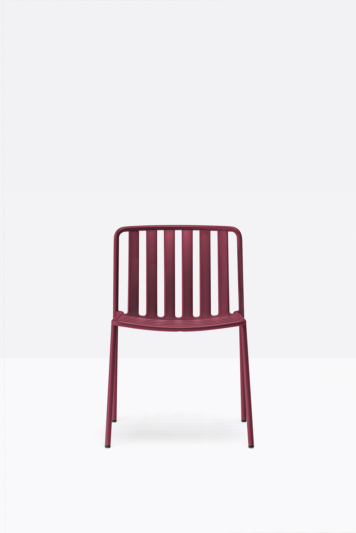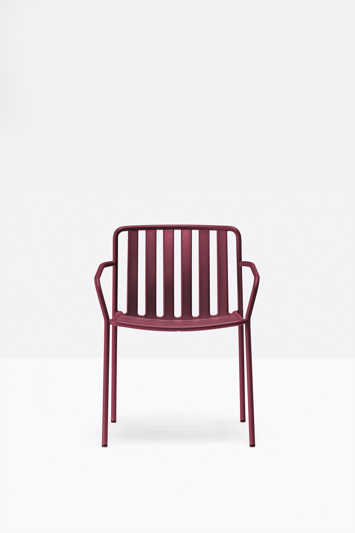 The seat and backrest create a three-dimensional support, ensuring structural solidity and ergonomy. The equally spaced vertical slats of the backrest, moulded and shaped from metal sheet, create a distinctive pattern together with the horizontal ones of the seat.