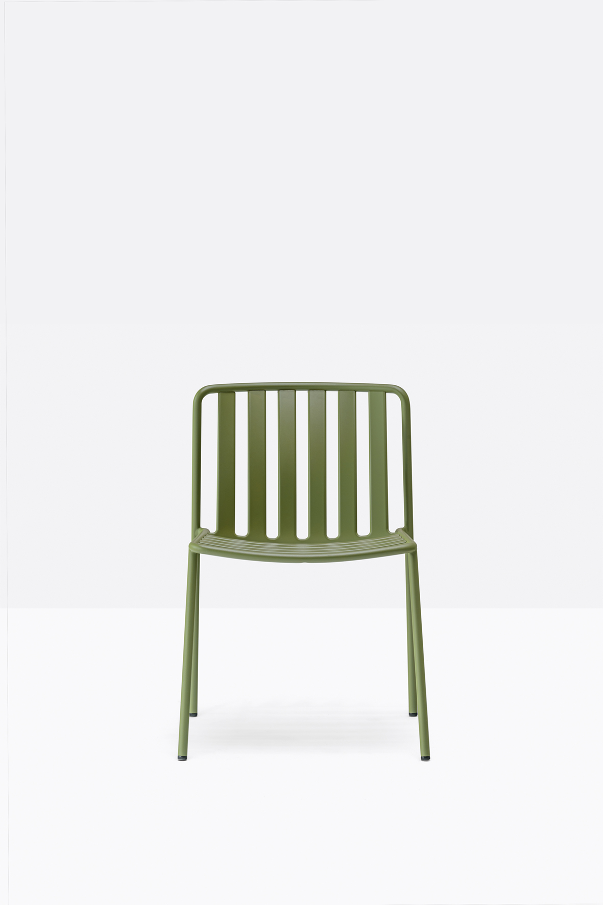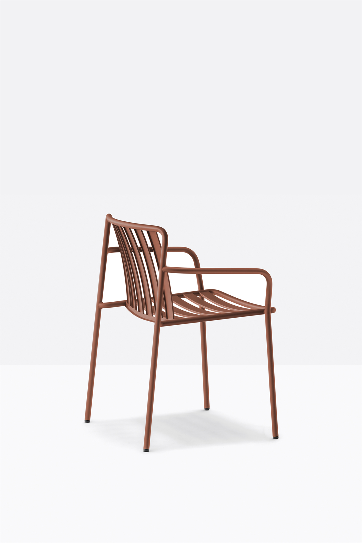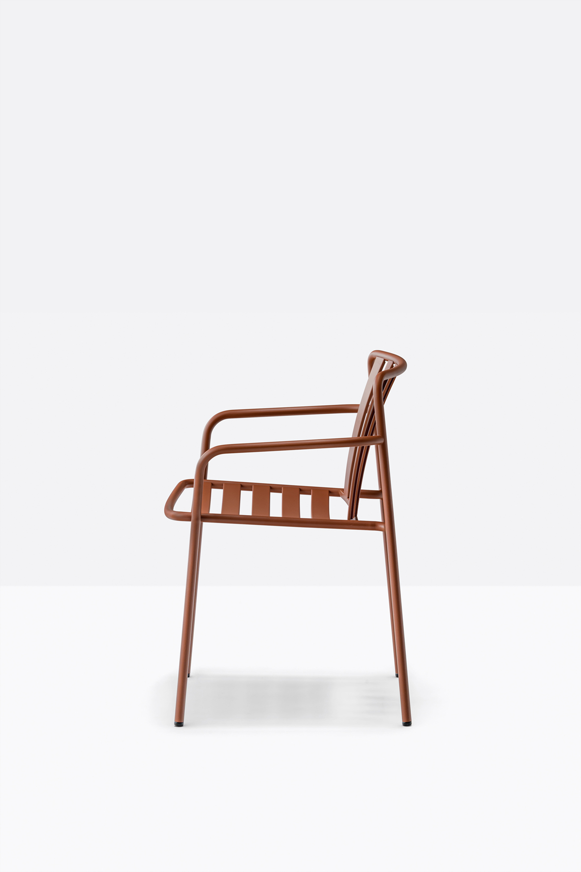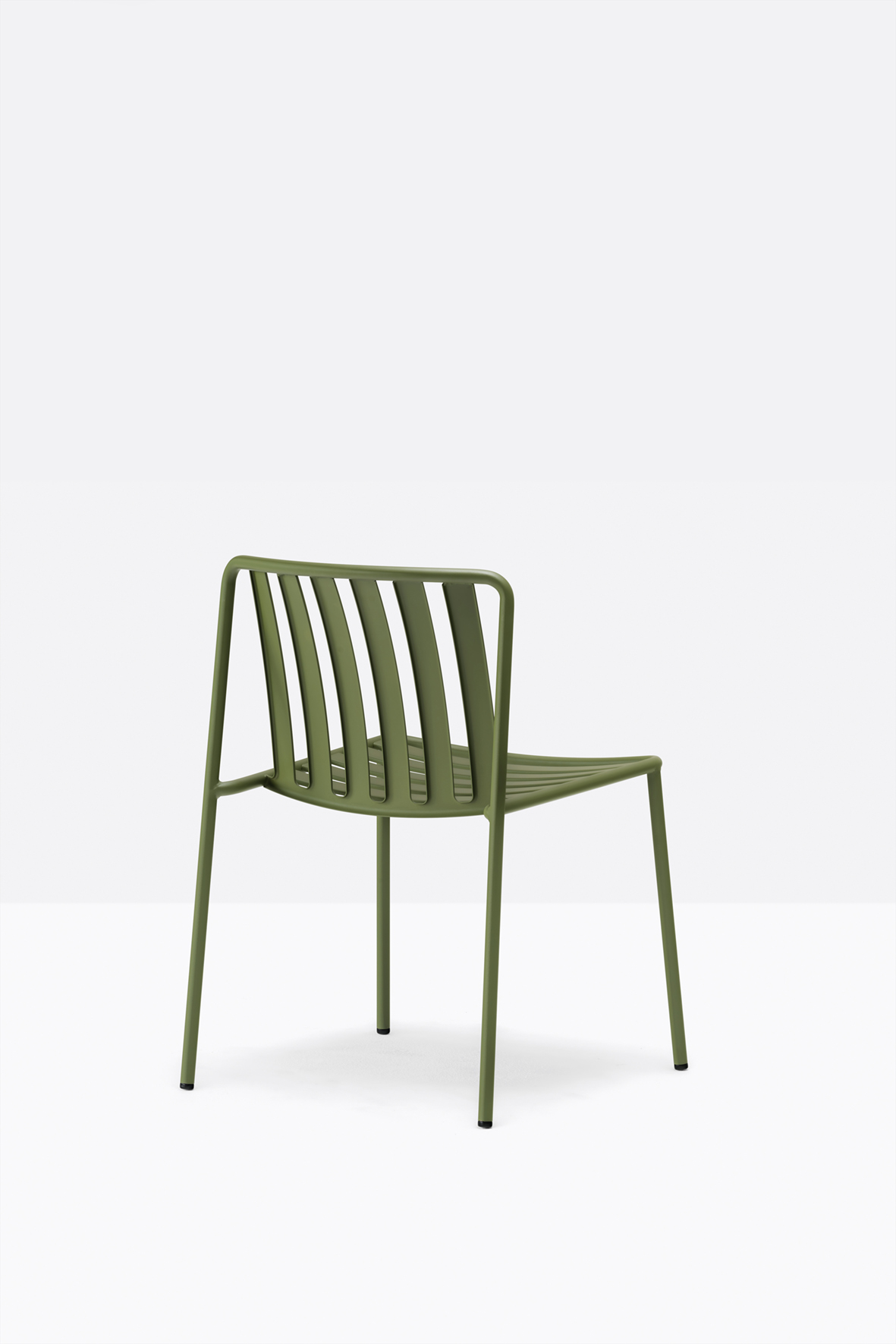 The seat and backrest create a three-dimensional support, ensuring structural solidity and ergonomy. The equally spaced vertical slats of the backrest, moulded and shaped from metal sheet, create a distinctive pattern together with the horizontal ones of the seat.