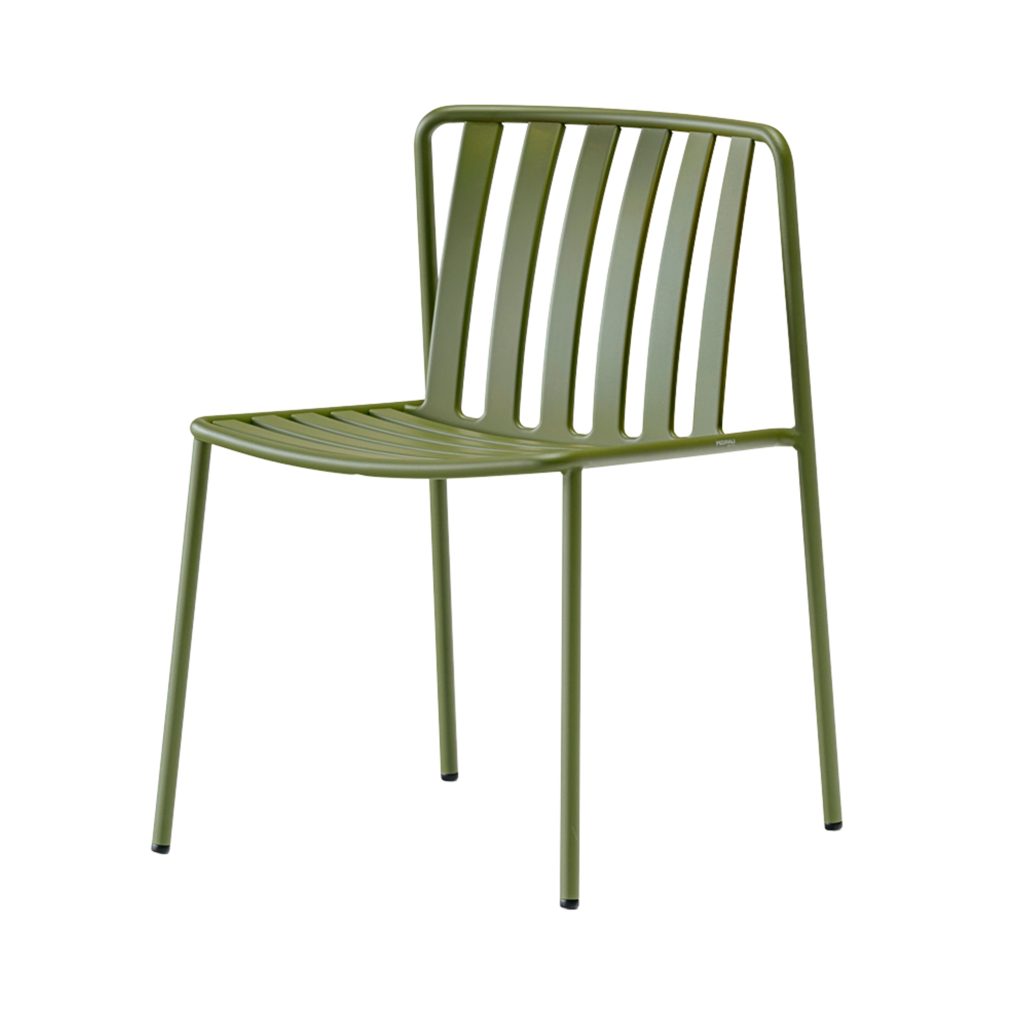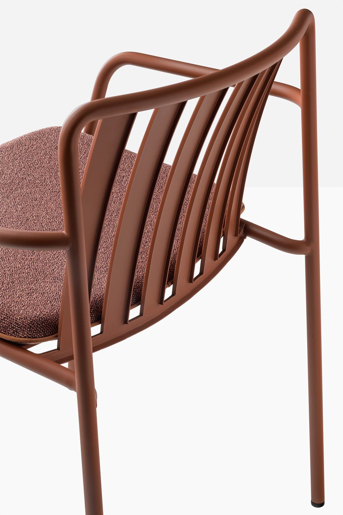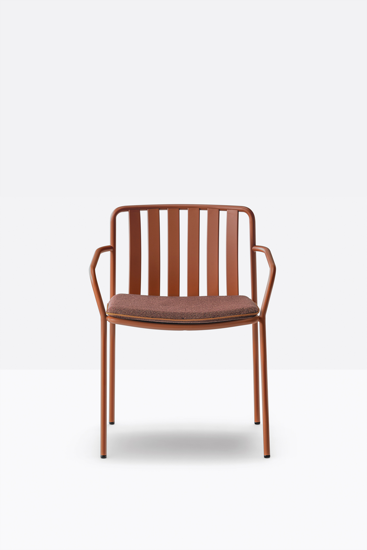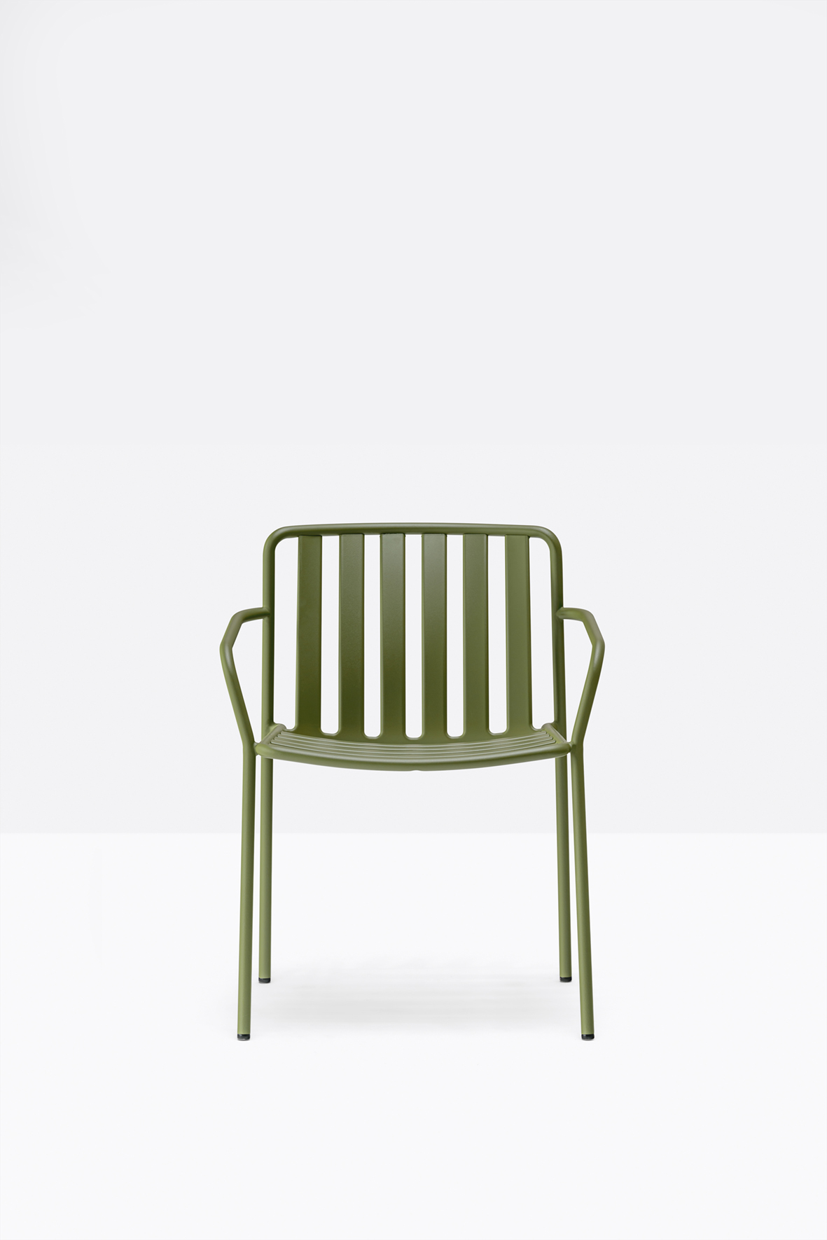 The seat and backrest create a three-dimensional support, ensuring structural solidity and ergonomy. The equally spaced vertical slats of the backrest, moulded and shaped from metal sheet, create a distinctive pattern together with the horizontal ones of the seat.