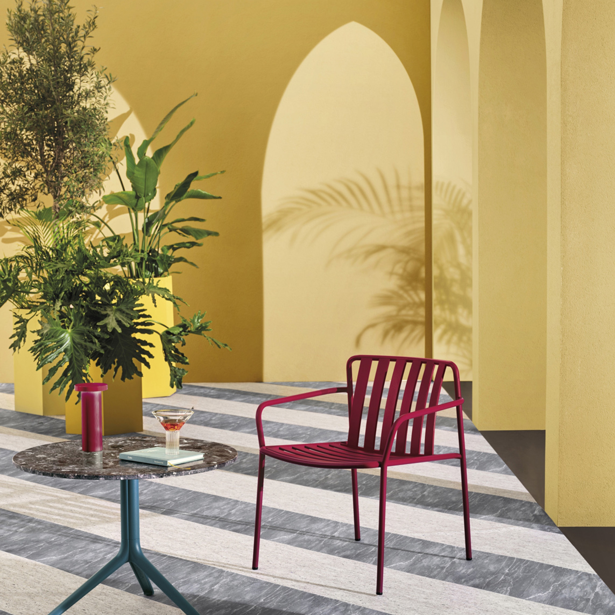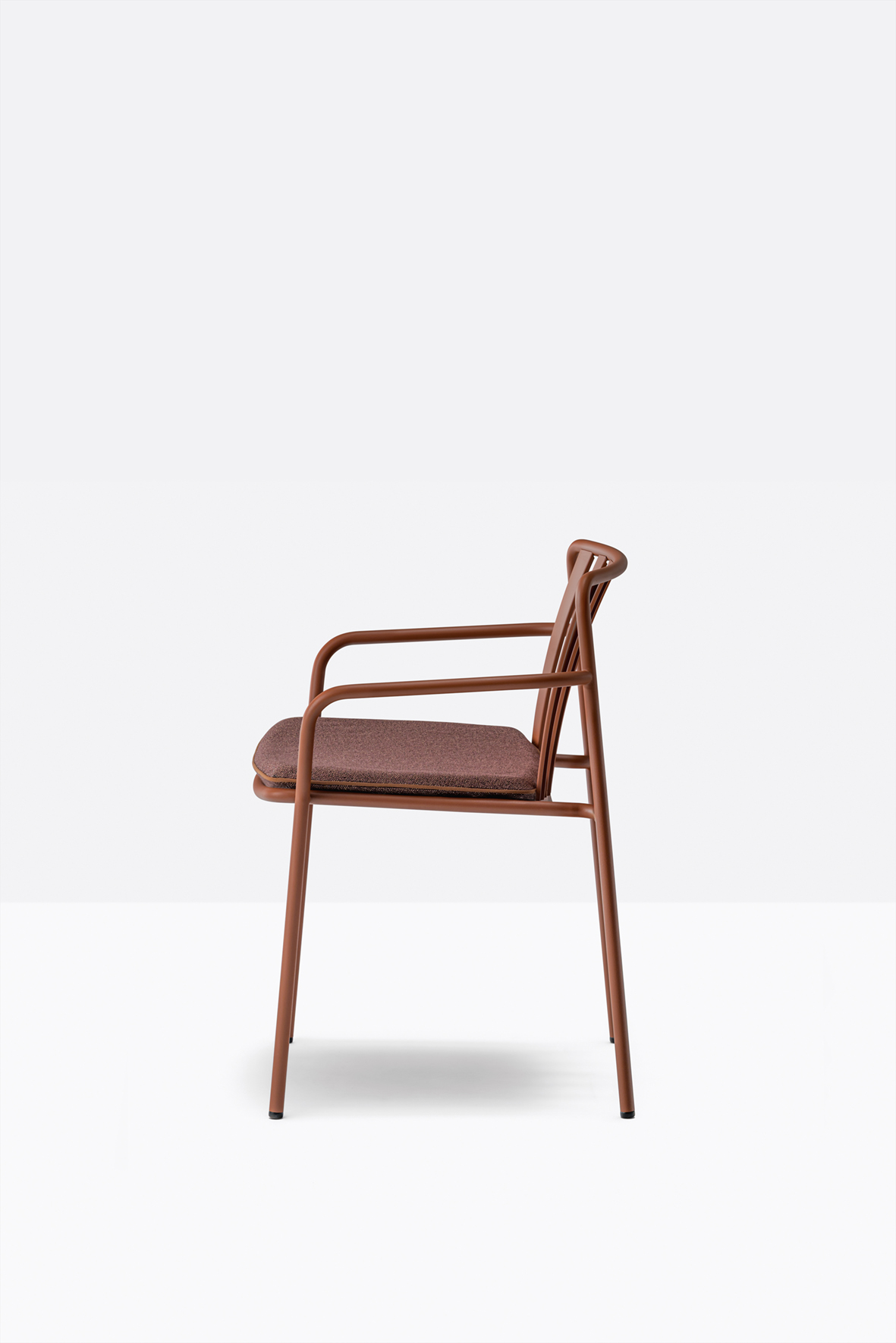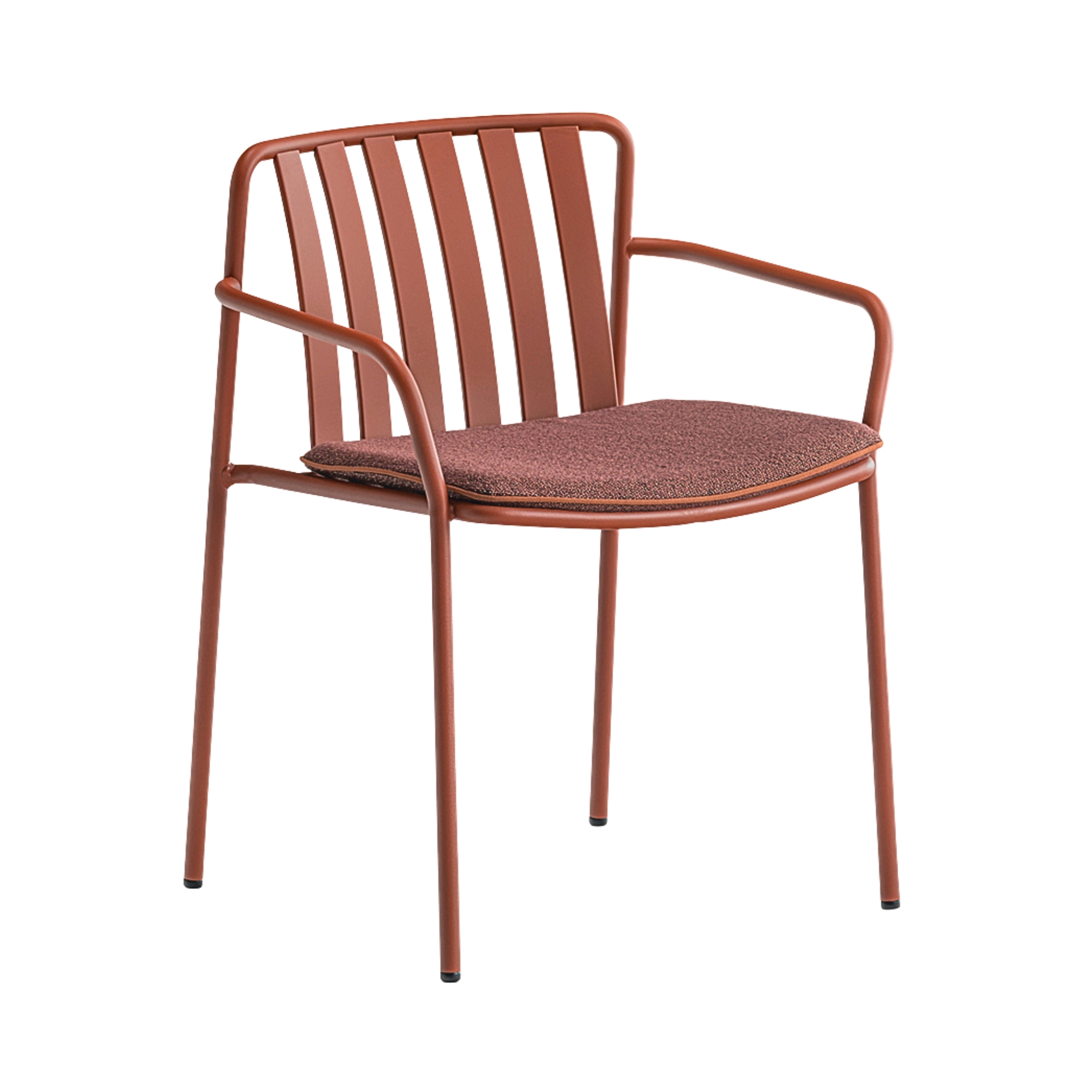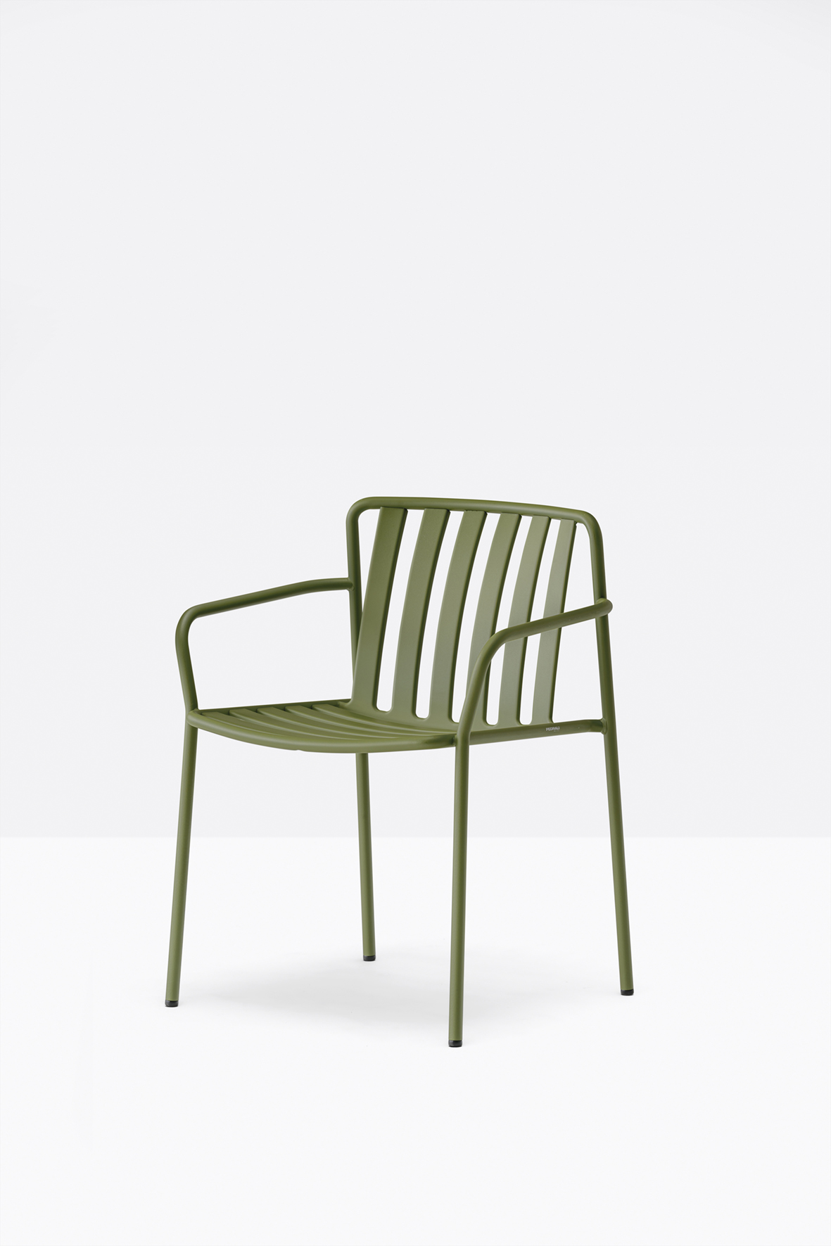 The seat and backrest create a three-dimensional support, ensuring structural solidity and ergonomy. The equally spaced vertical slats of the backrest, moulded and shaped from metal sheet, create a distinctive pattern together with the horizontal ones of the seat.