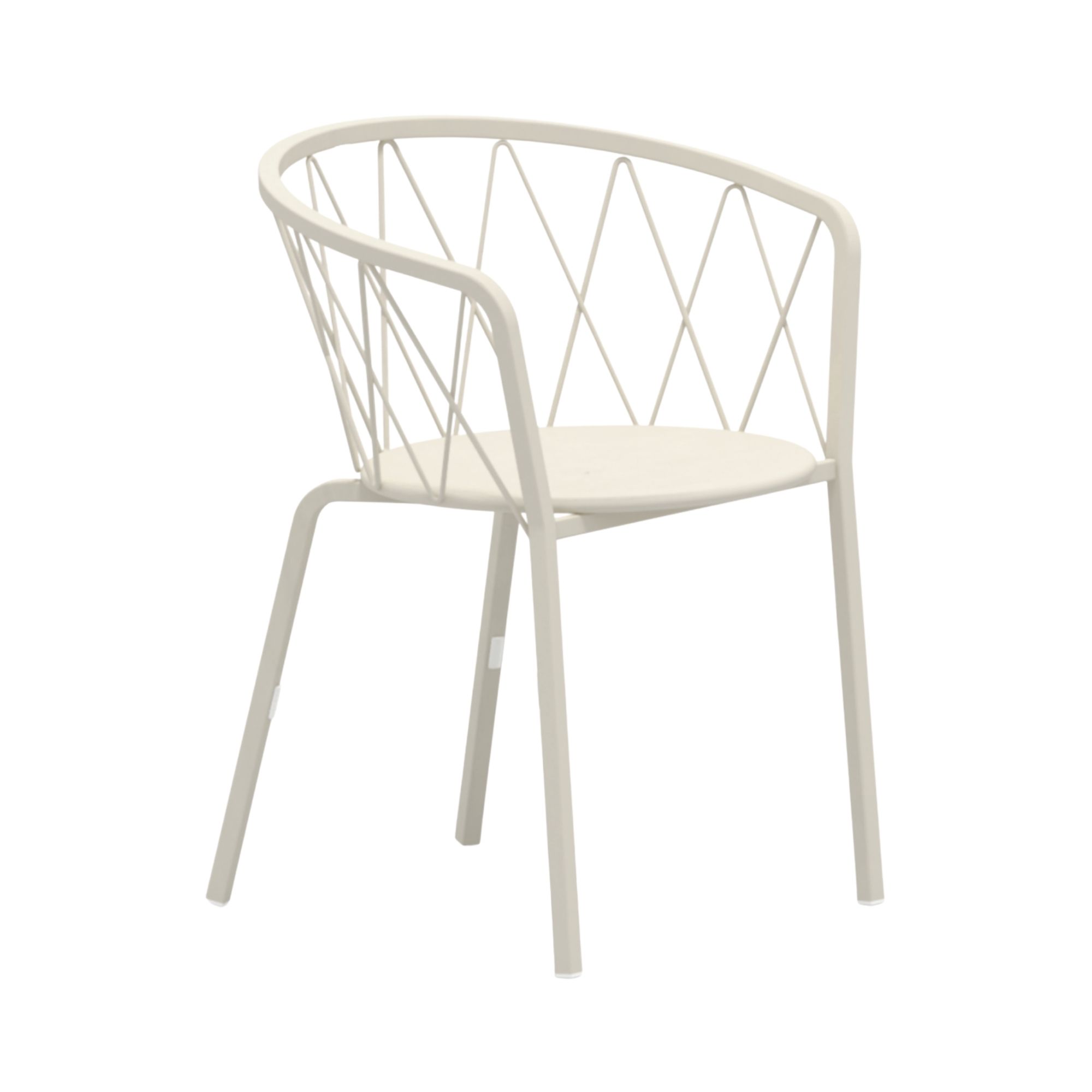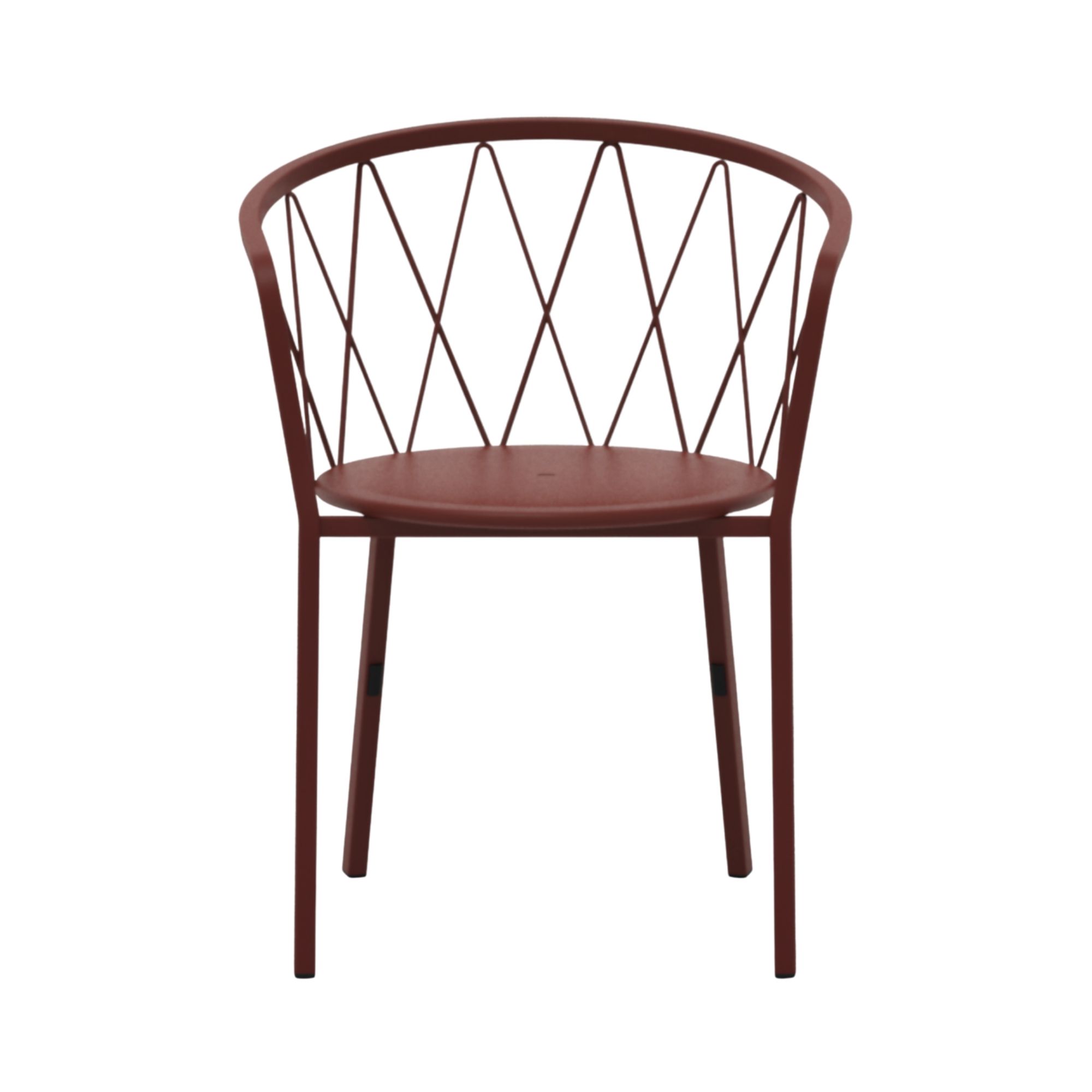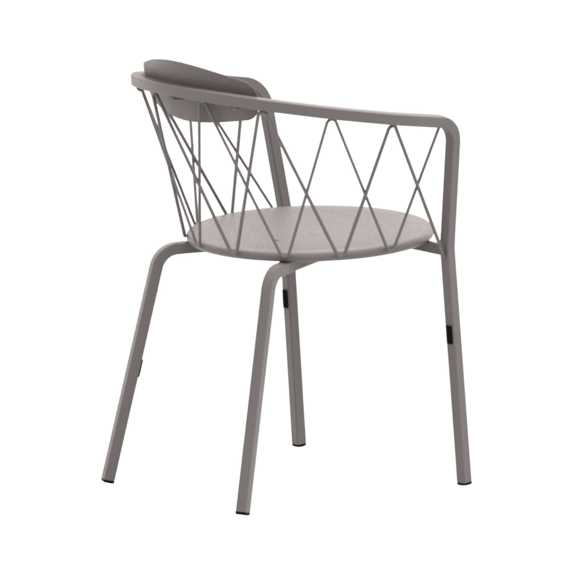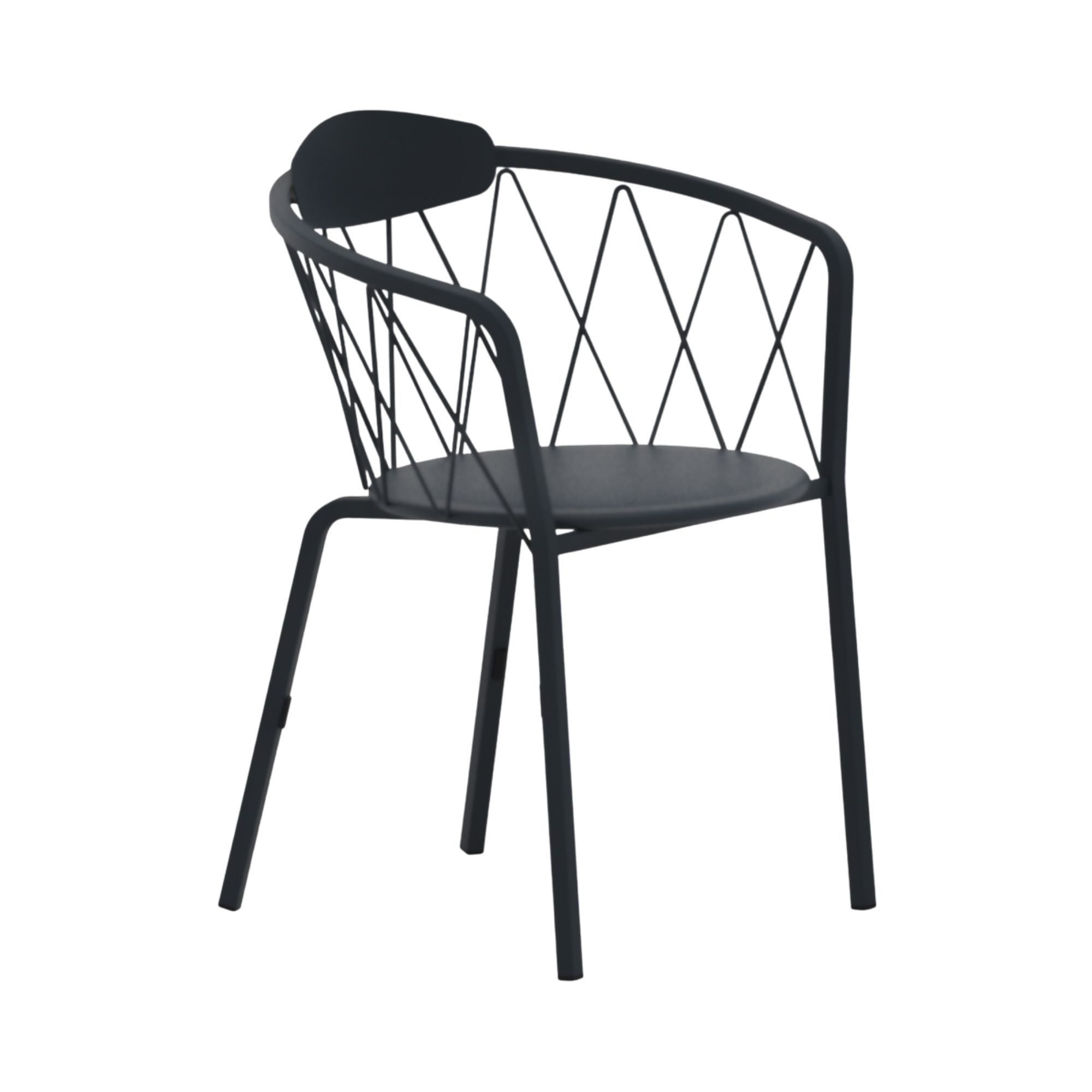 Daisy Armchair by Vermobil features a distinctive geometric backrest that brings a playful yet refined charm to outdoor spaces. Crafted from durable metal and designed for stack ability, this chair combines elegance with practicality, perfect for both residential and hospitality settings.
