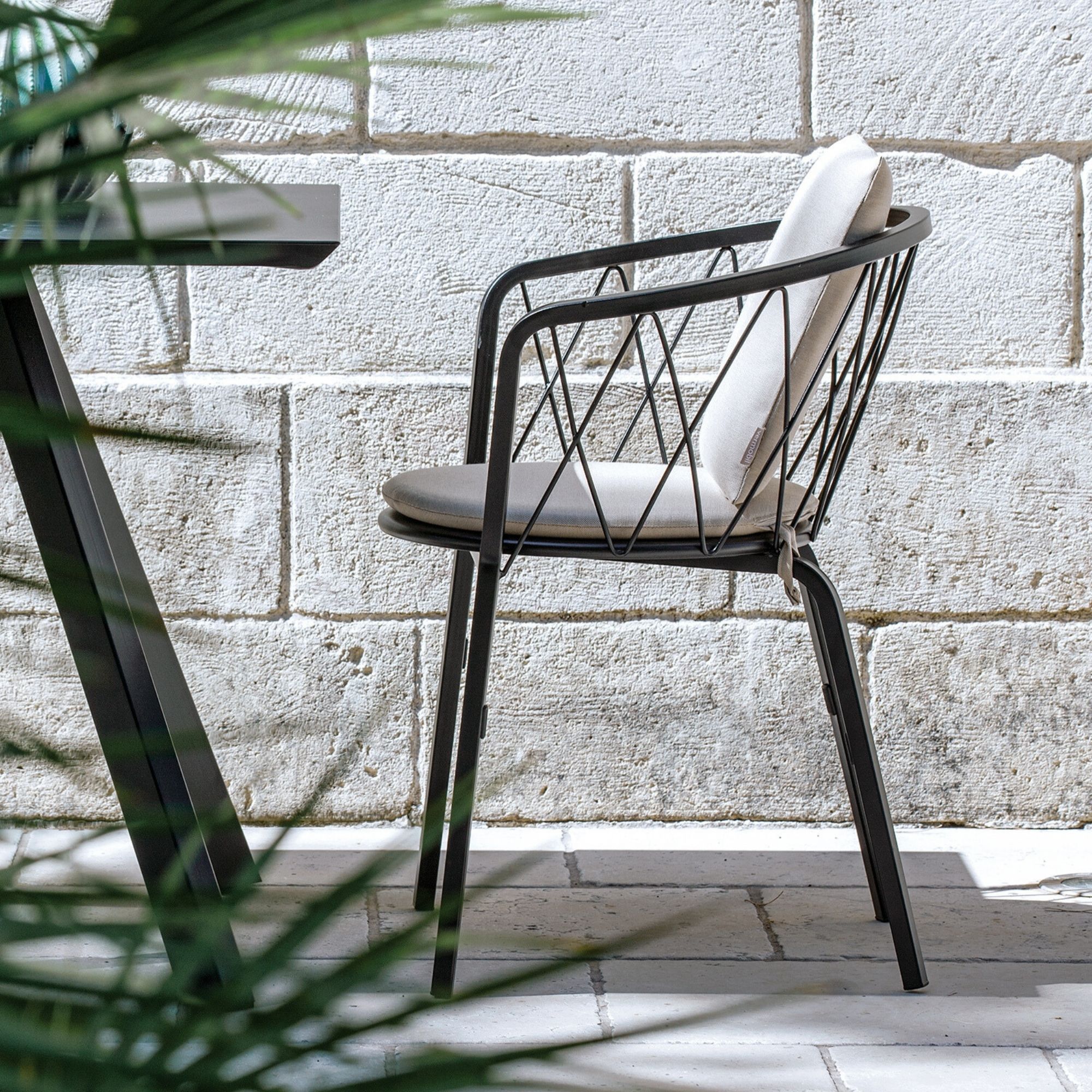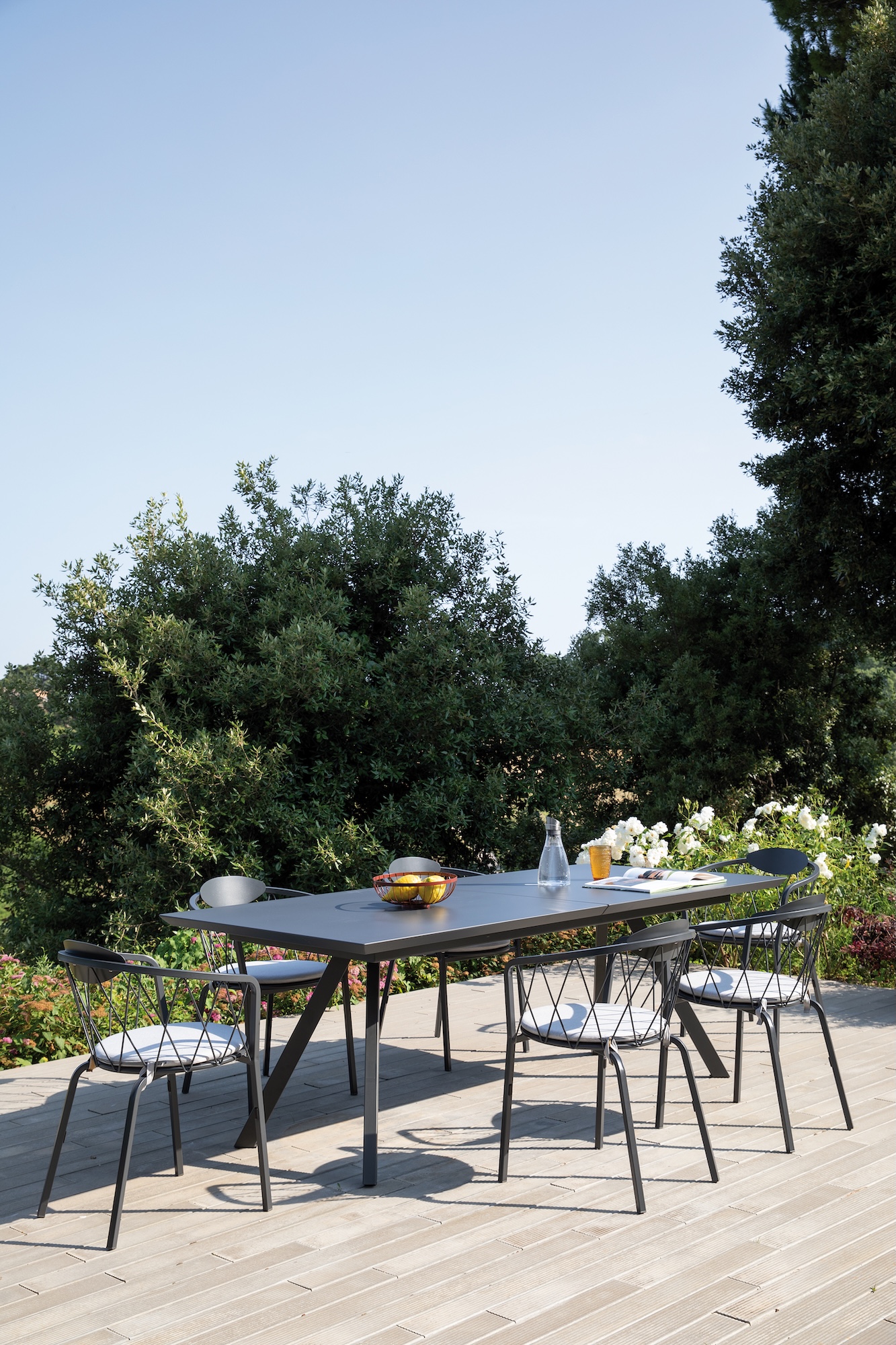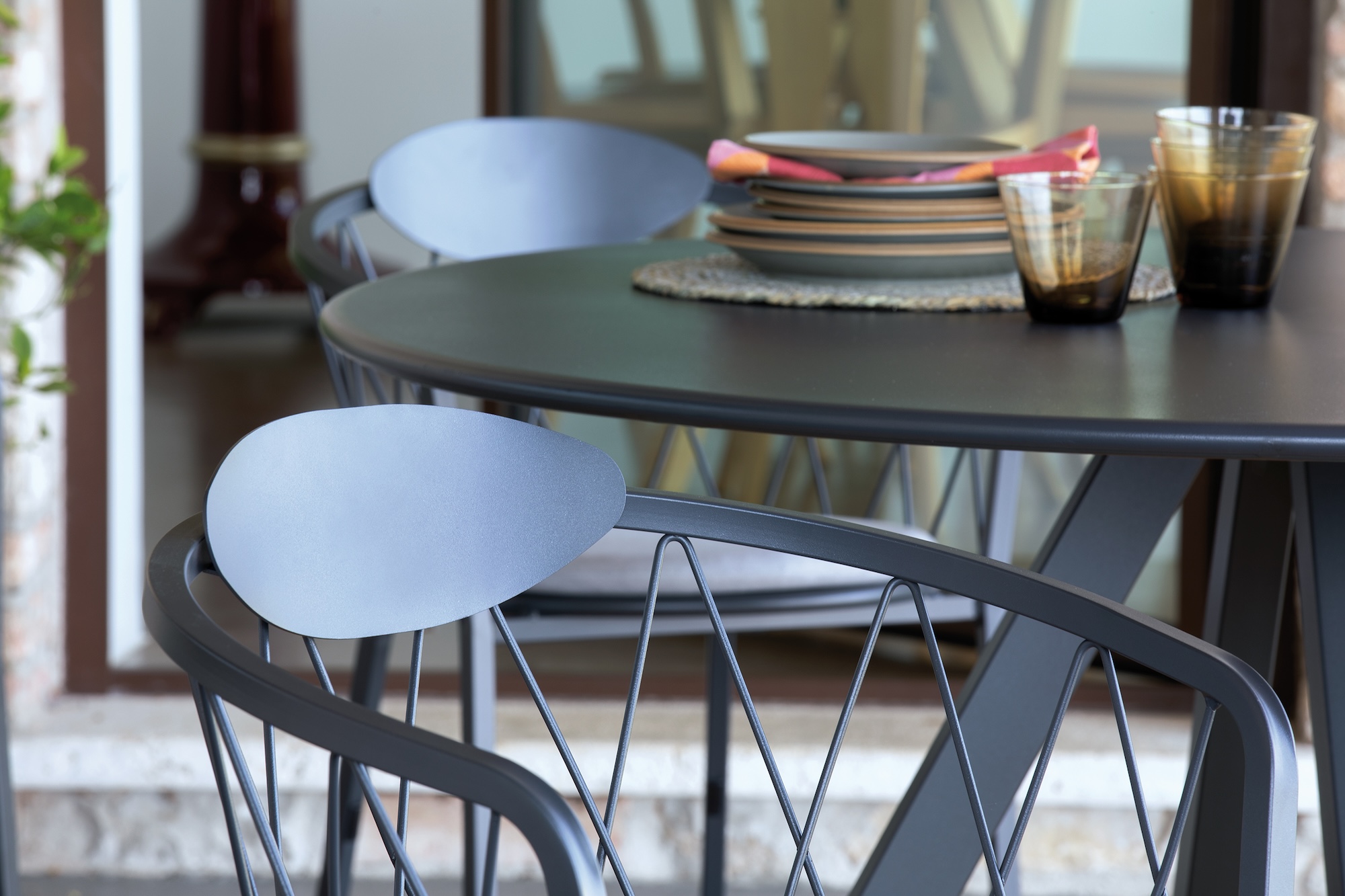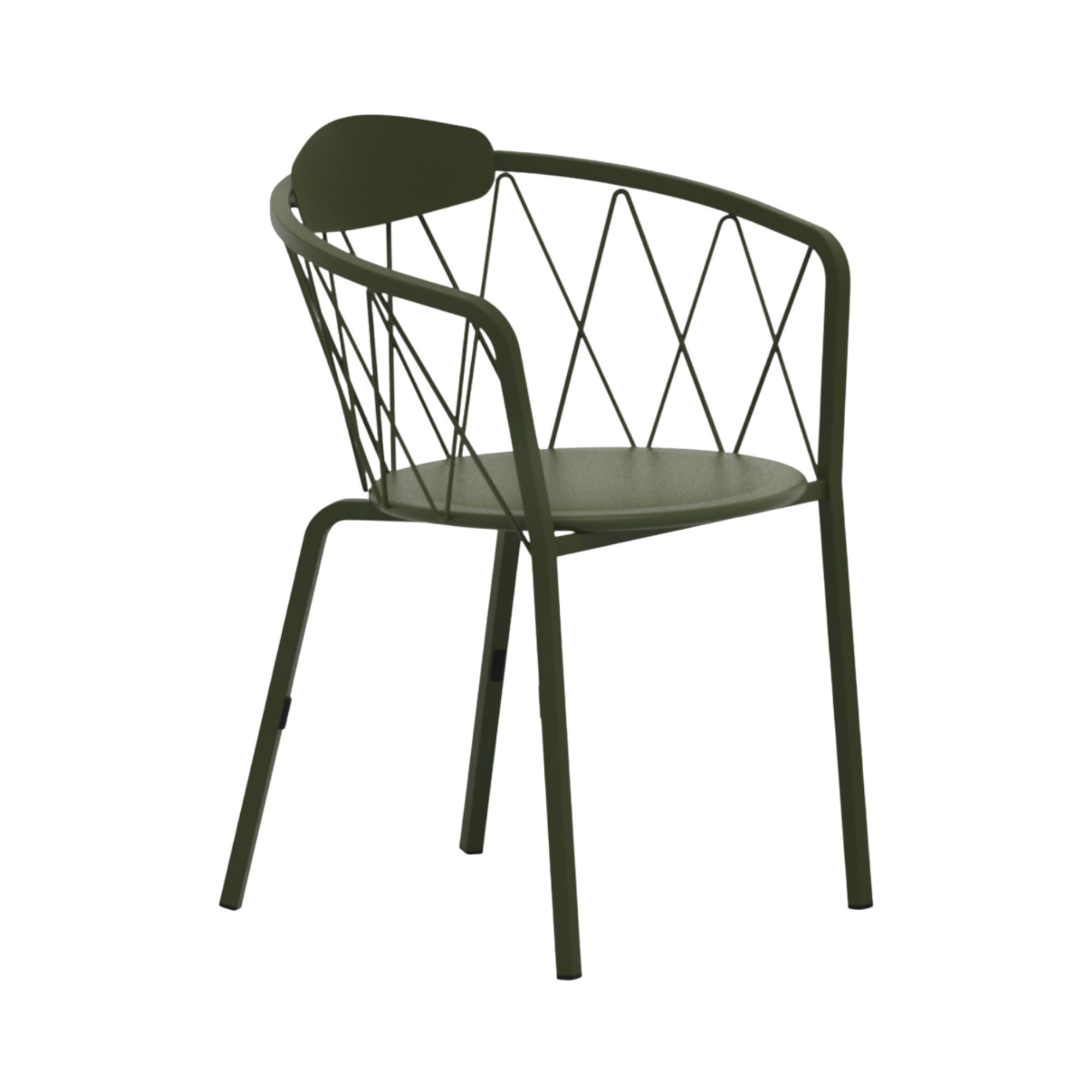 Daisy Armchair by Vermobil features a distinctive geometric backrest that brings a playful yet refined charm to outdoor spaces. Crafted from durable metal and designed for stack ability, this chair combines elegance with practicality, perfect for both residential and hospitality settings.