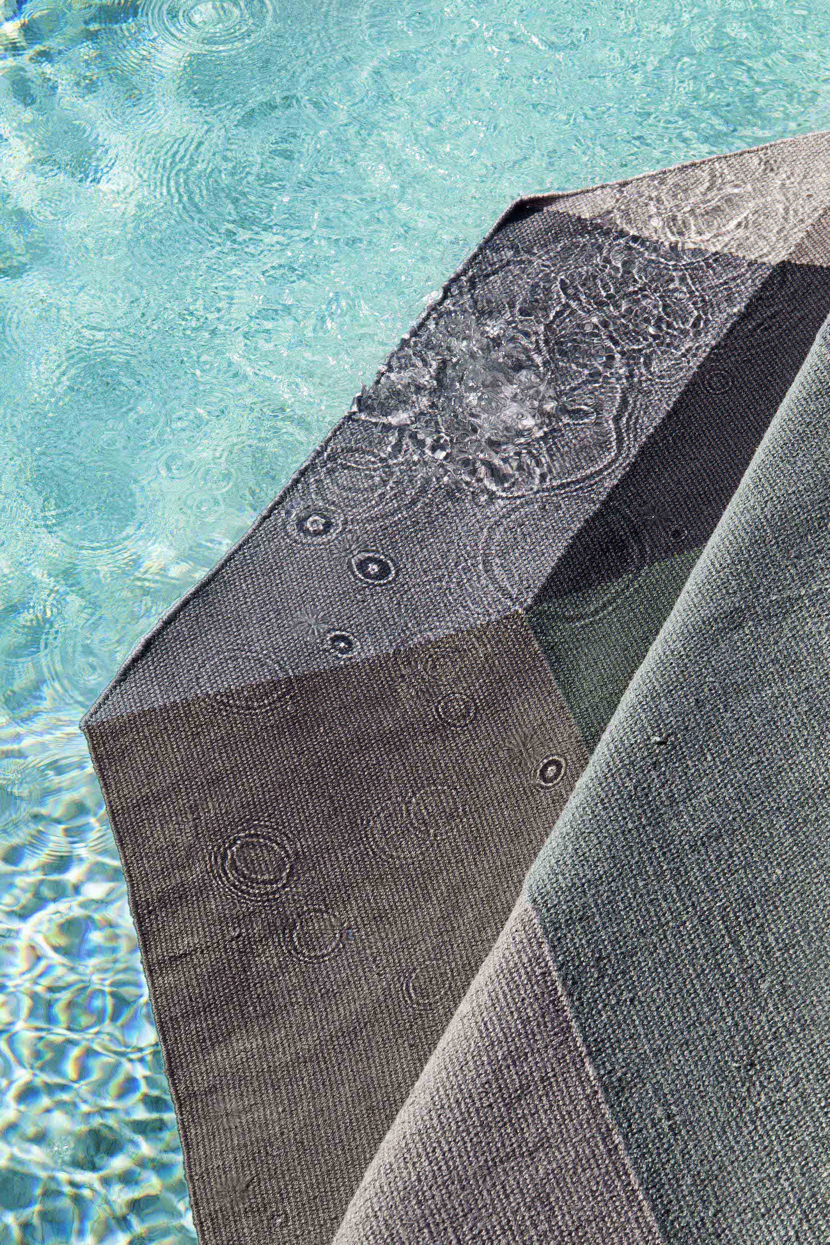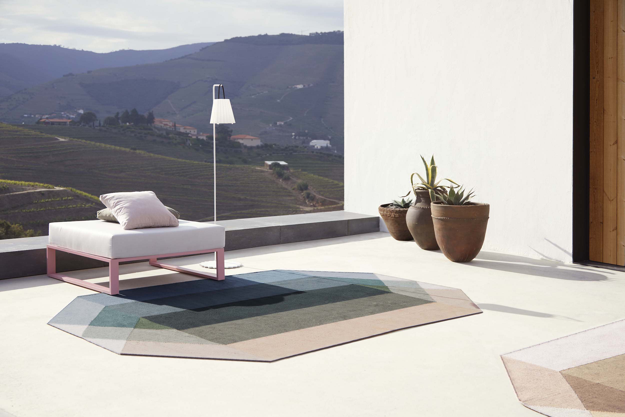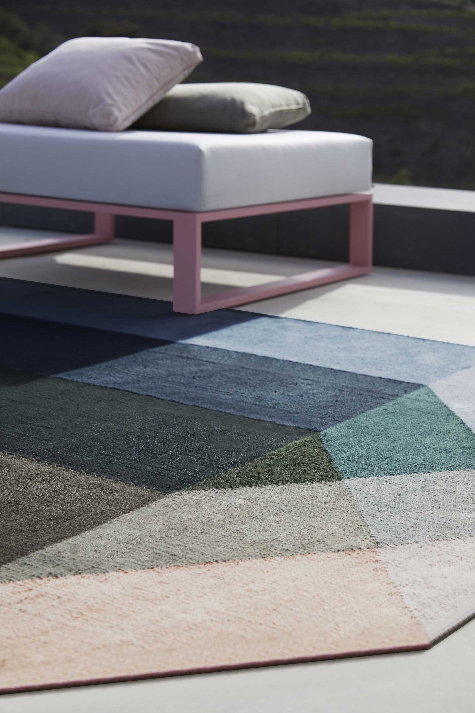 Diamond Outdoors by GAN Rugs displays a multifaceted coloured diamond, obtained by superimposing different translucent geometric figures.