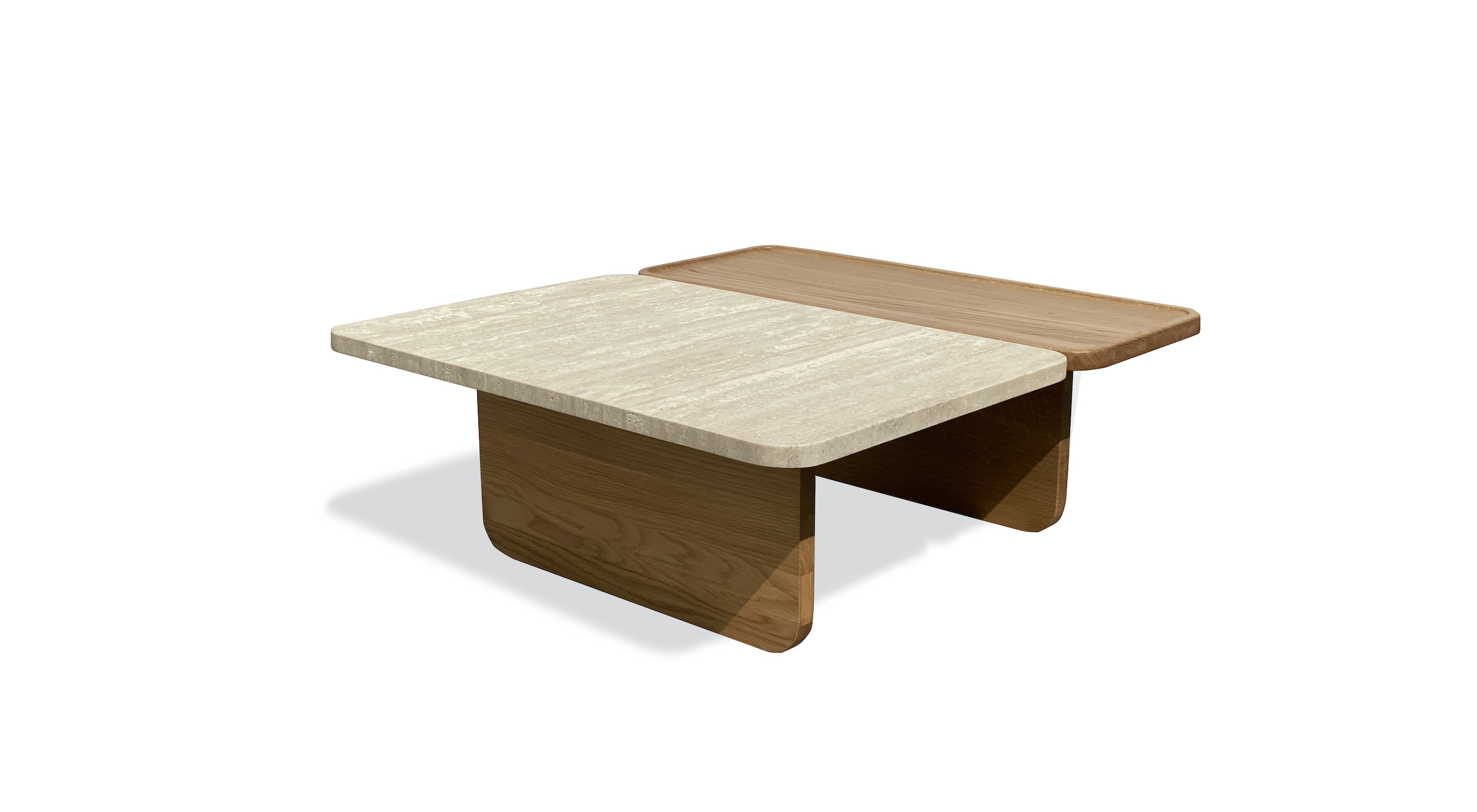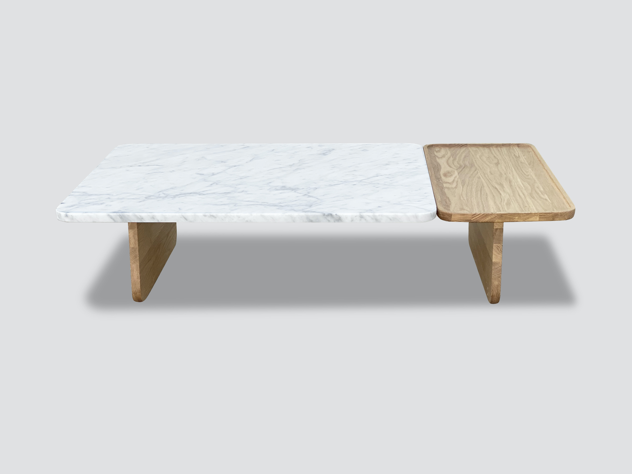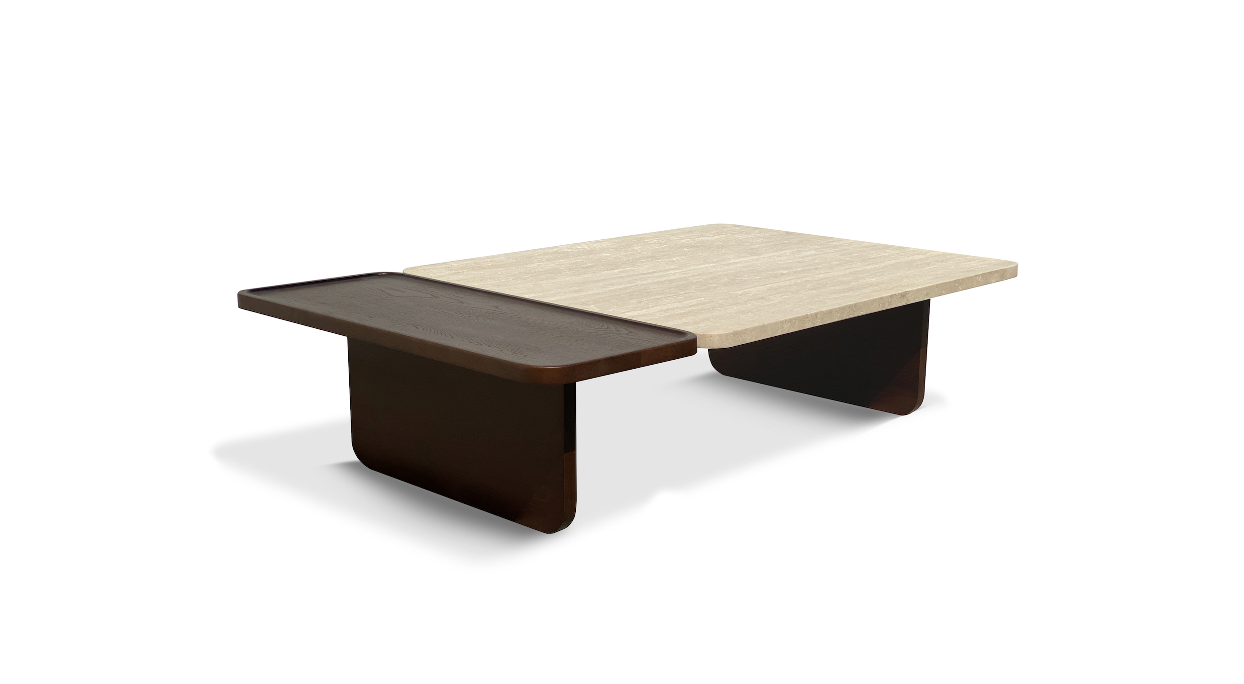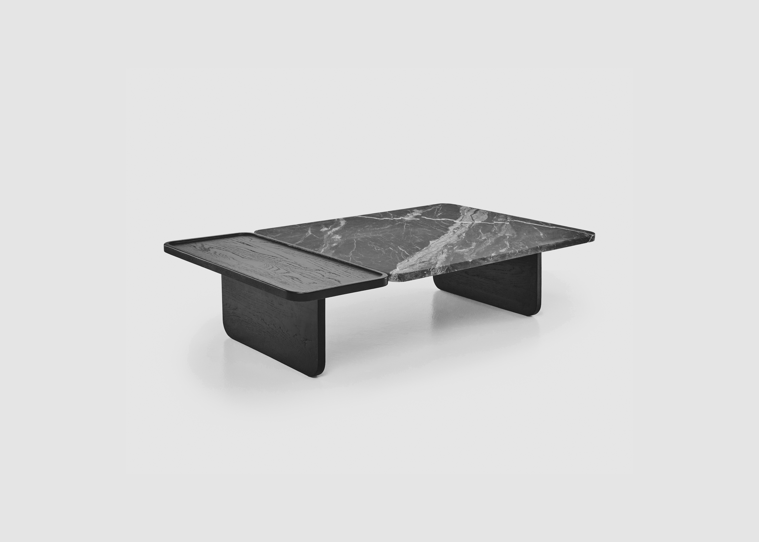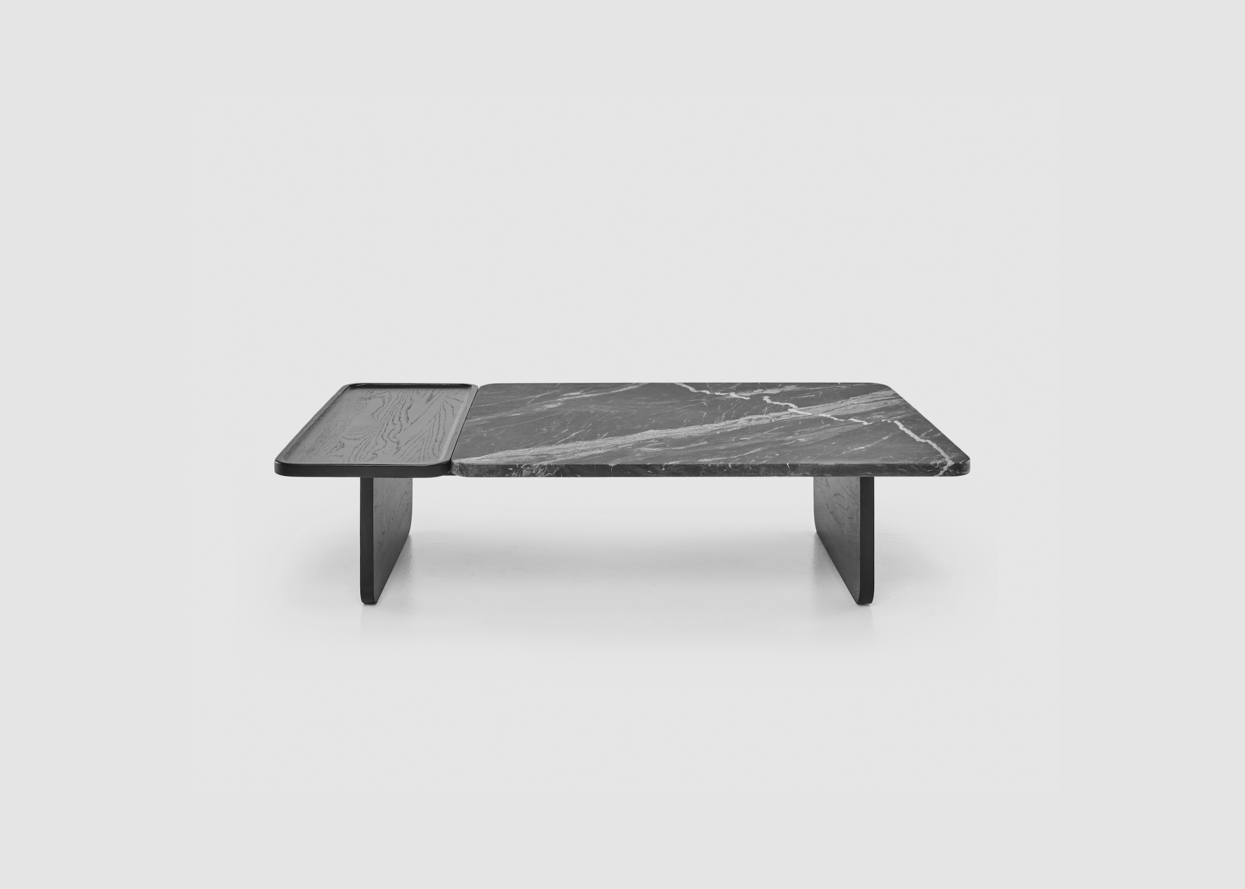Duo coffee table marble by Natadora is part of a family of coffee tables that combines not only two different materials but also two areas for different purposes.