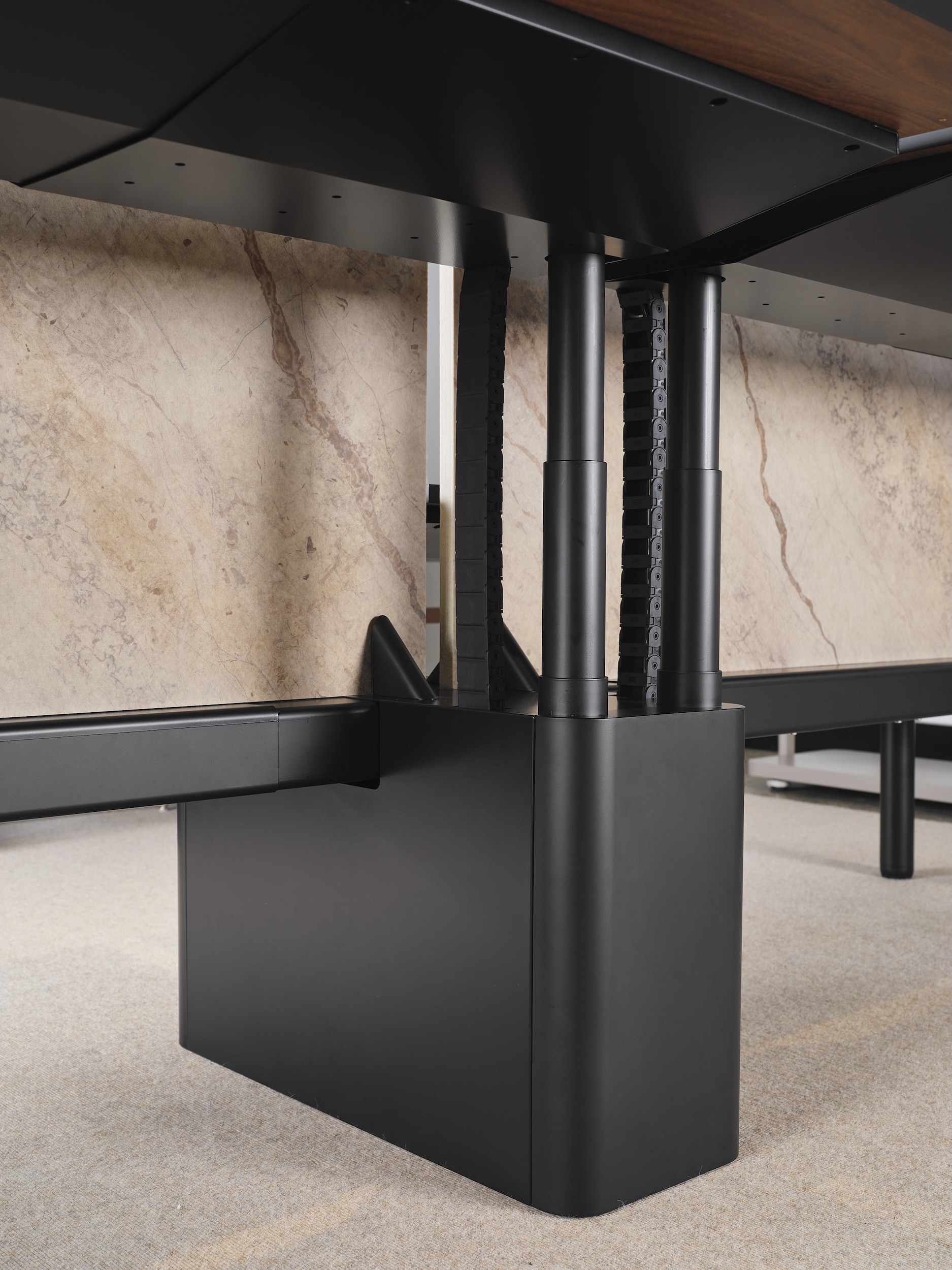 With smarter integration, Duo Too conceals complexity with hidden cable management, retractable umbilicals, and removable access covers, ensuring every workstation remains neat, managed, and easy to service. The undercarriage is designed for quick installation and effortless access, allowing wiring and adjustments to be completed without removing the worktop.