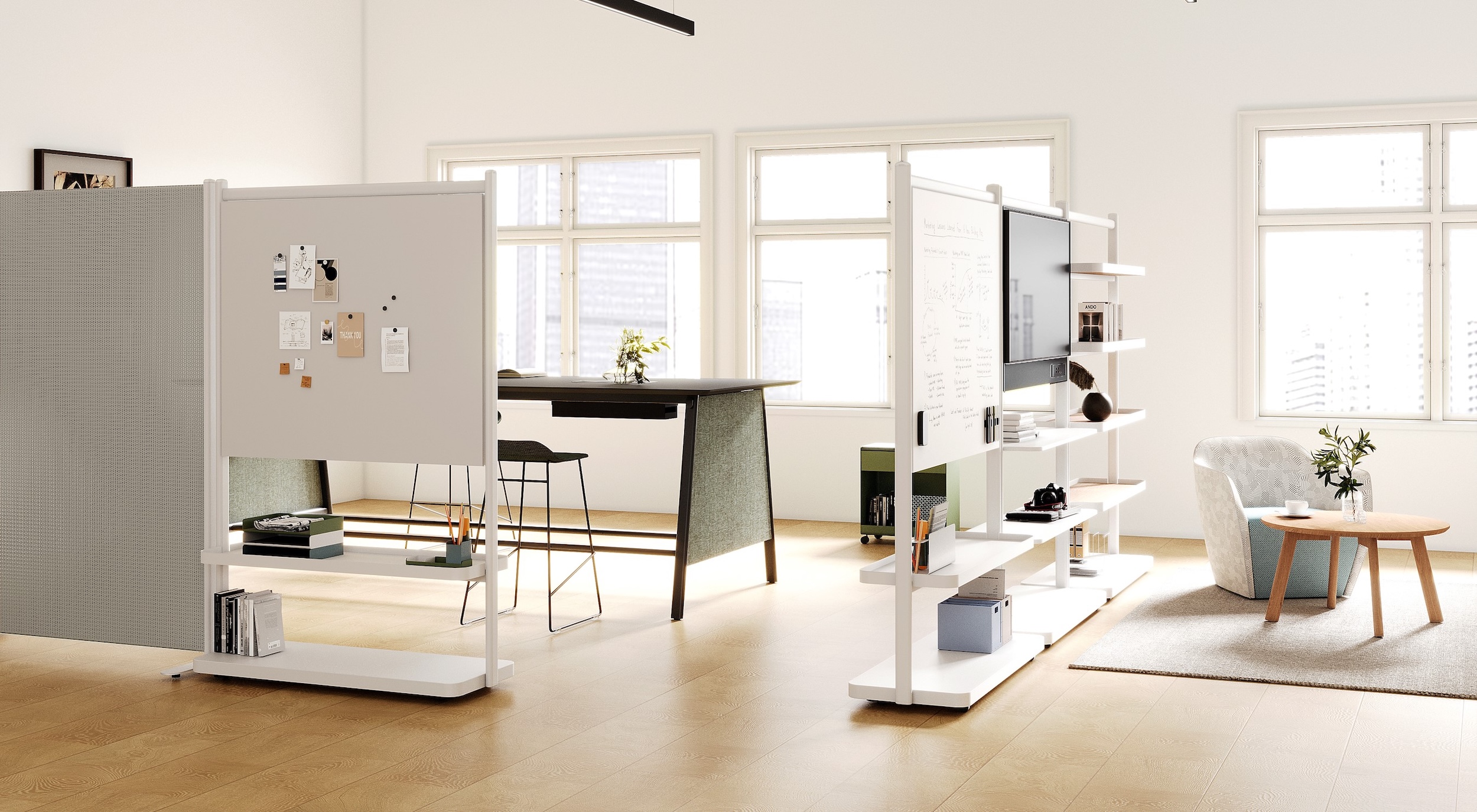 Exhi Whiteboard by Innerspace provides mobile zoning with its ability to delineate office spaces providing both vertical and horizontal storage solutions.