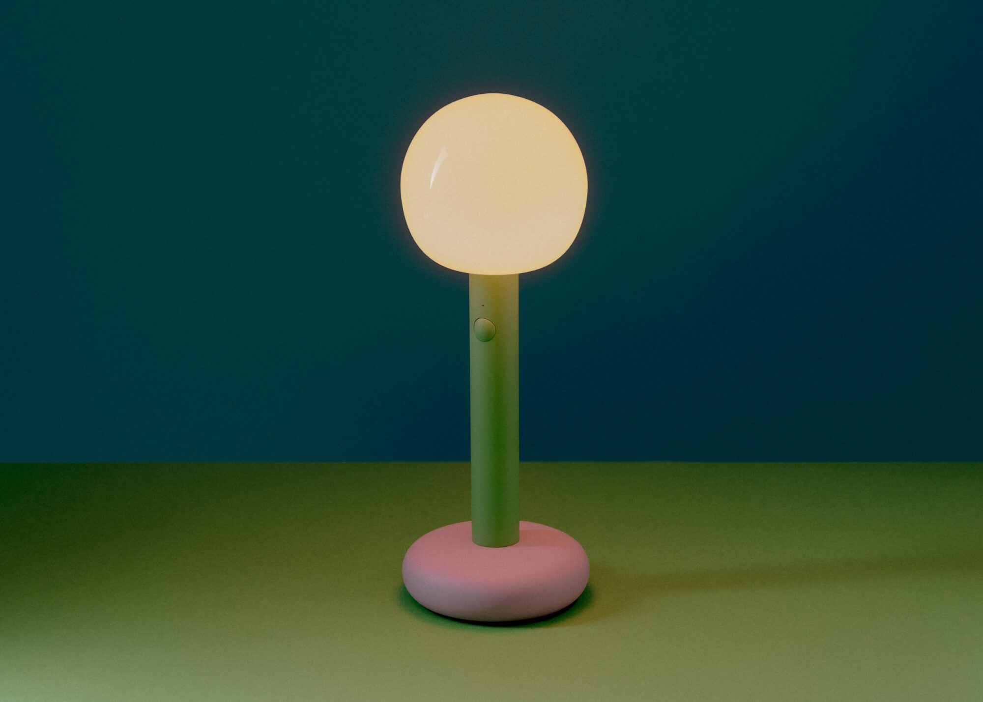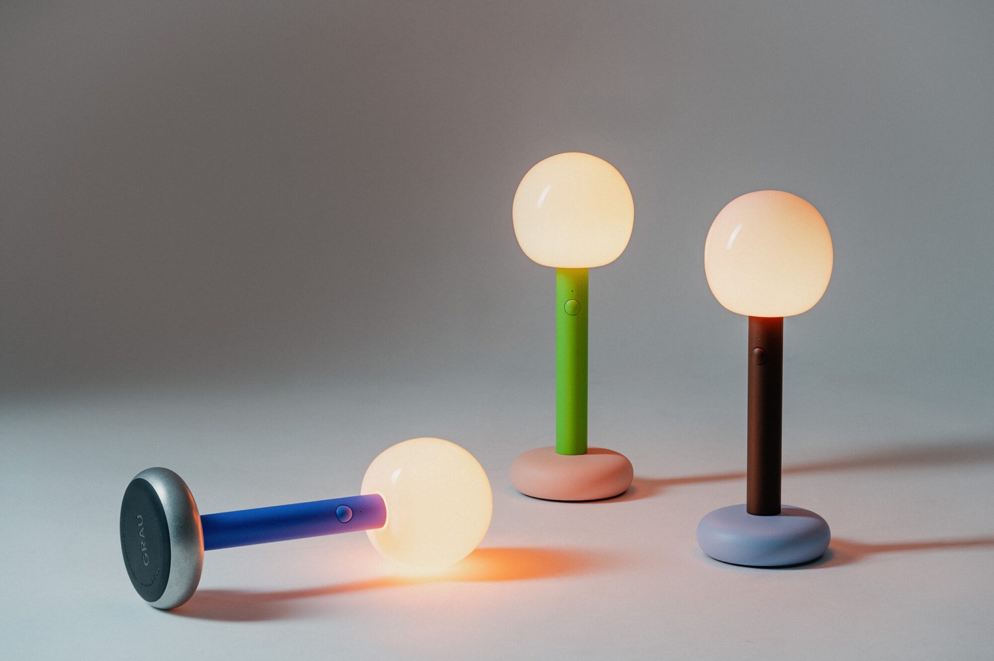 The Fire Portable lamp by GRAU, made of aluminum and hand-blown glass, brings a warm atmosphere to the living room, dining room and bedside. Vibes gently set the light in motion. They bring poetry into the room, like a candle or a fireplace. Dim the light in intensity and color. Activate the 30-minute sleep timer with a double-click.