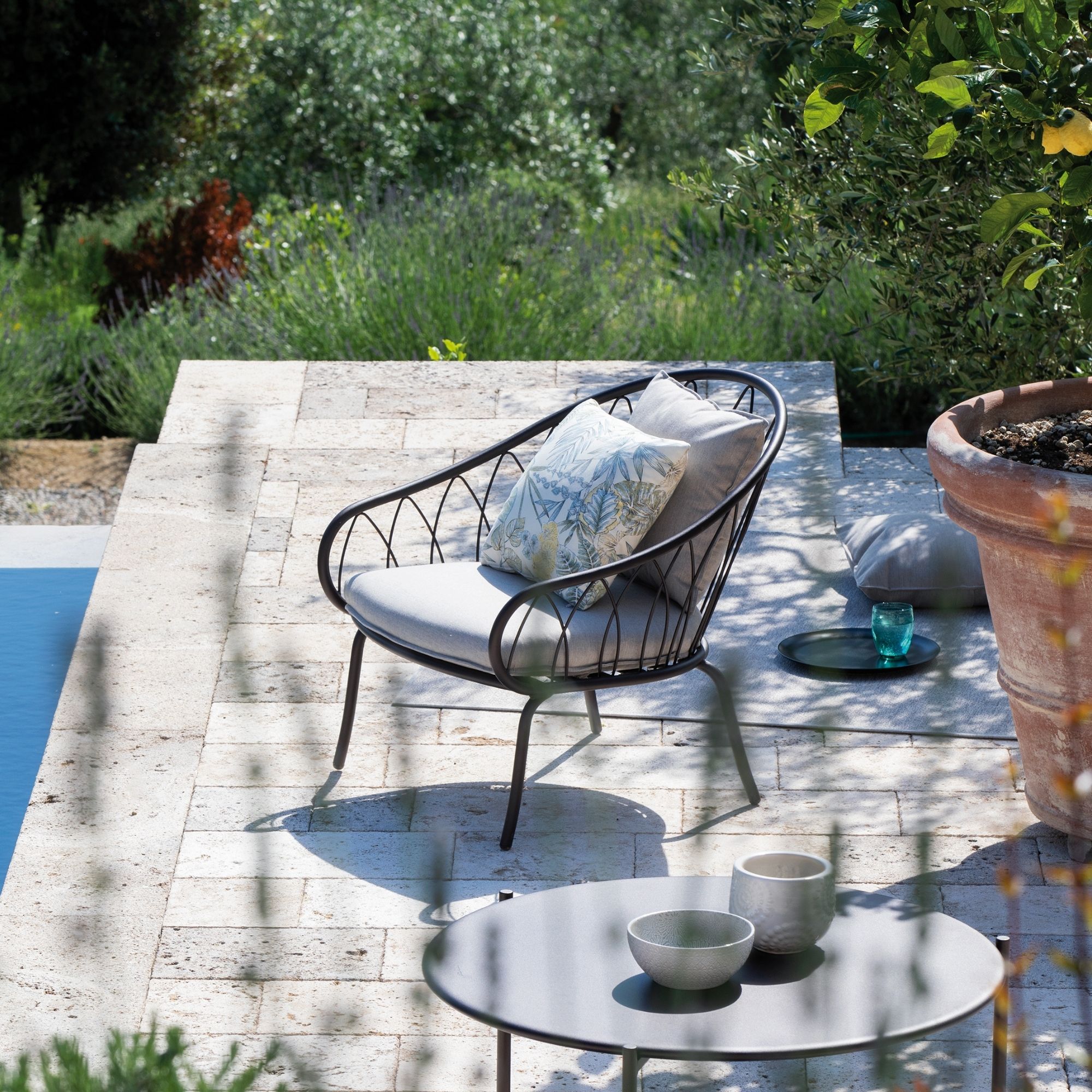 Flora Lounge Chair by Vermobil brings sculptural elegance and comfort to outdoor relaxation. Its petal-inspired frame in metal is paired with a removable seat cushion, offering a refined balance between artistry and functionality. With its soft curves and enveloping shape, Flora transforms patios, terraces, and garden spaces into serene retreats defined by Italian craftsmanship and contemporary design.