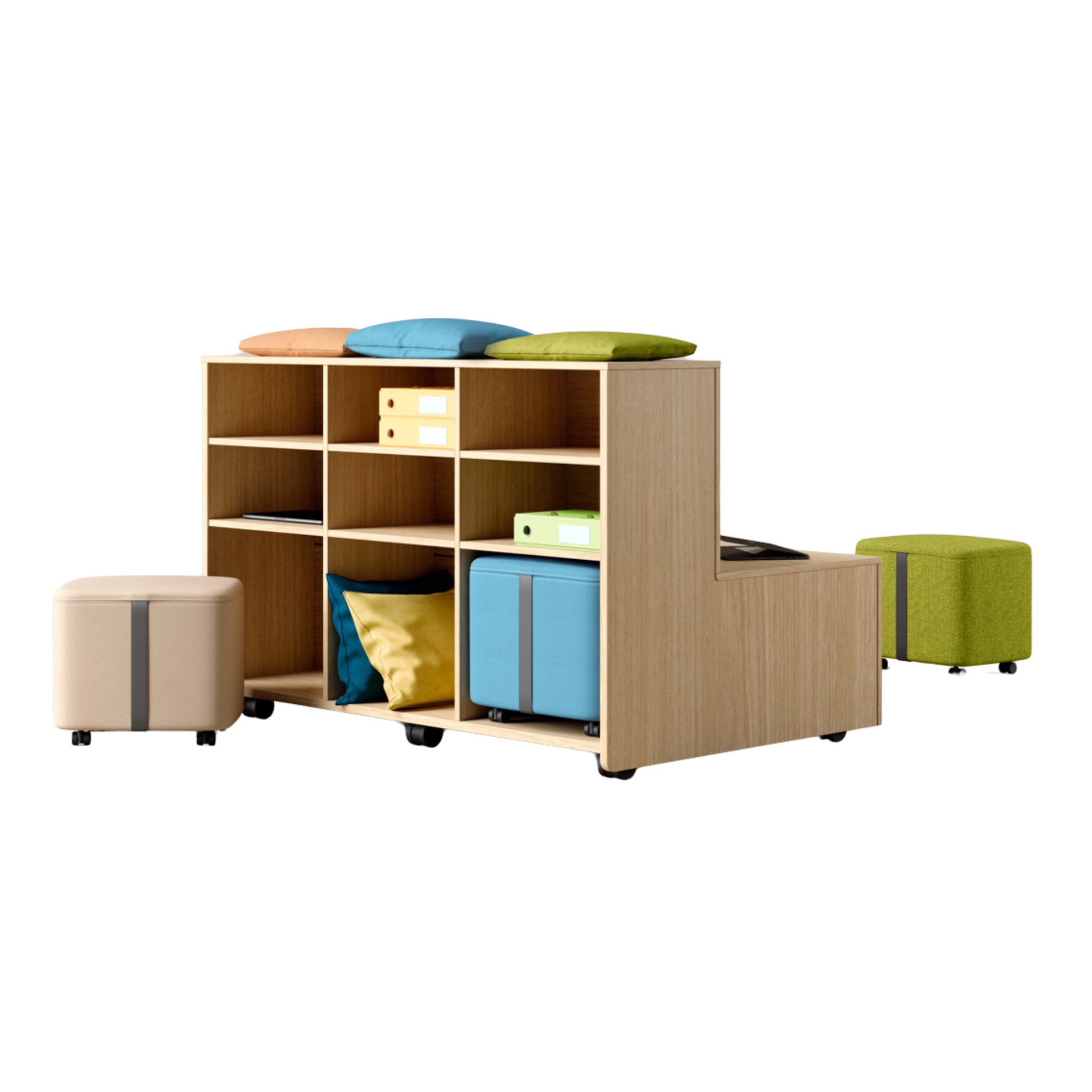 Each module also incorporates additional integrated storage space and can be complemented with additional poufs that provide greater comfort.