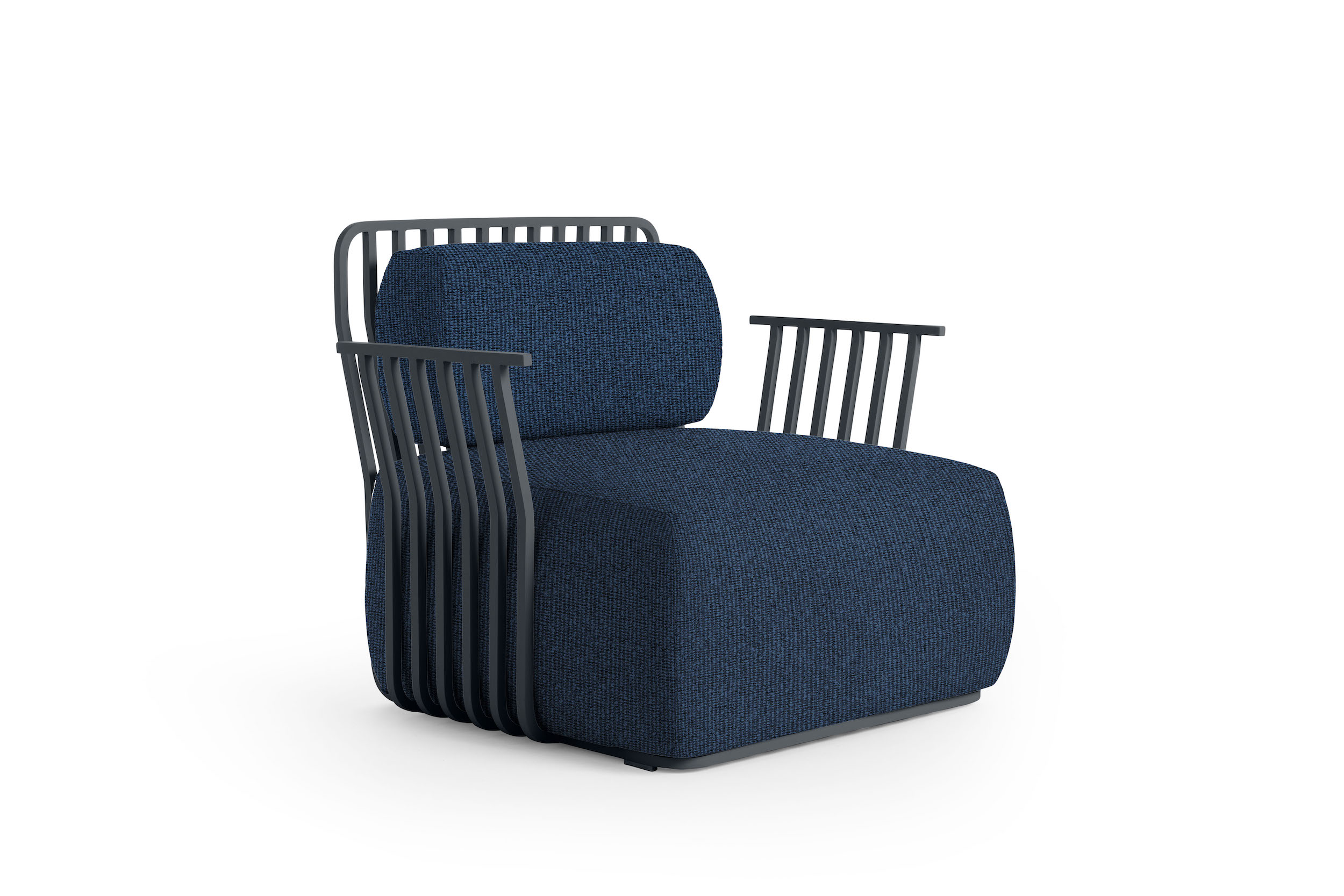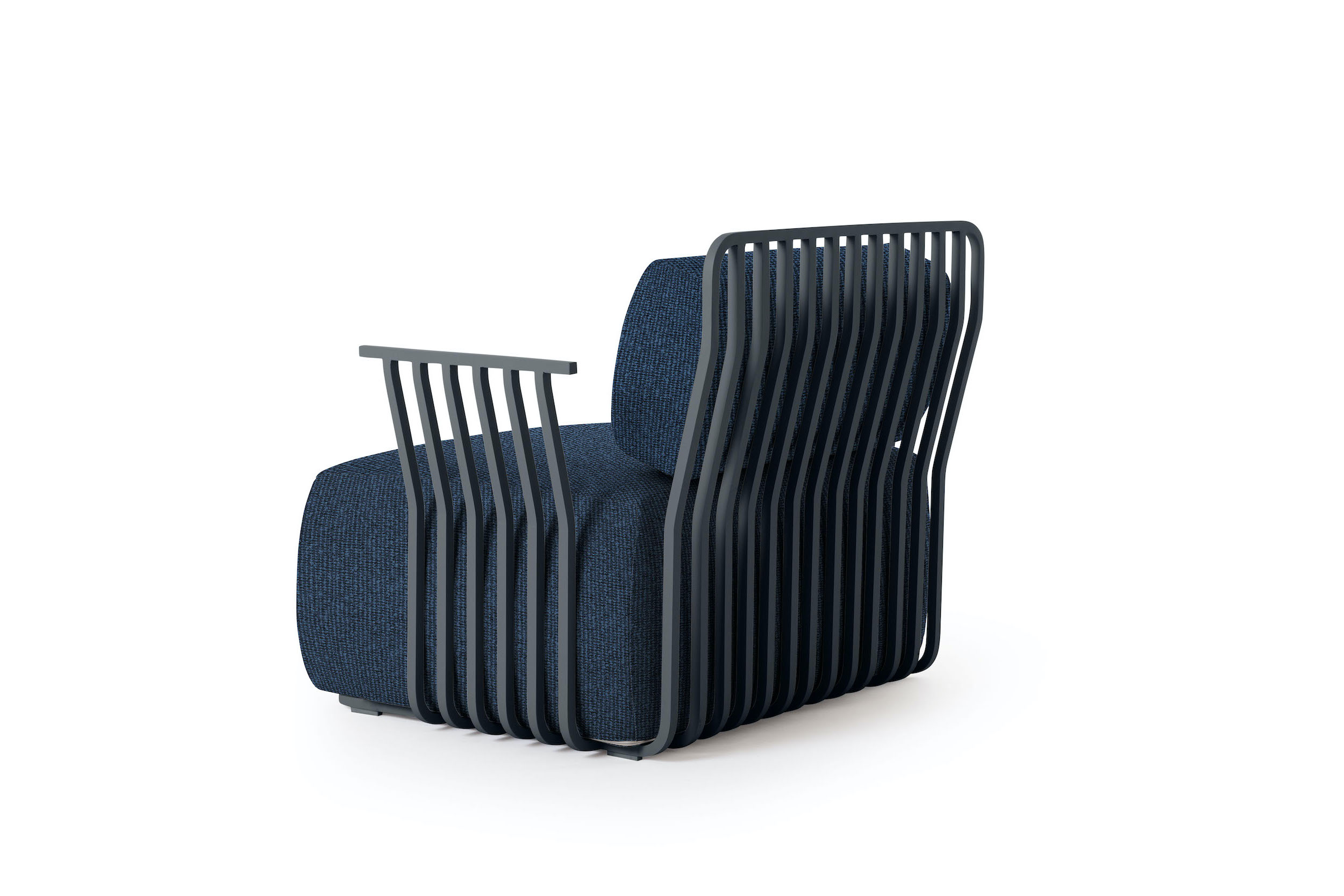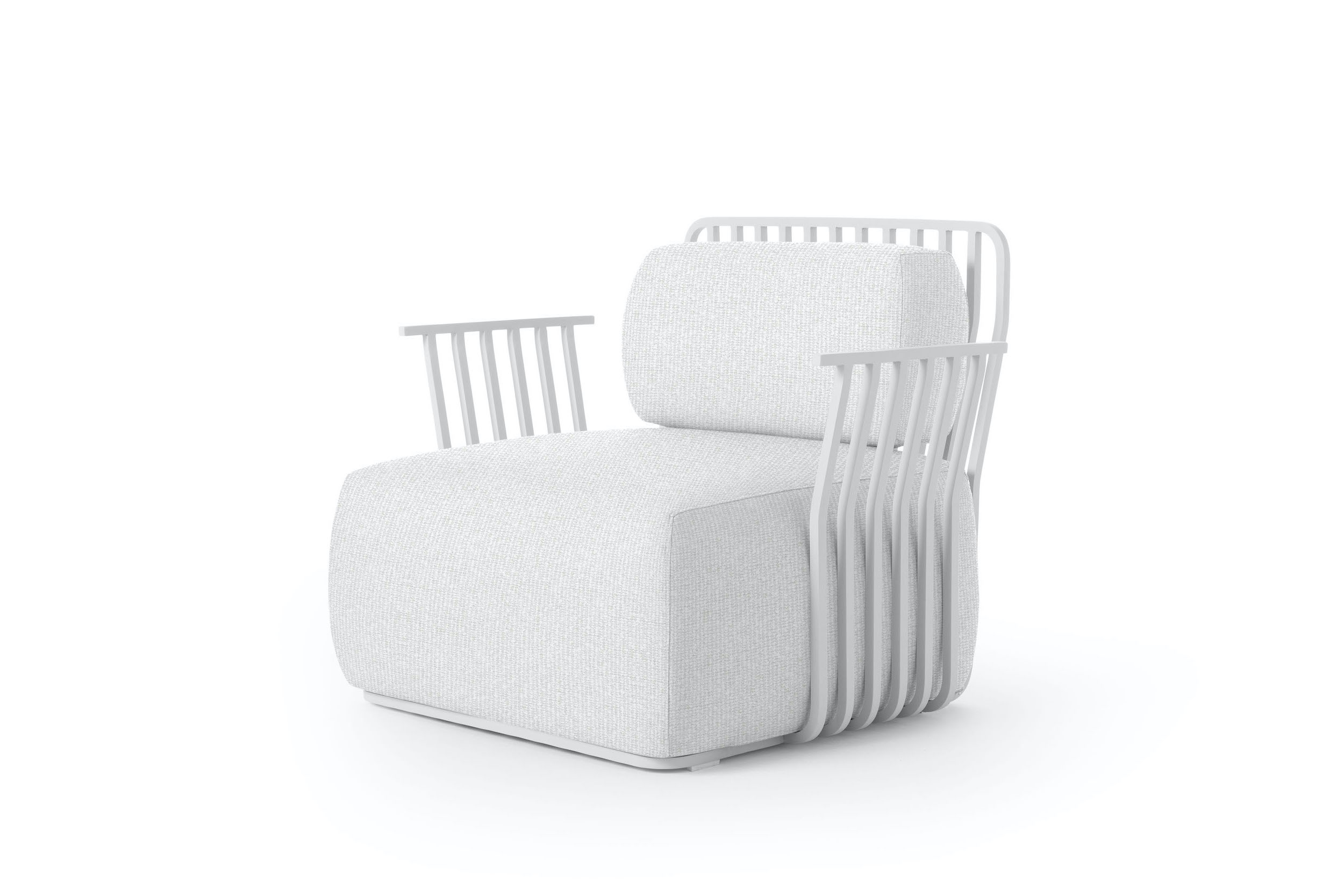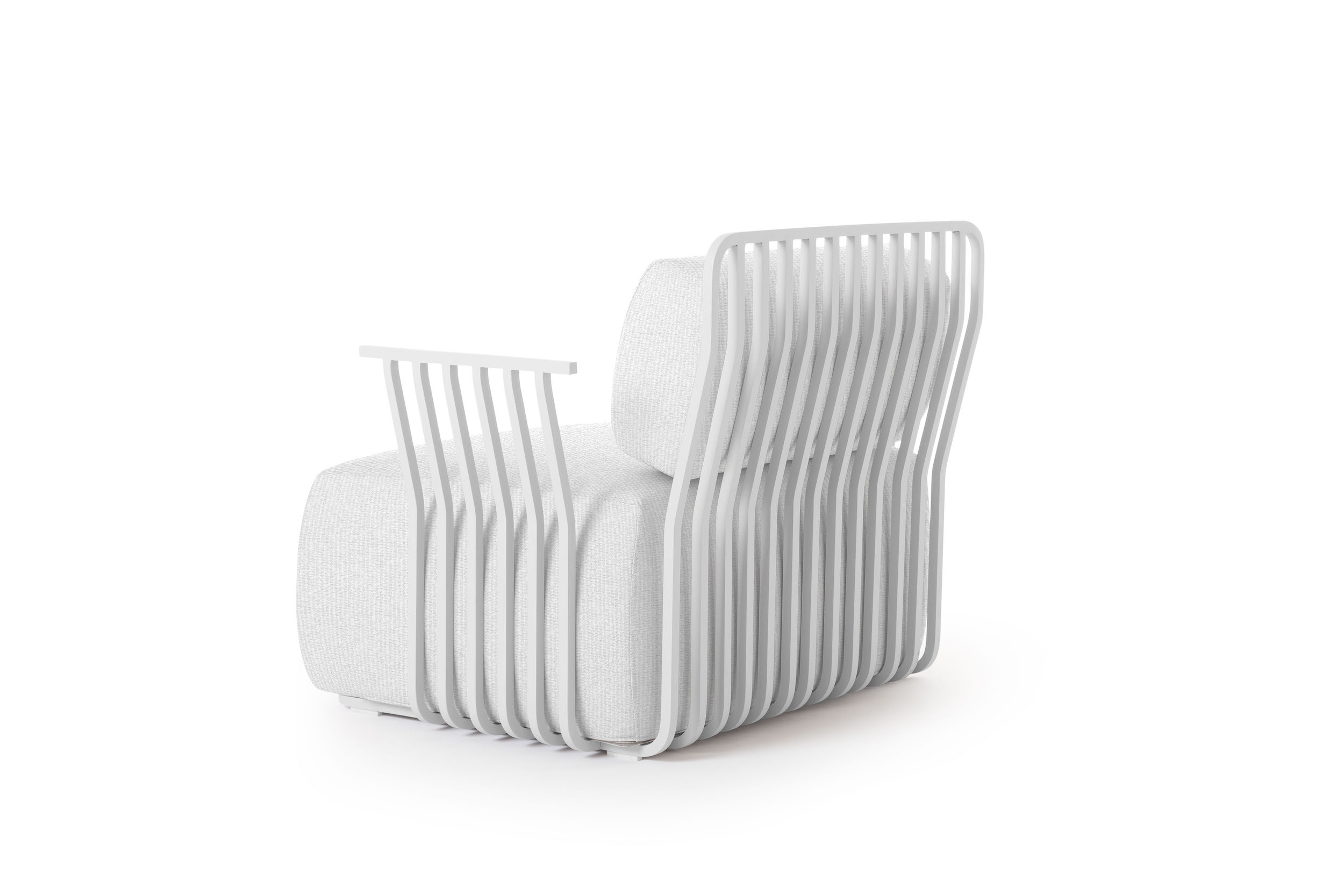 The structure of the Grill armchair with arms is made of square section thermo-lacquered aluminium, a light and resistant material that is highly durable outdoors. The seat and back cushions of this designer armchair are filled with polyurethane foam and covered with water-repellent fabric.
