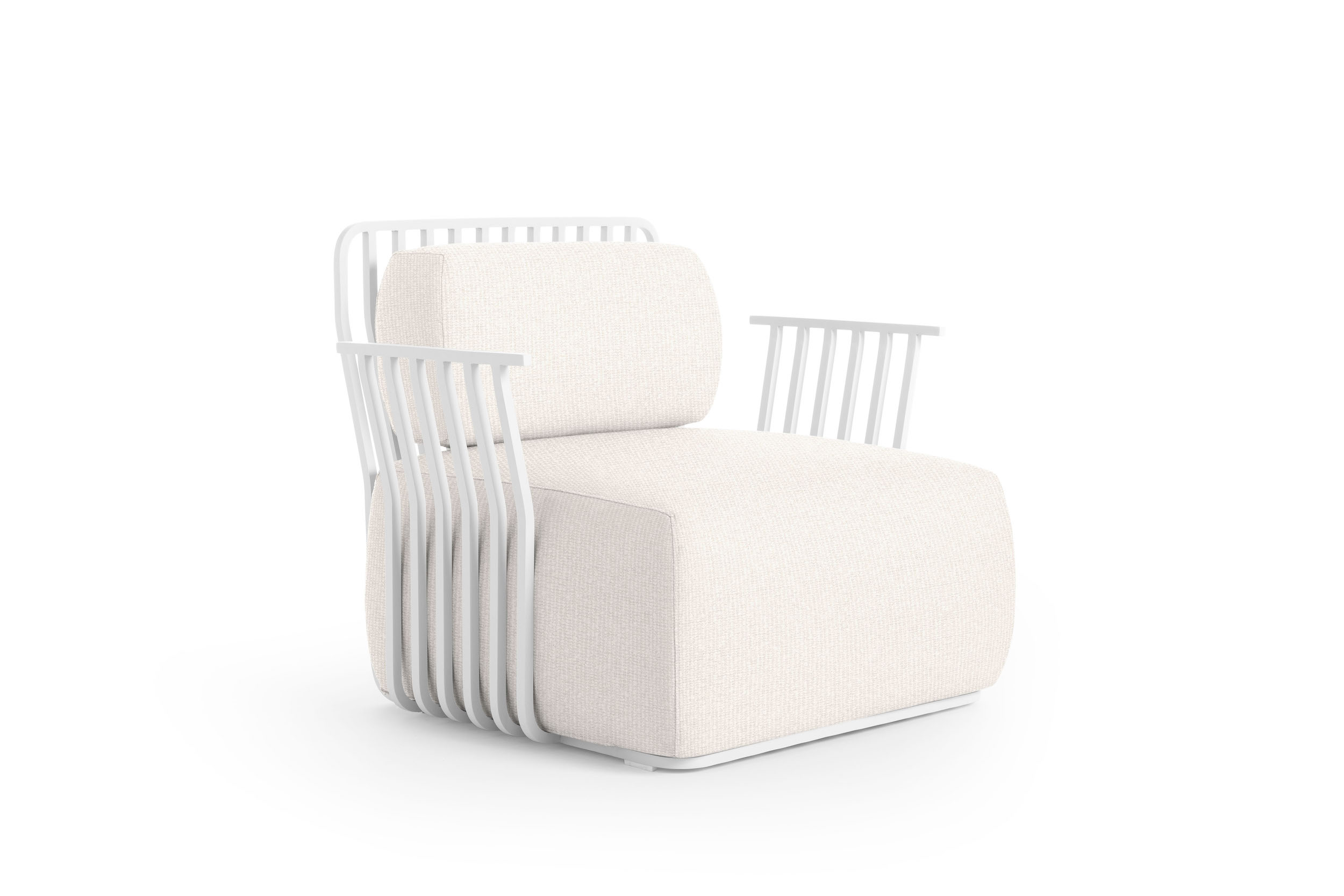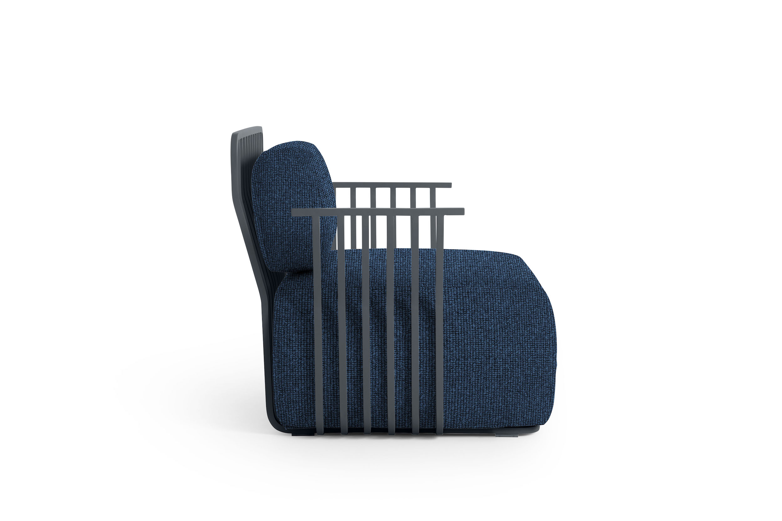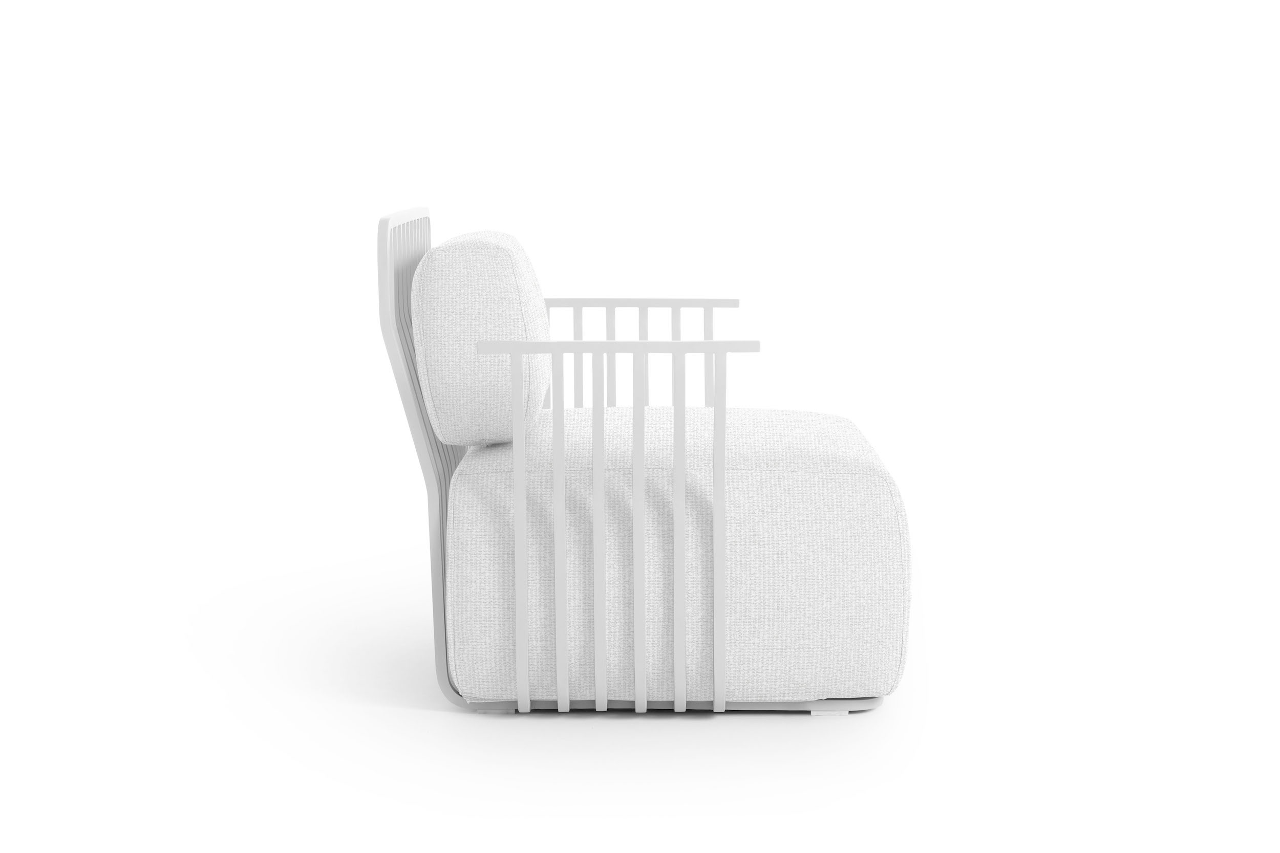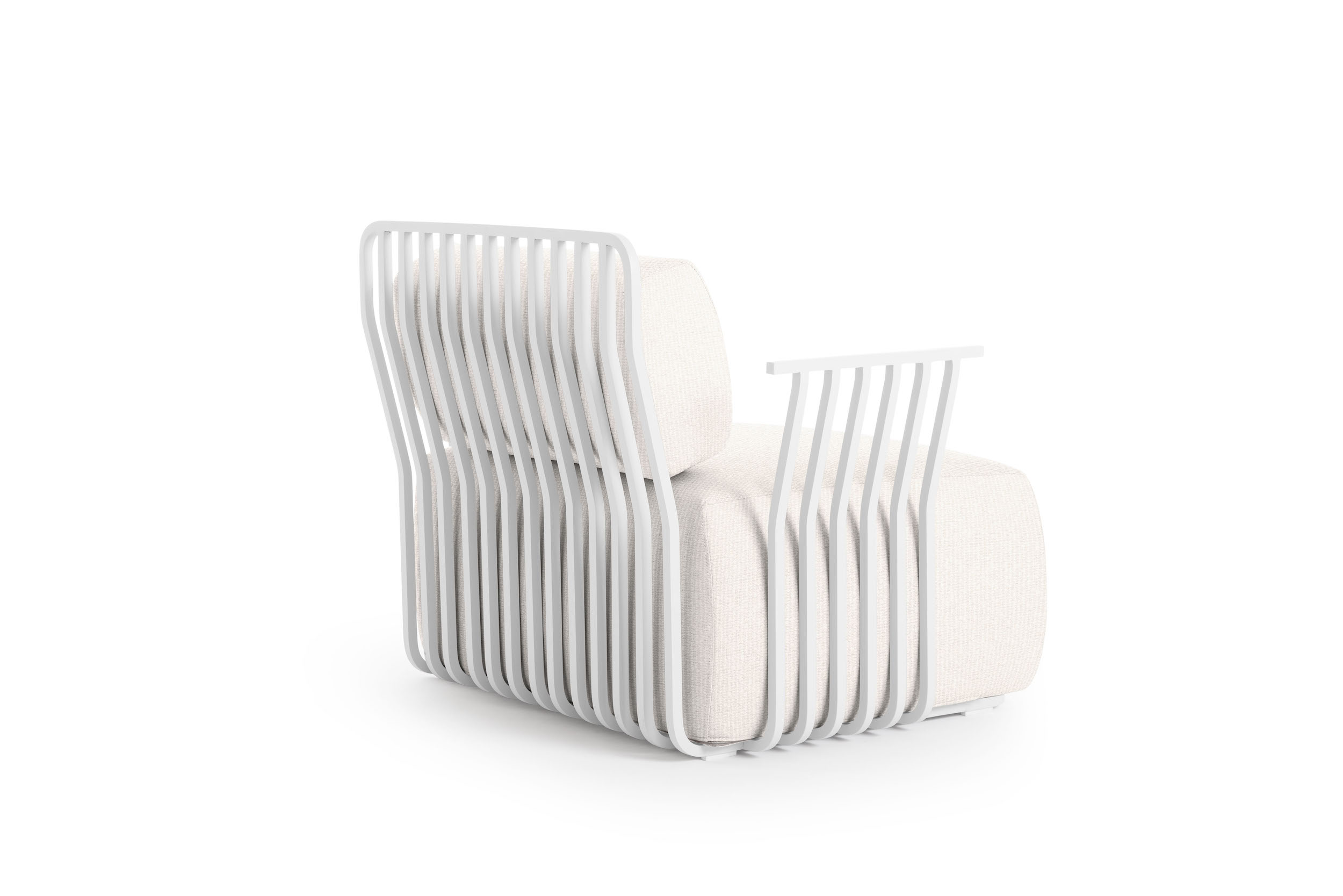 The structure of the Grill armchair with arms is made of square section thermo-lacquered aluminium, a light and resistant material that is highly durable outdoors. The seat and back cushions of this designer armchair are filled with polyurethane foam and covered with water-repellent fabric.