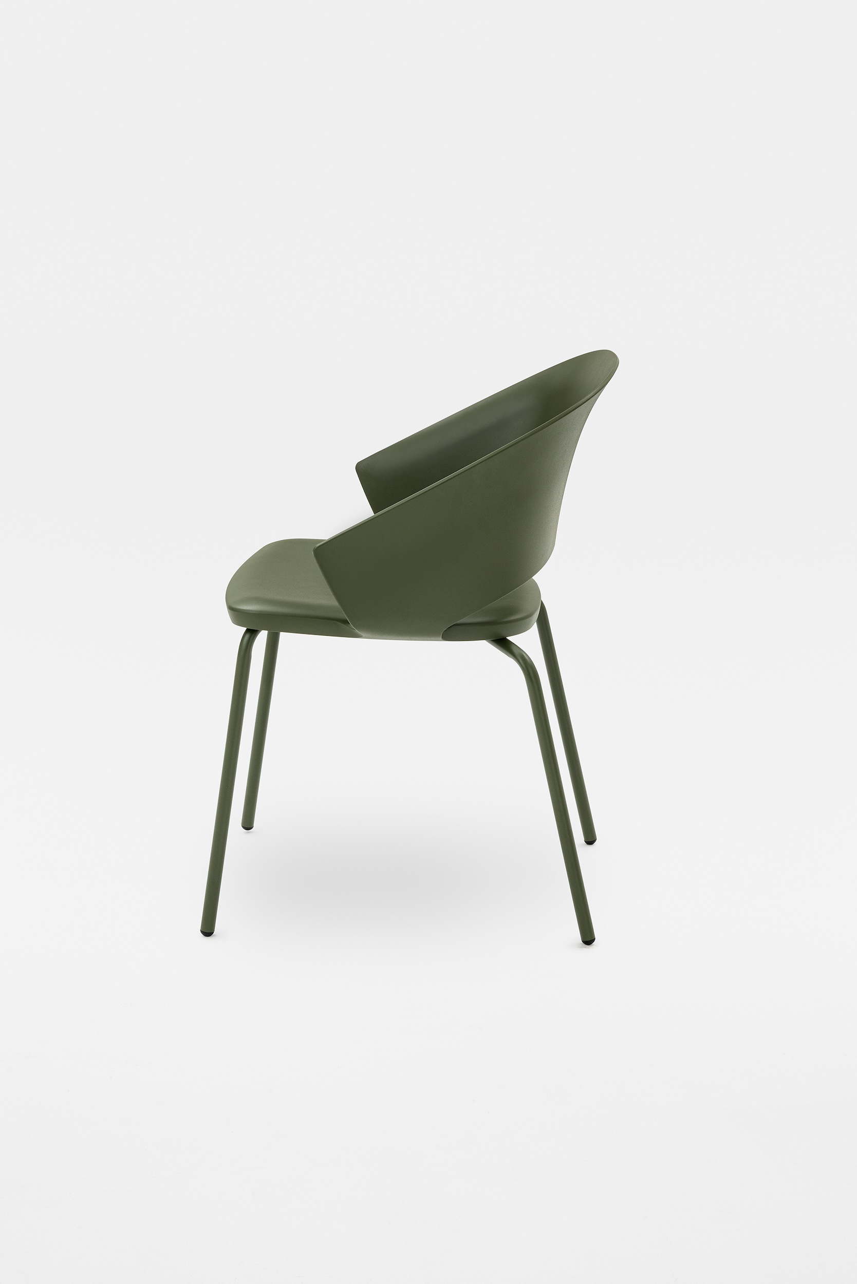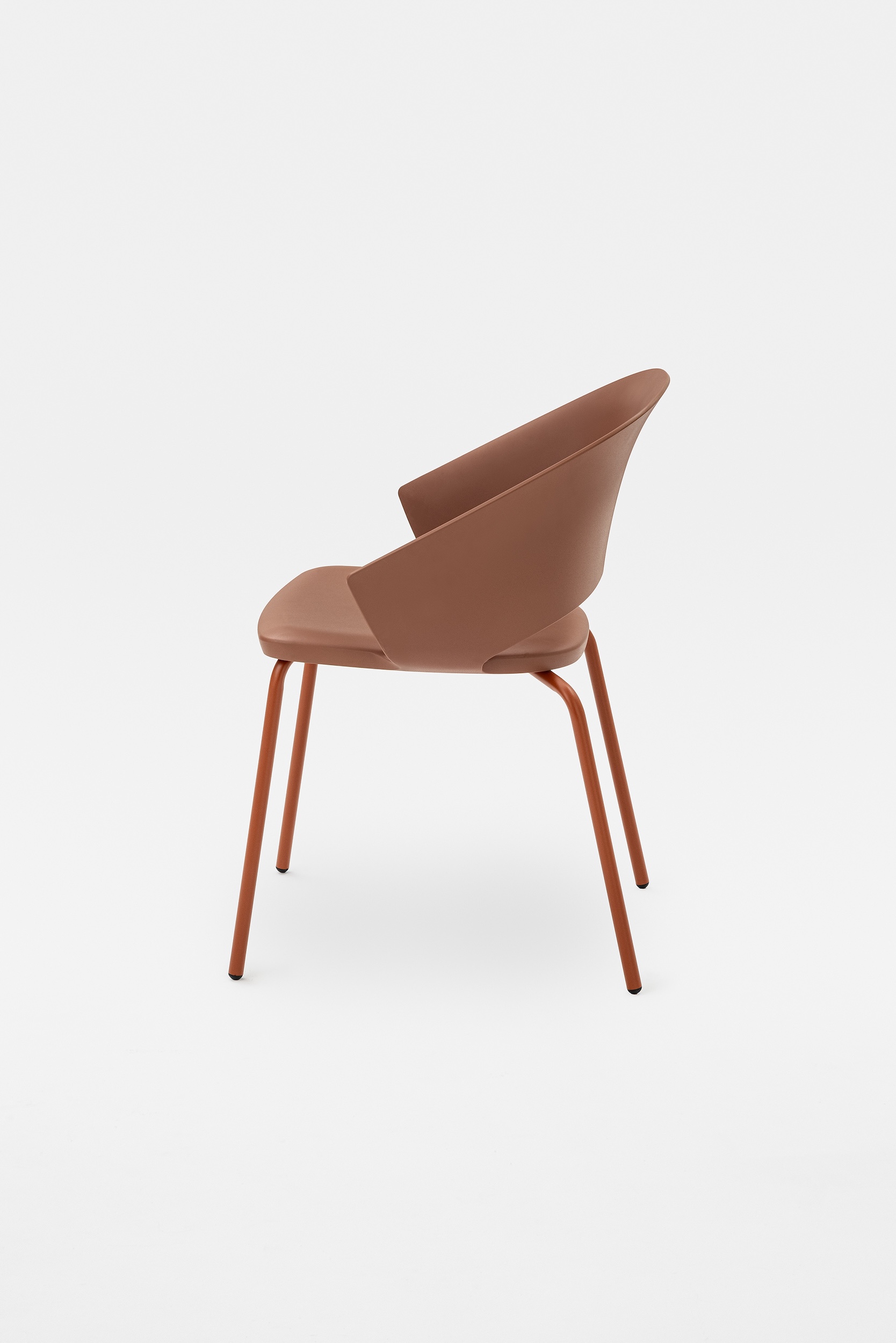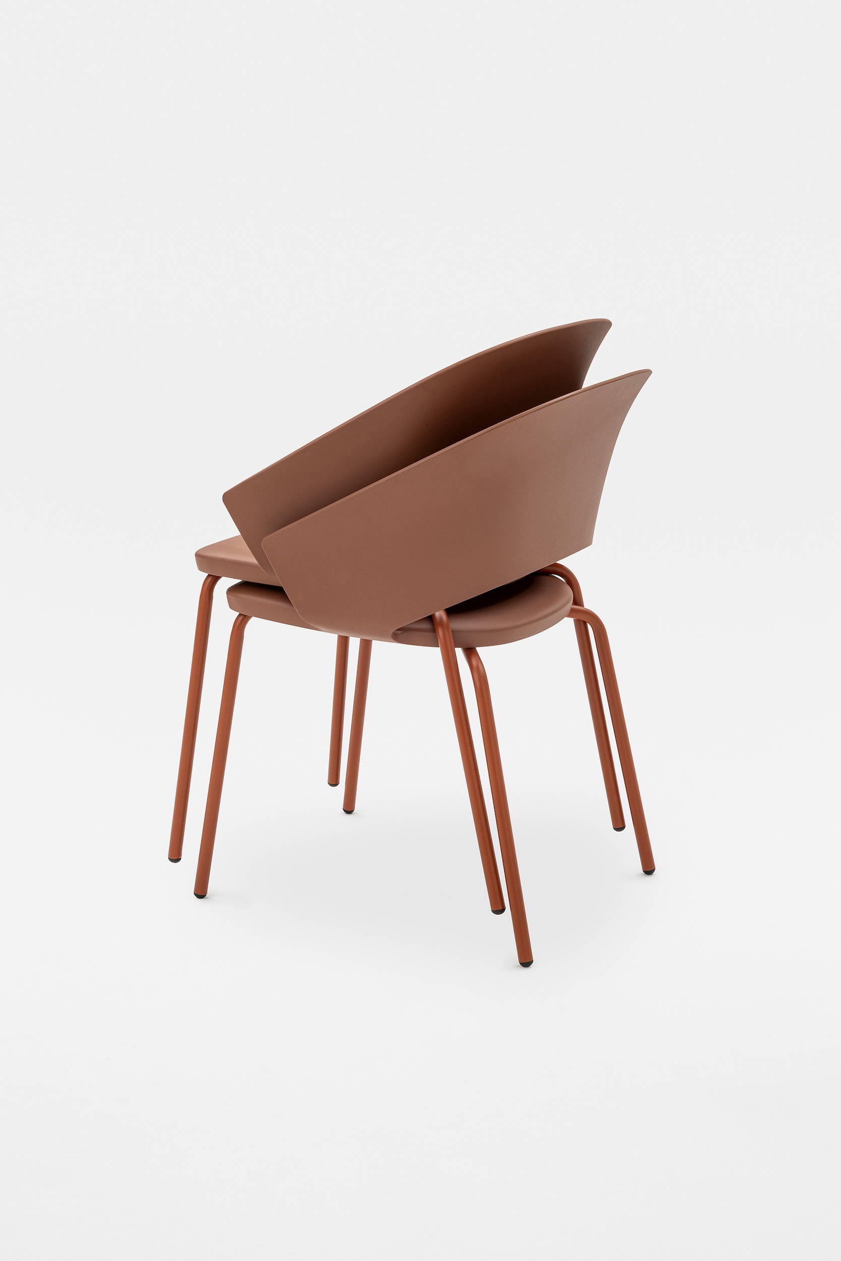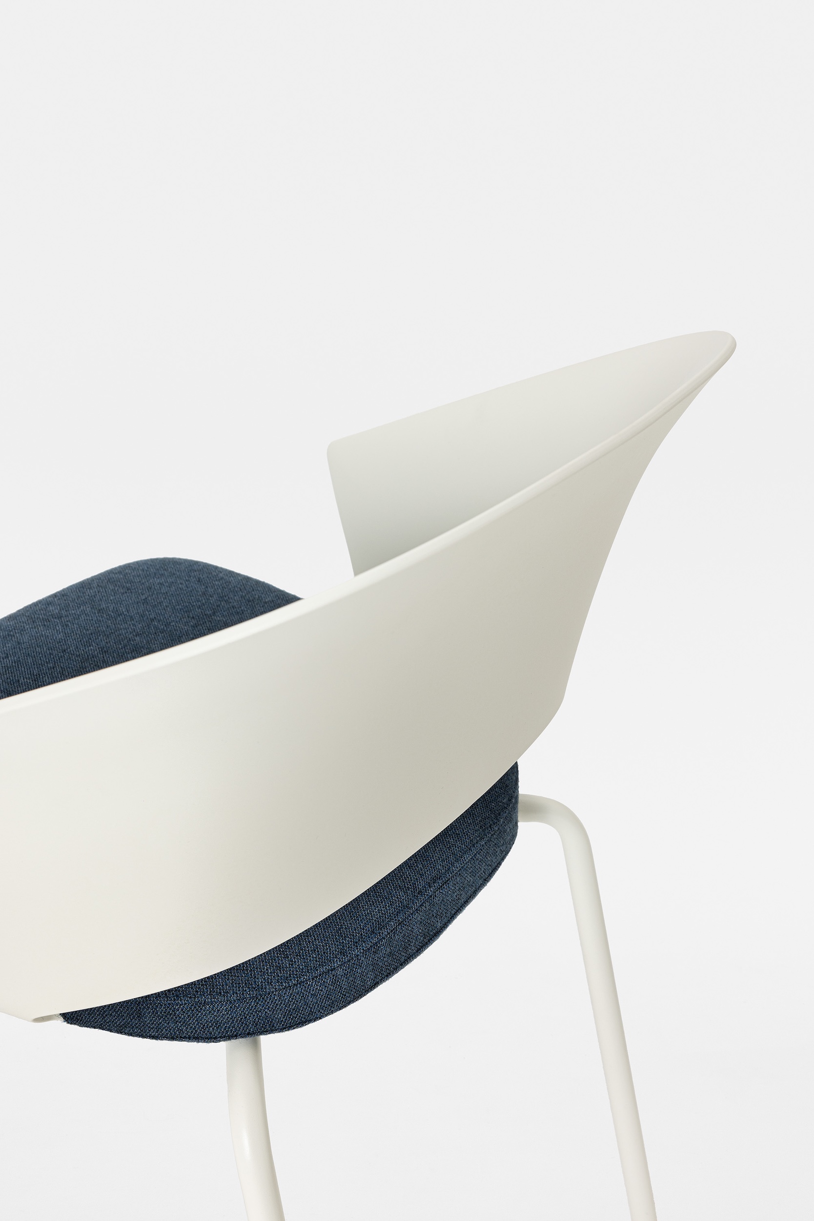 The detail of the inclined backrest is taken up from the original model to form the armrests, culminating in a moulding that literally embraces the seat. Echoing the armchair, the search for the same ergonomics is concealed in the controlled movement that supports the posture and enhances the comfort of the chair.