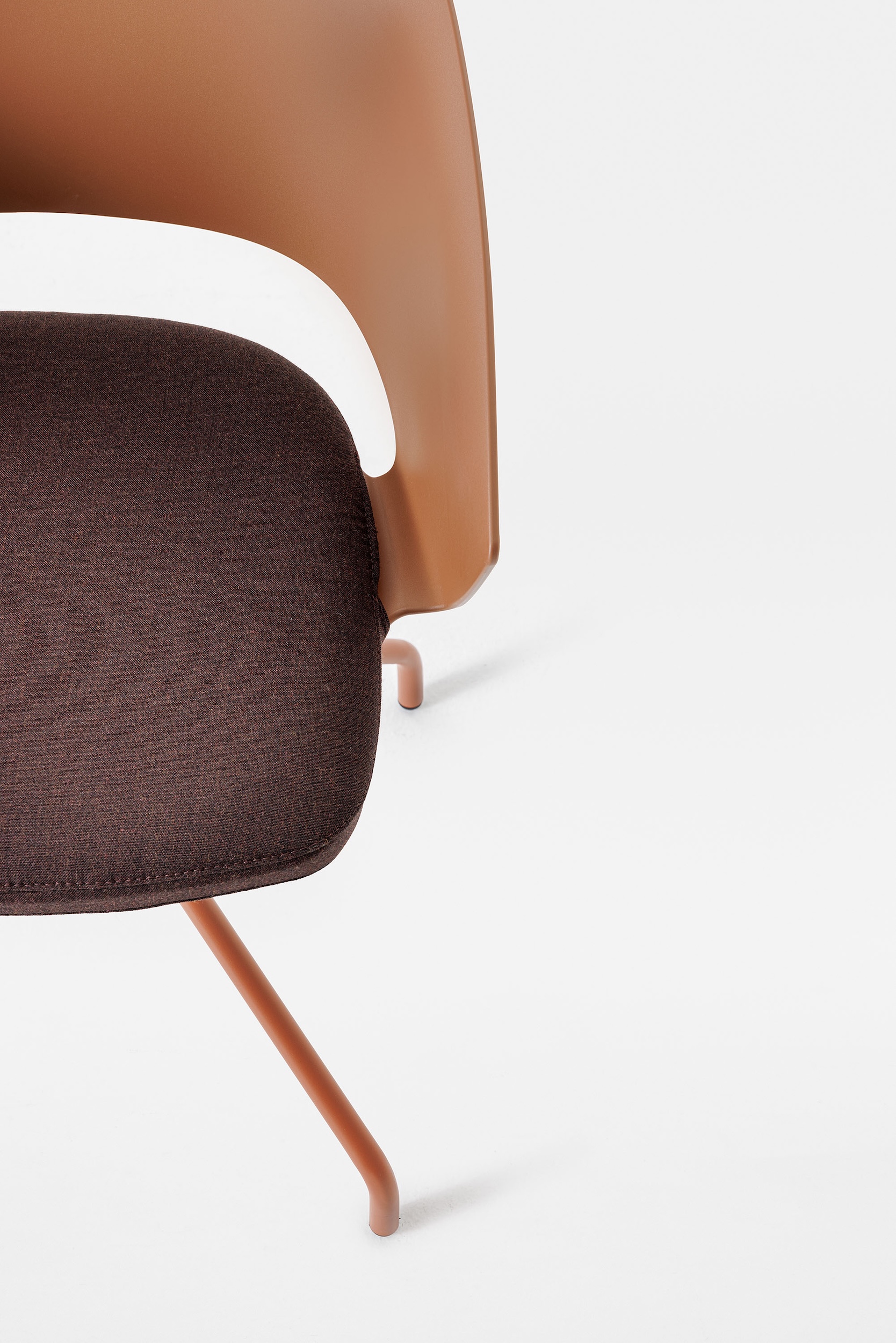 The detail of the inclined backrest is taken up from the original model to form the armrests, culminating in a moulding that literally embraces the seat. Echoing the armchair, the search for the same ergonomics is concealed in the controlled movement that supports the posture and enhances the comfort of the chair.