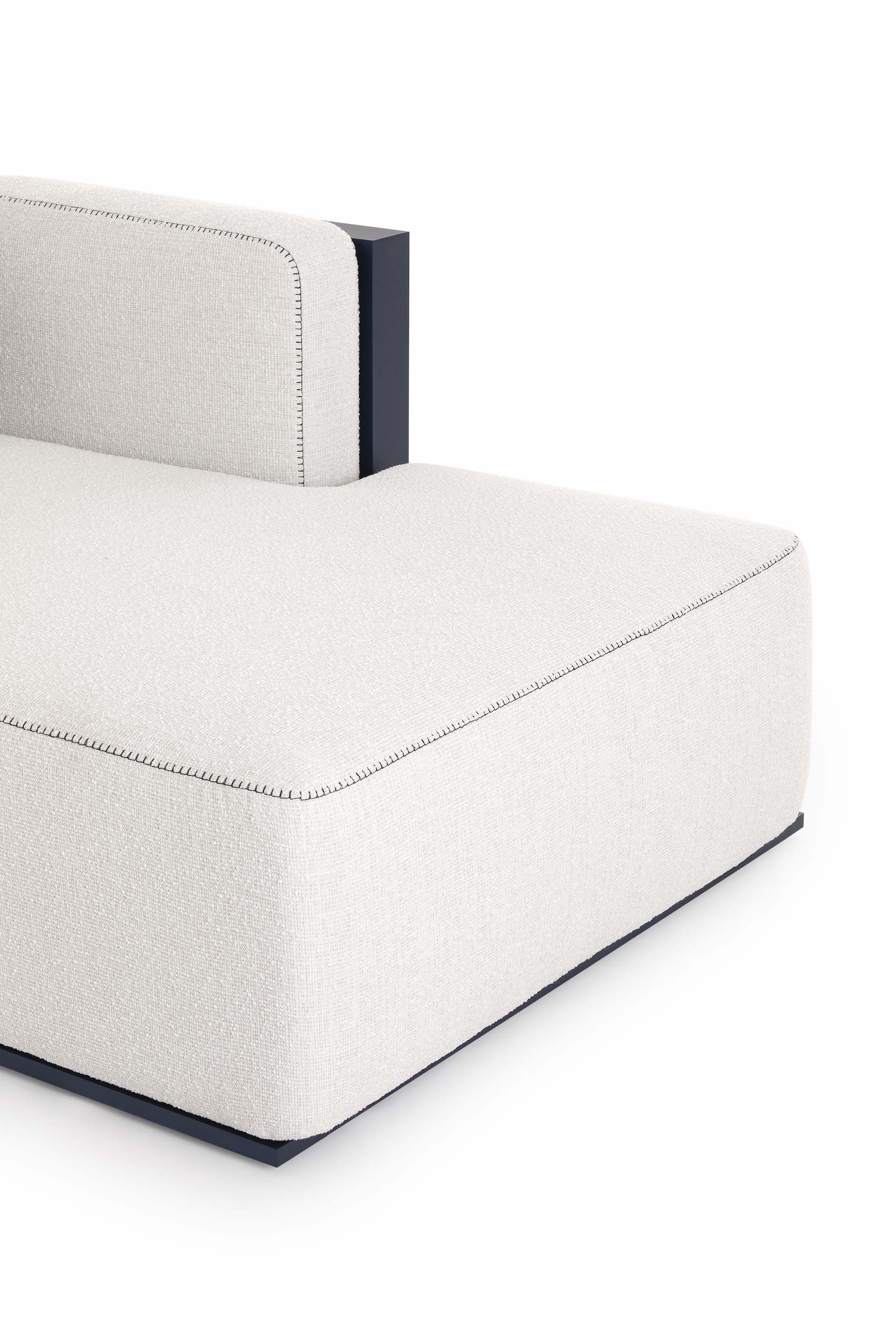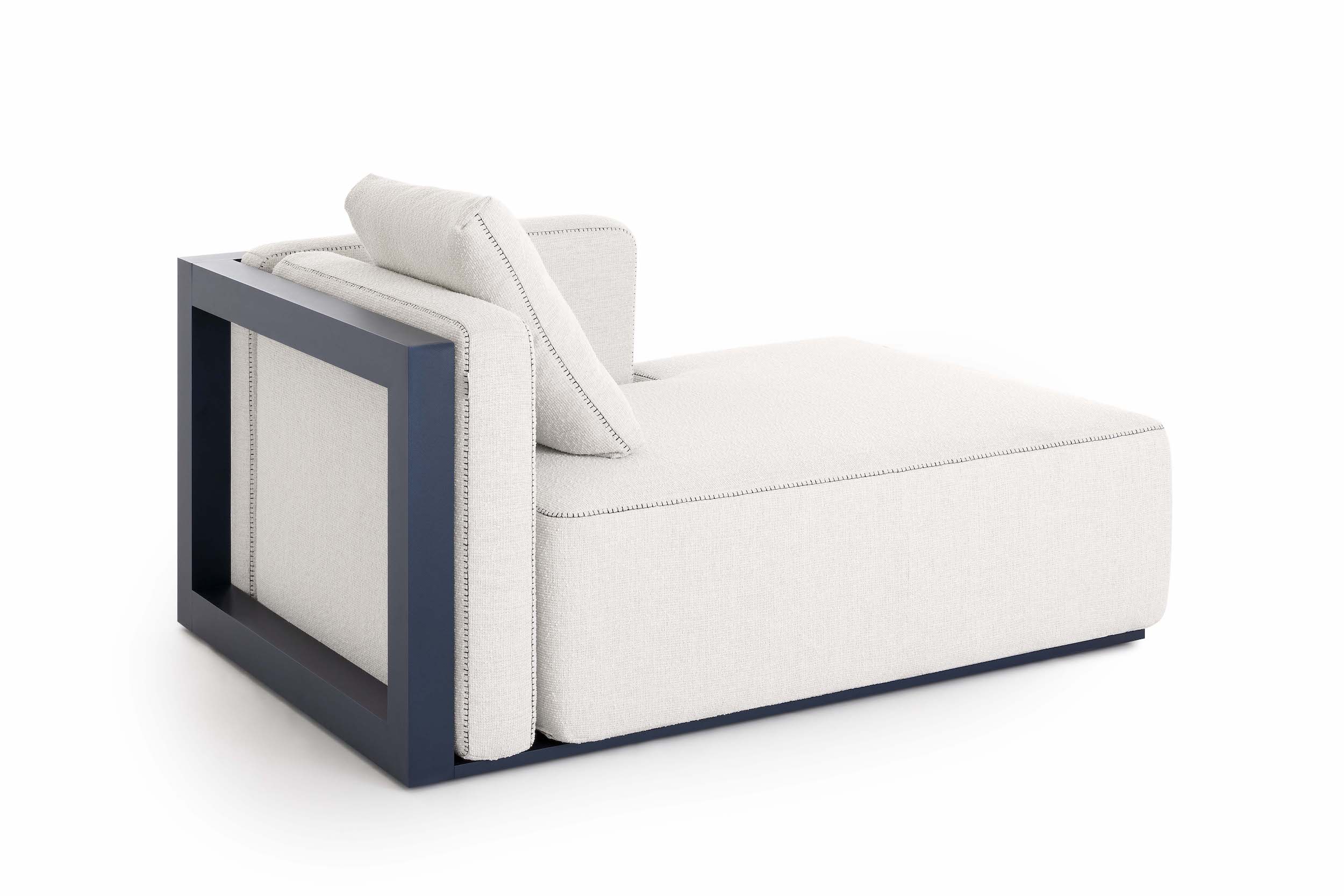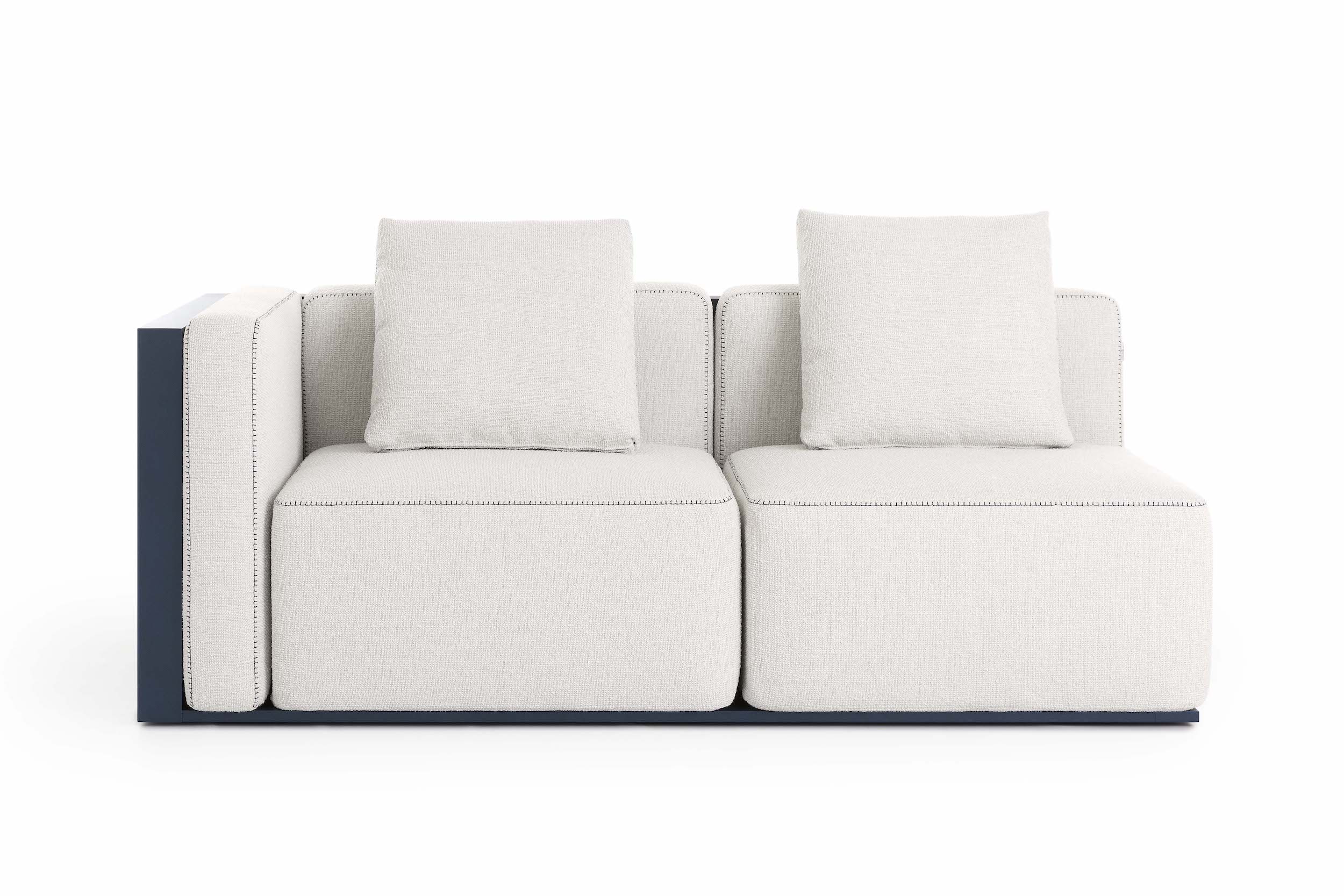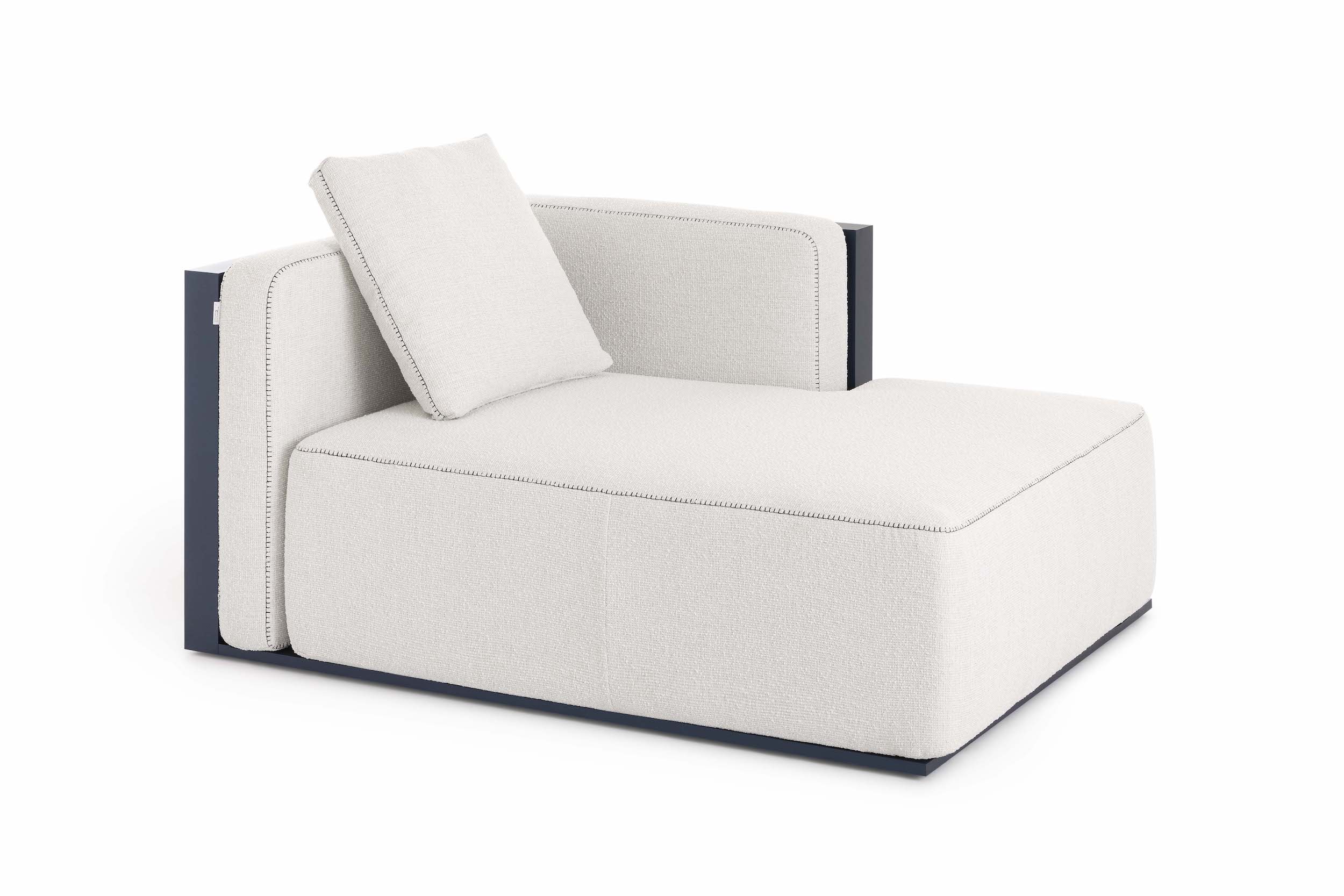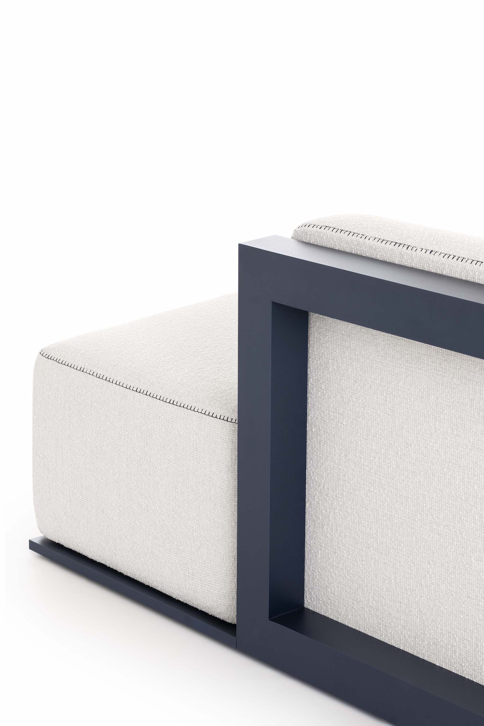 The Islablanca modular sofa is the ideal piece of furniture that adapts to any environment, from private interiors to large contract surfaces. Its upholstery has an original decorative stitching and its aluminium structure is also available in a midnight blue tone that gives it great personality.