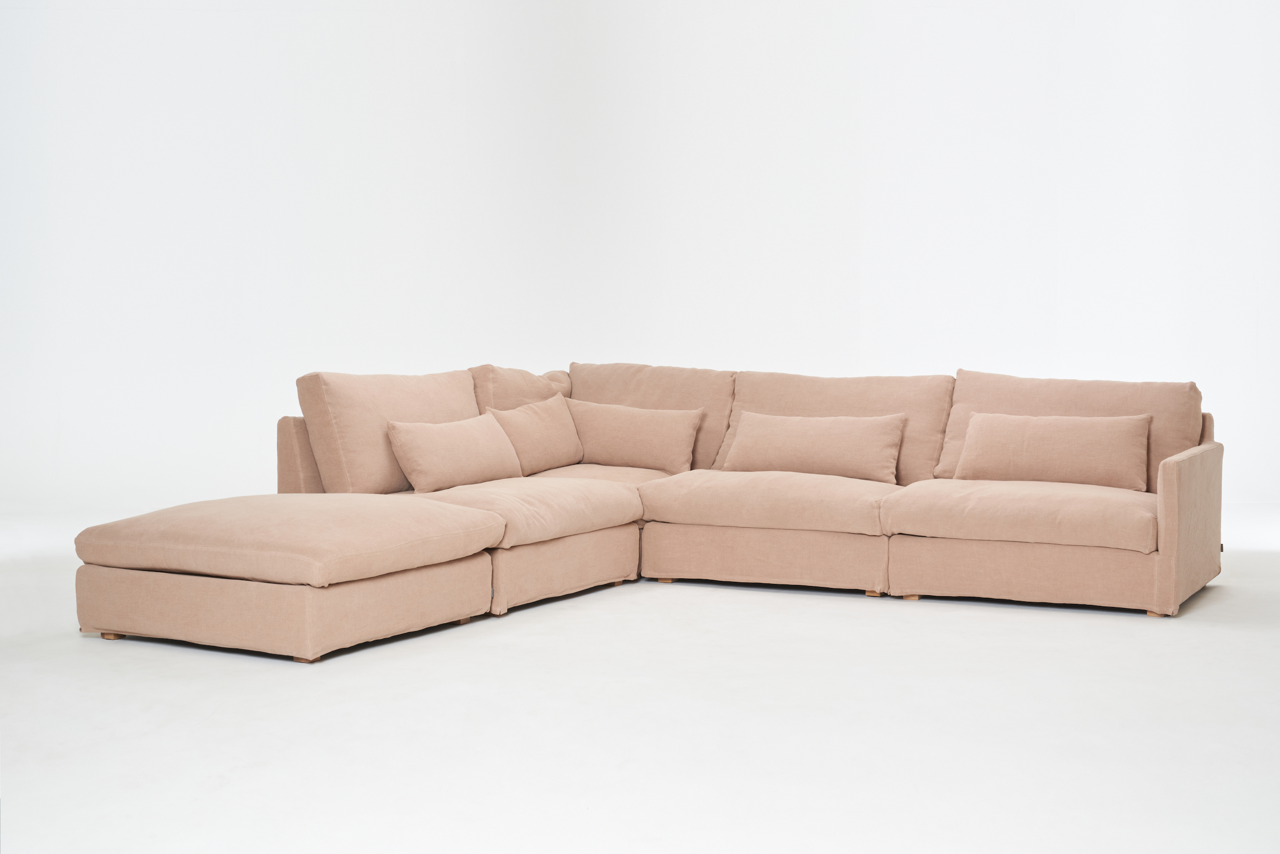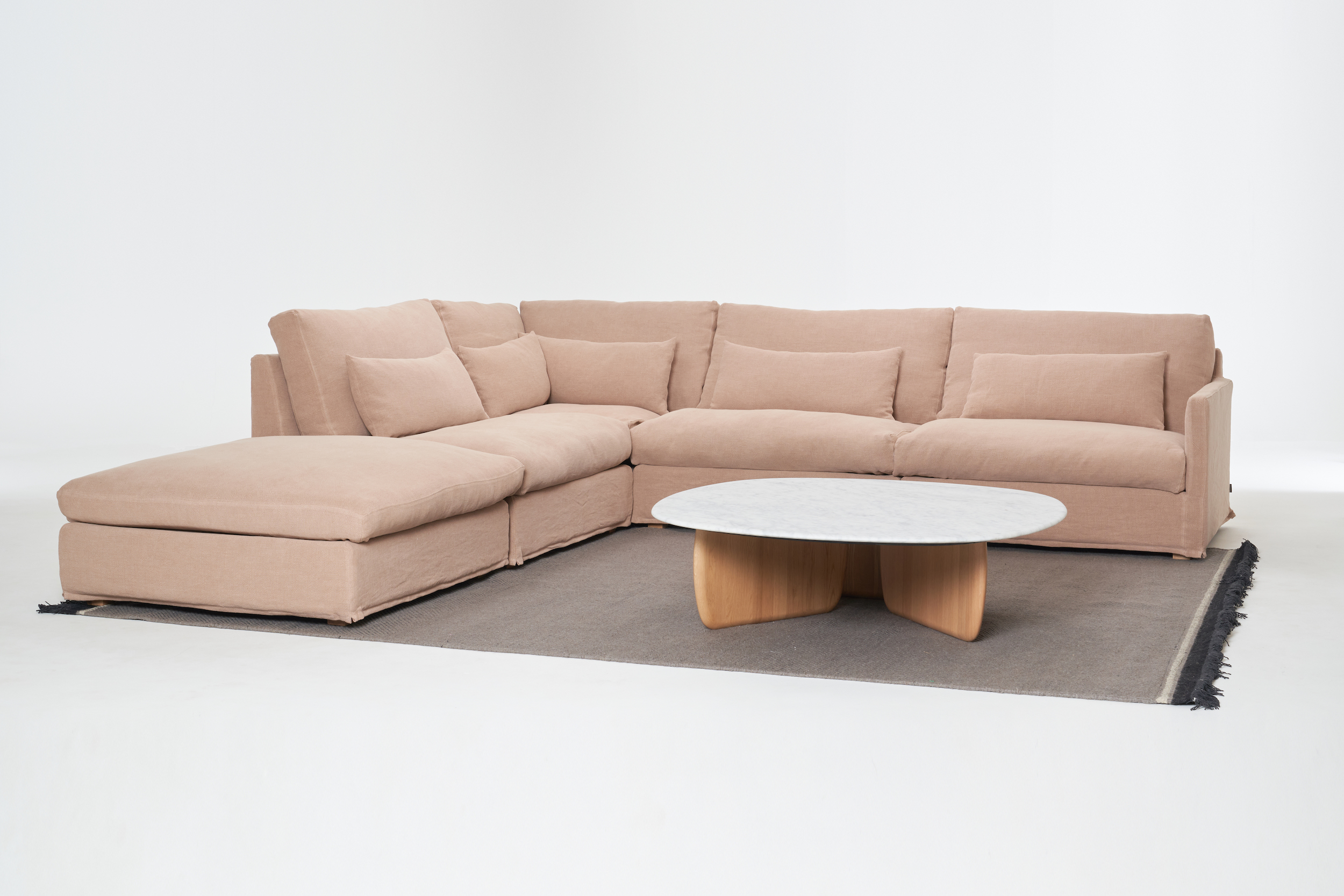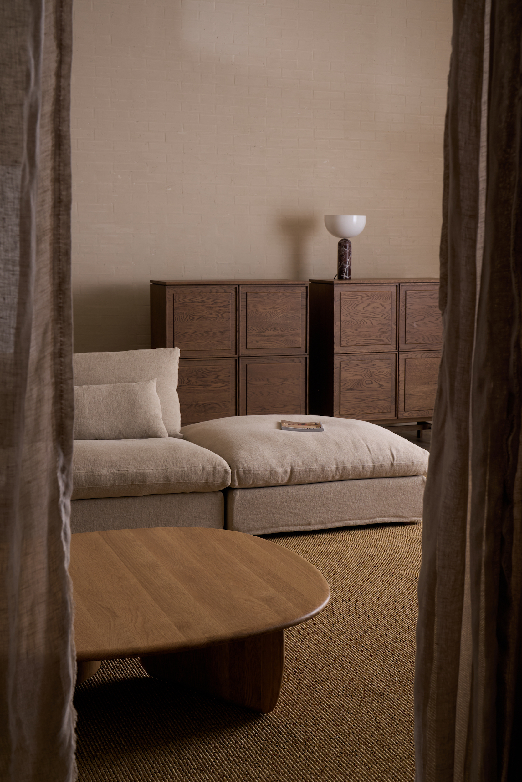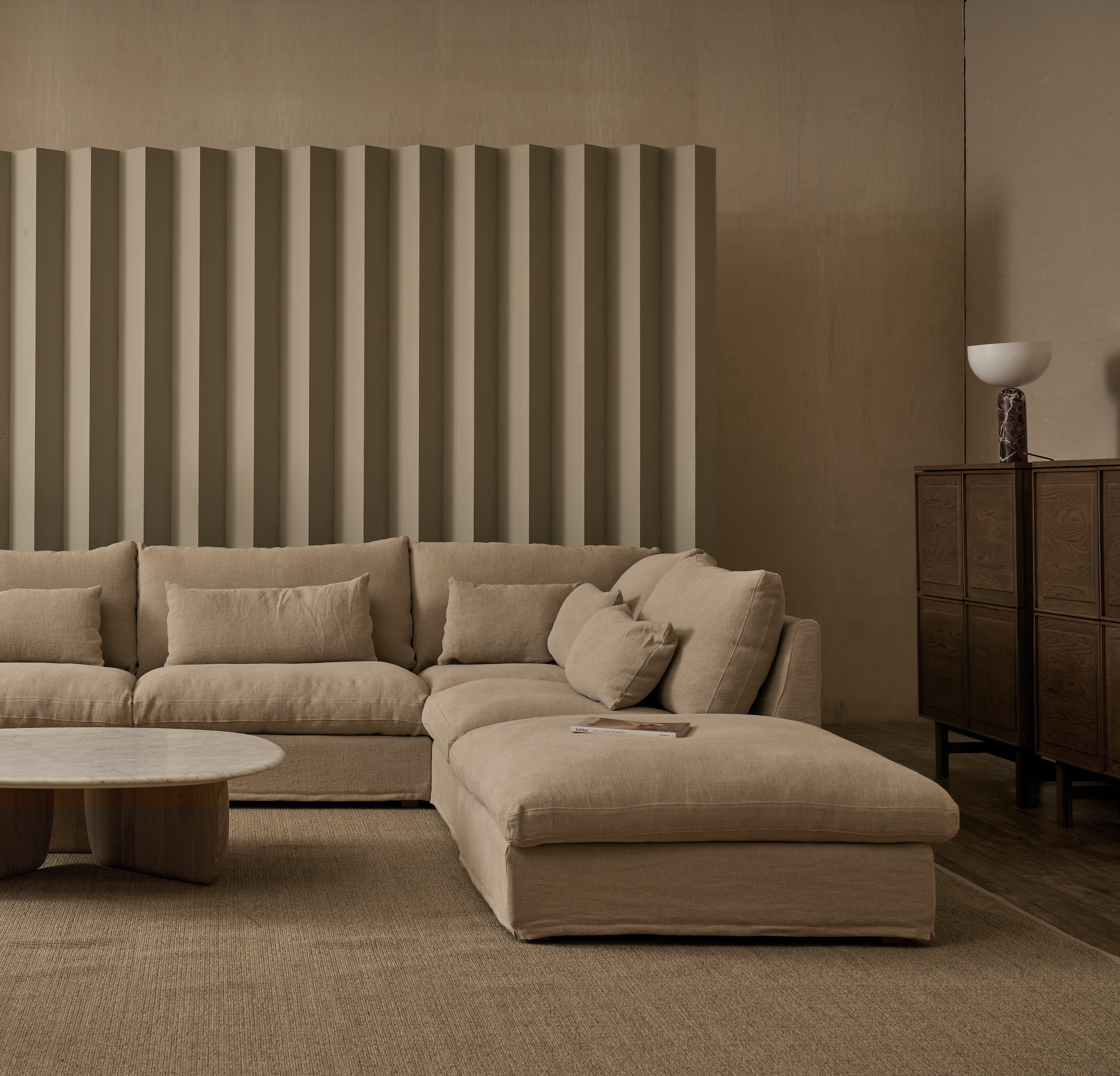 Its modular design includes various components—armless, corner, and arm units, plus an ottoman allowing you to create personalised configurations to suit any space. The five modules can be combined together to make unlimited configurations. The fully removable linen slipcovers available in a range of natural tones, make it easy to clean or update over time.