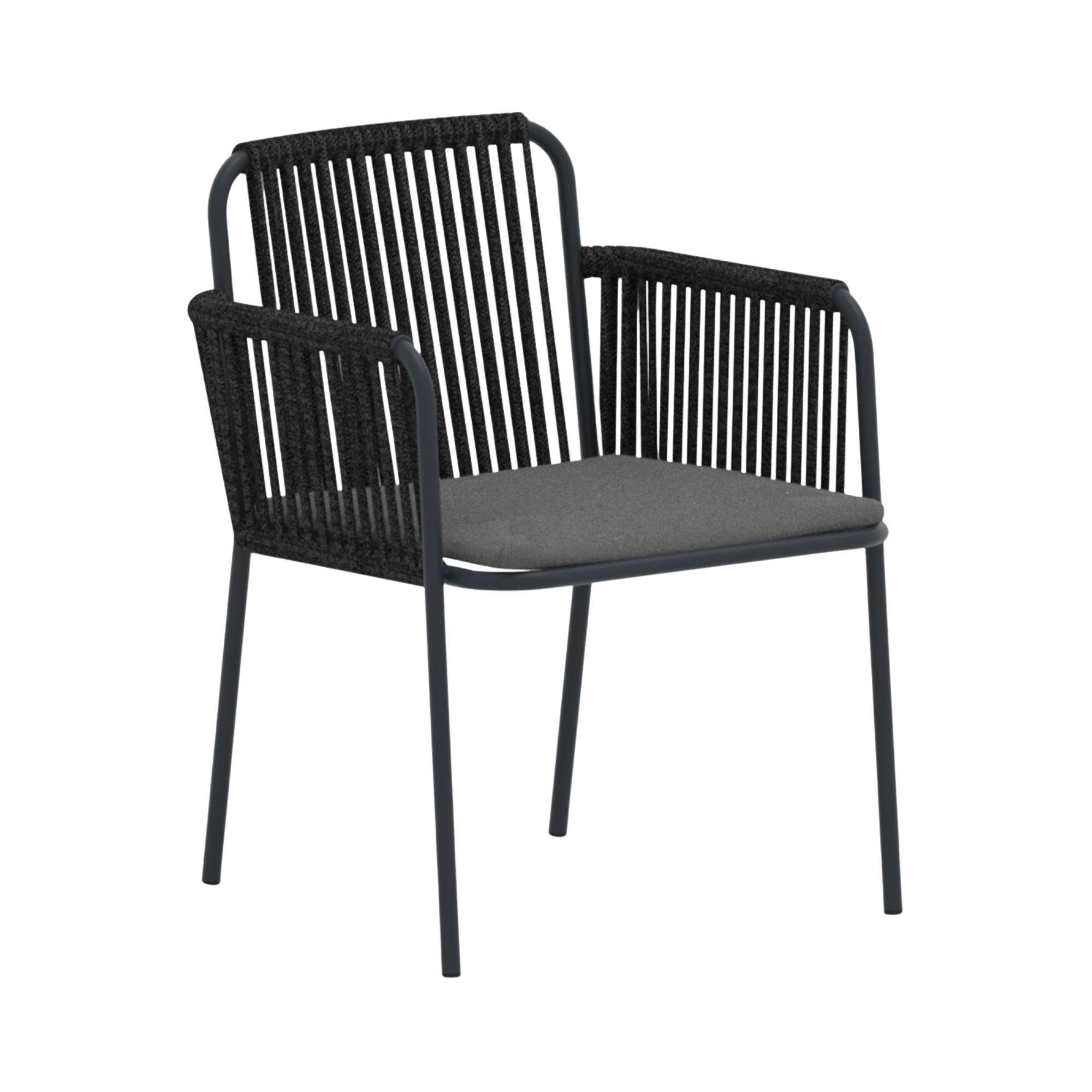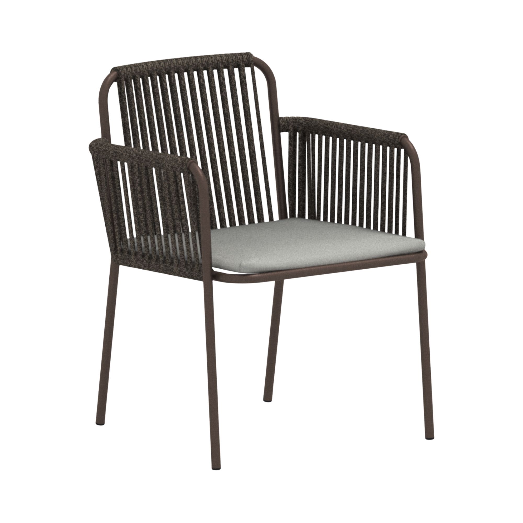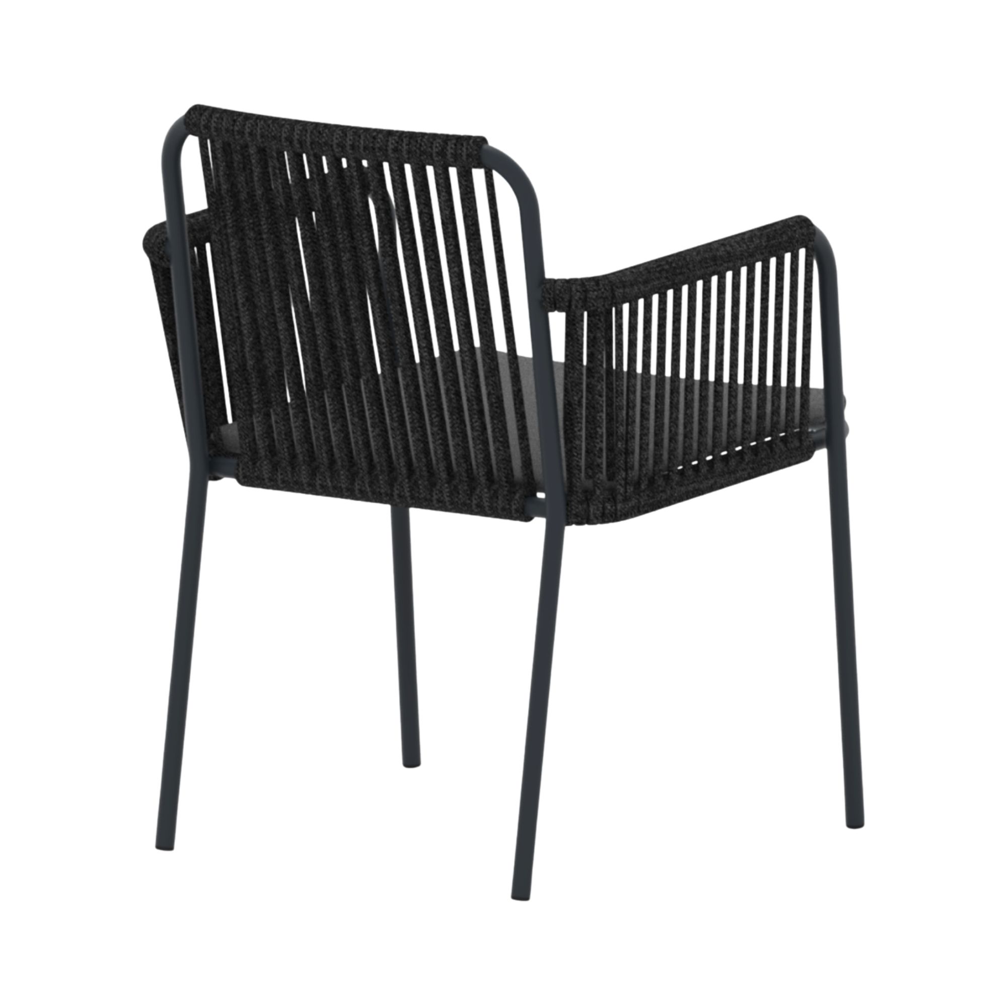 Powder coated metal frame, rope backrest detail, removable seat cushion