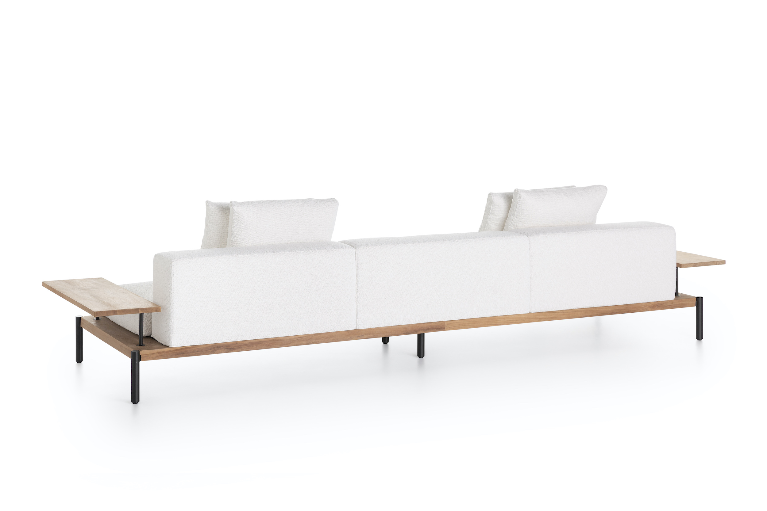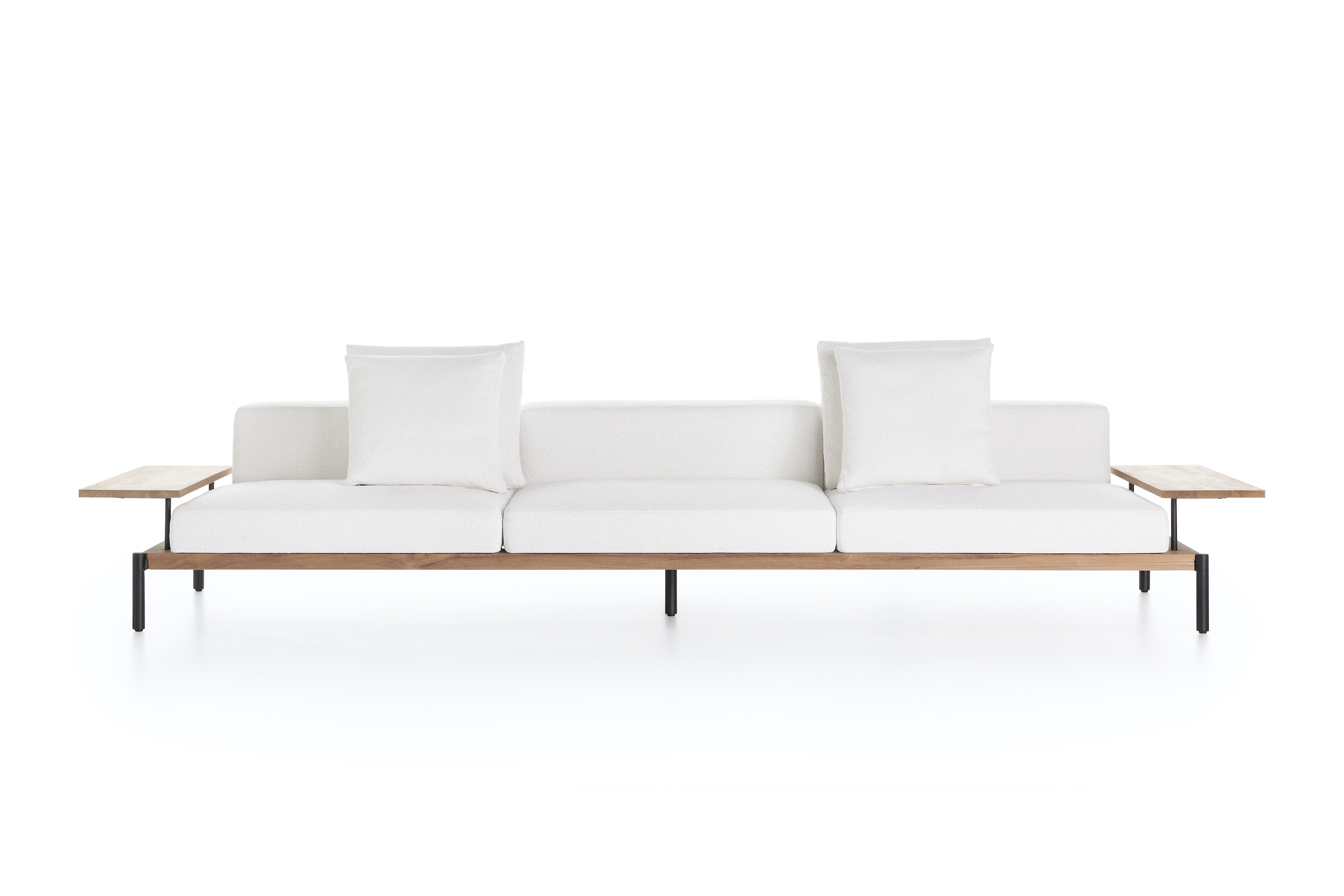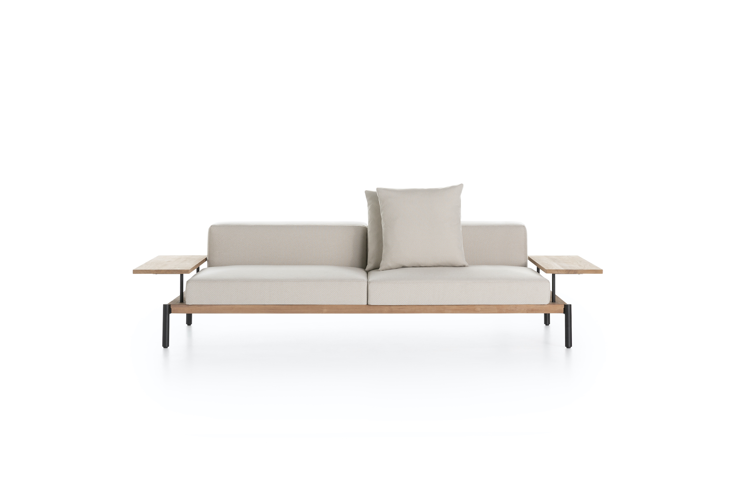 Lademadera Sofa by Gandiablasco is part of a collection of environmentally friendly outdoor furniture, whose natural finishes and clean lines make it integrate in a balanced way into any architectural space. The Lademadera Sofa is a designer sofa made of teak wood obtained from sustainably managed forests and a 100% recyclable powder-coated aluminium structure.