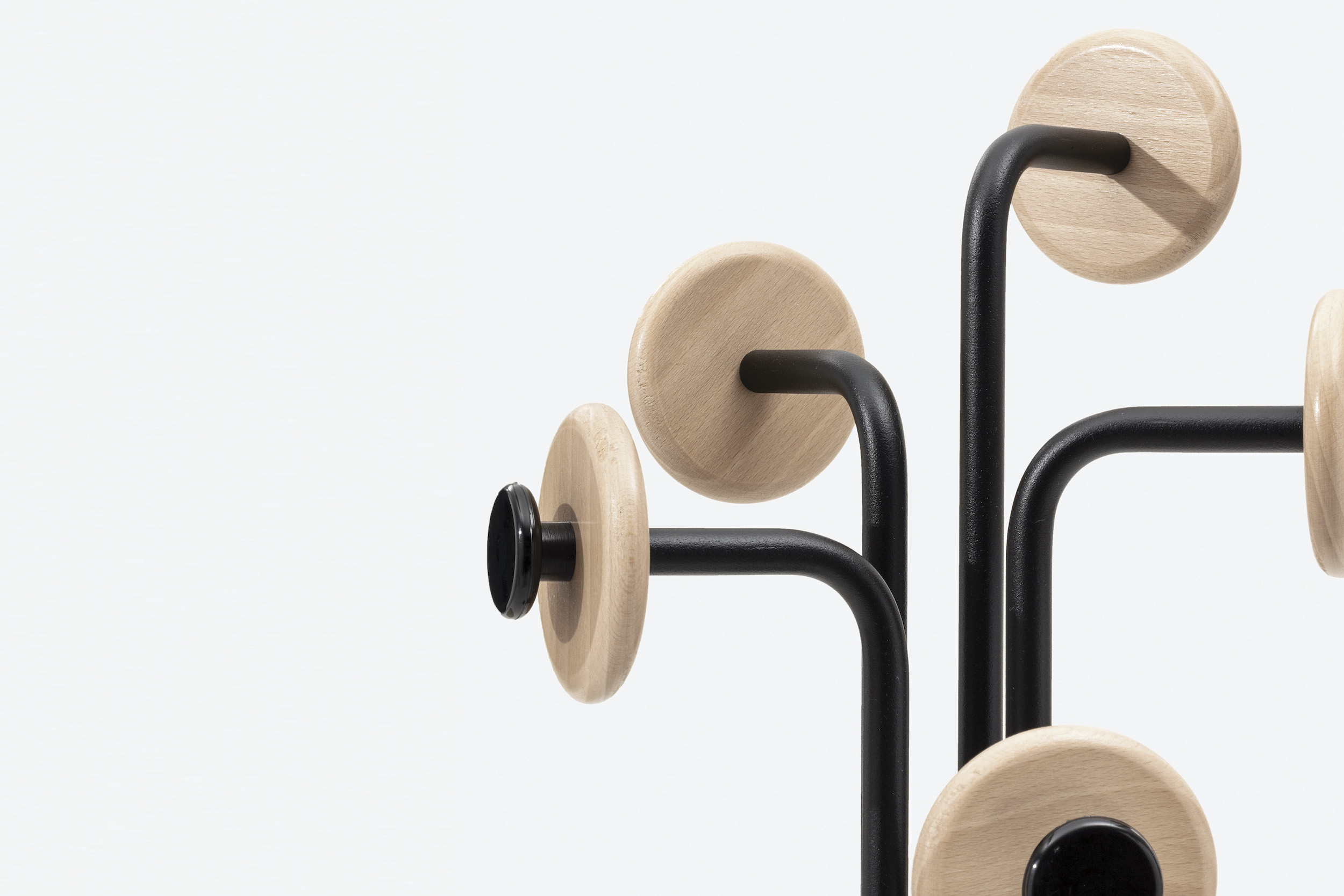 Discs made of turned and painted solid wood are screwed to the structure by means of ABS supports that create a second hook.
