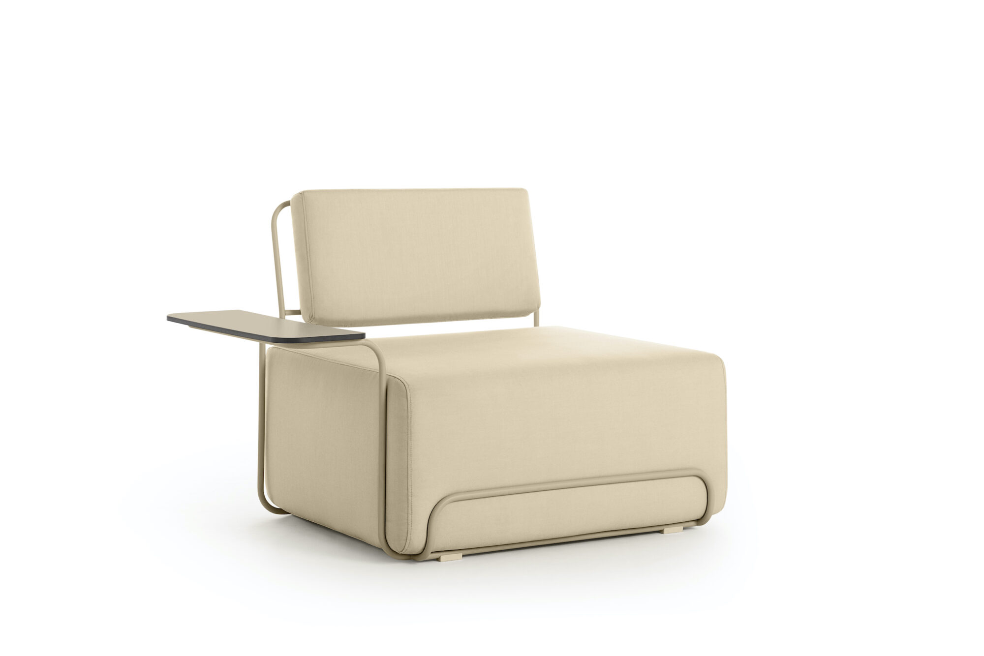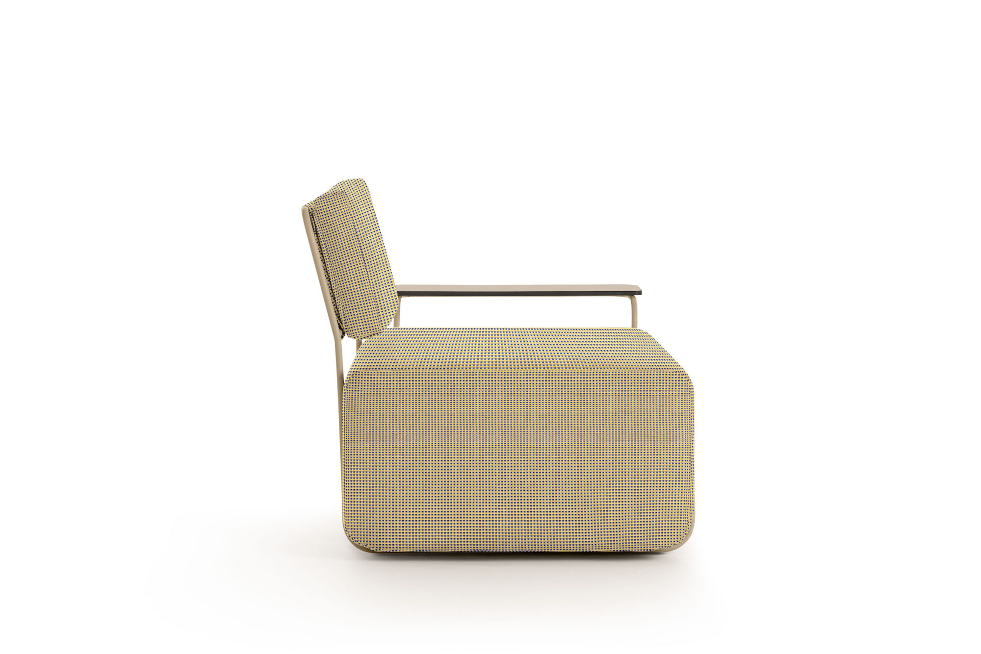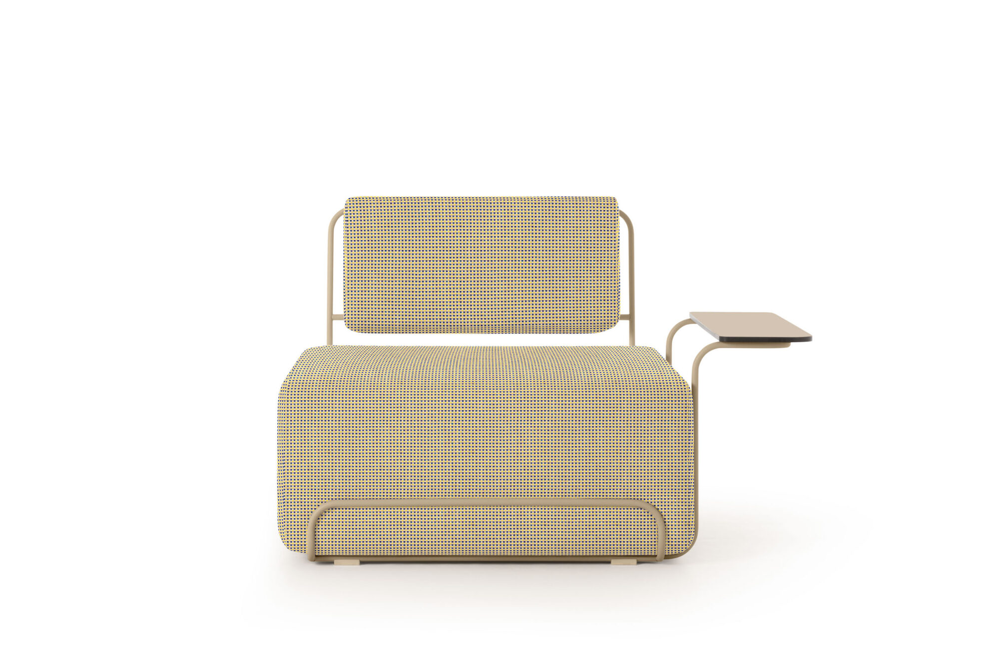 The Lilly lounge armchair is an exclusive designer furniture item with a modular character whose base is made of square foam rubber blocks arranged on an undulating tubular structure in powder-coated steel with an original arm in the shape of a small table. Its upholstery is removable and made of waterproof fabric.