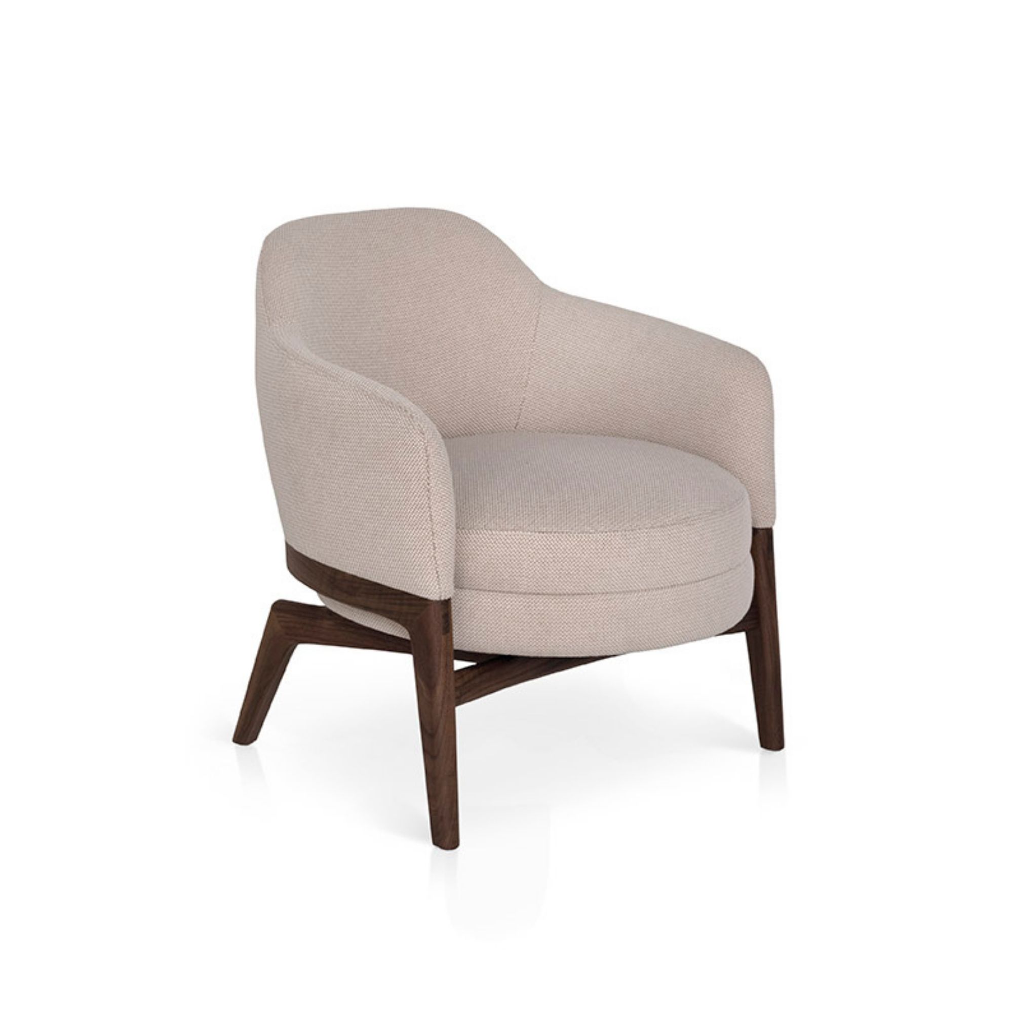 The first is the shell – padded, intimate and enveloping – supported at the base by a curved wooden profile that characterises the aesthetics of the entire seat and traces a sign that ends in the front legs.