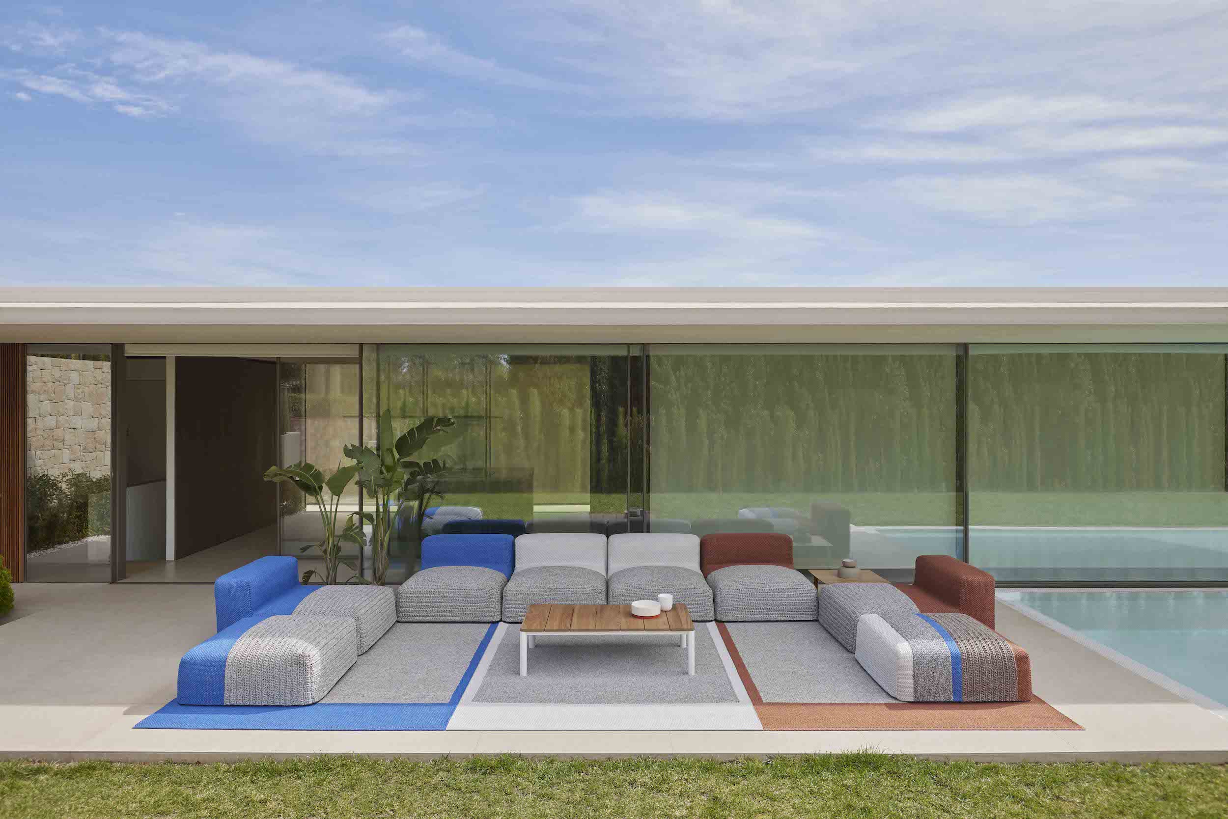 Mangas Outdoor reflects texture and comfort with materials specially designed for outdoor use, including rugs and covers made by hand with 100% recycled PET.