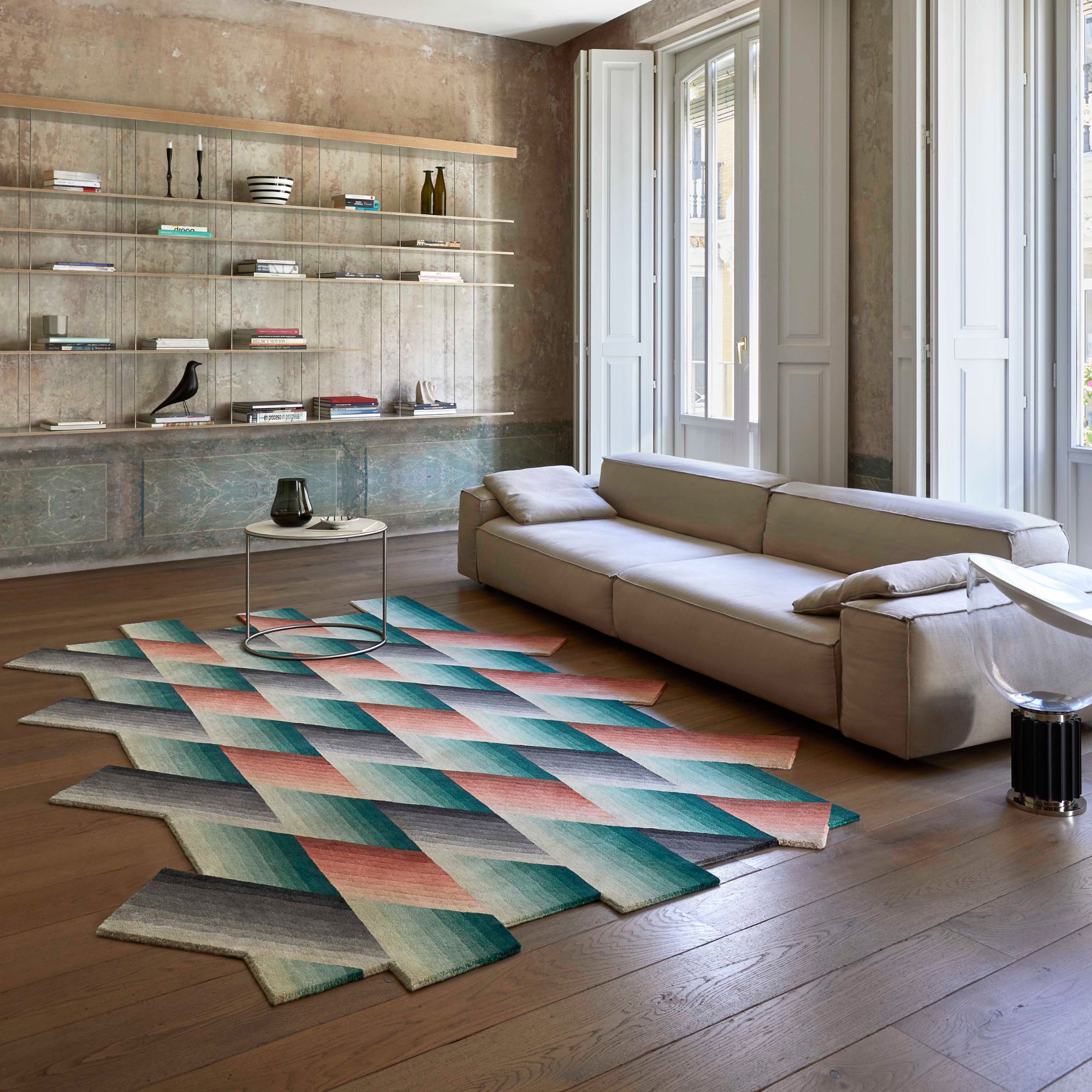 Mirage by GAN Rugs is an atypical carpet, not only because of its irregular shape, but because it generates a special effect both in the person who contemplates it and in the space it occupies.