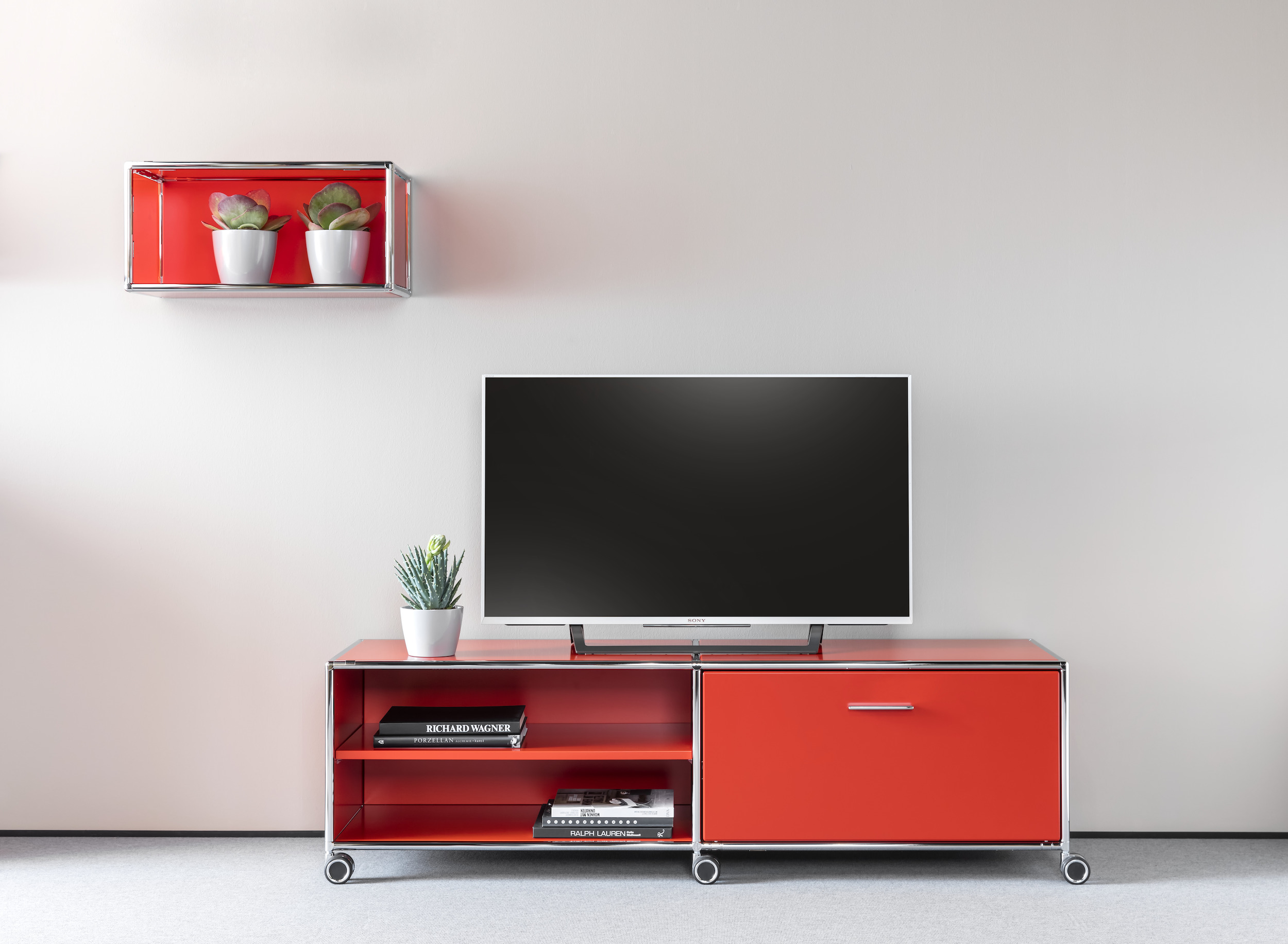 The modular system allows you to customise your furniture with drawers, flaps, hinged doors or open compartments or optional castors