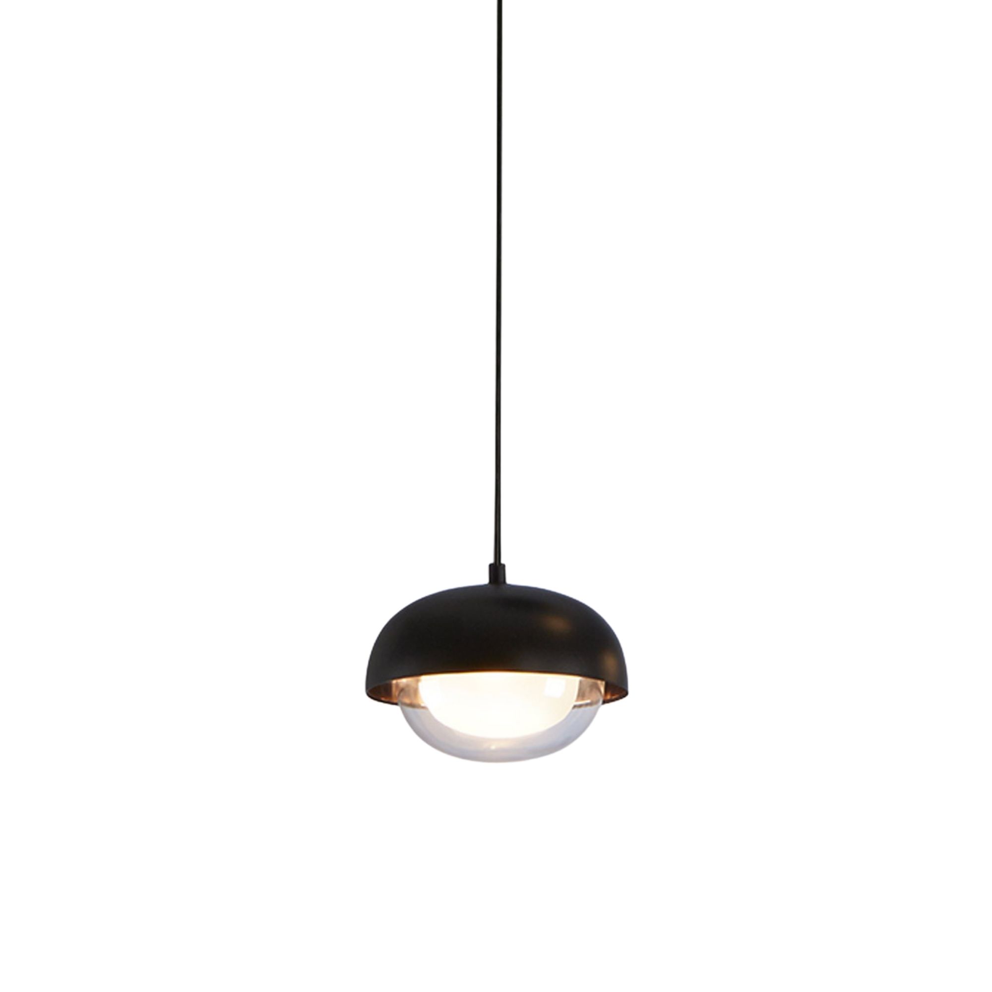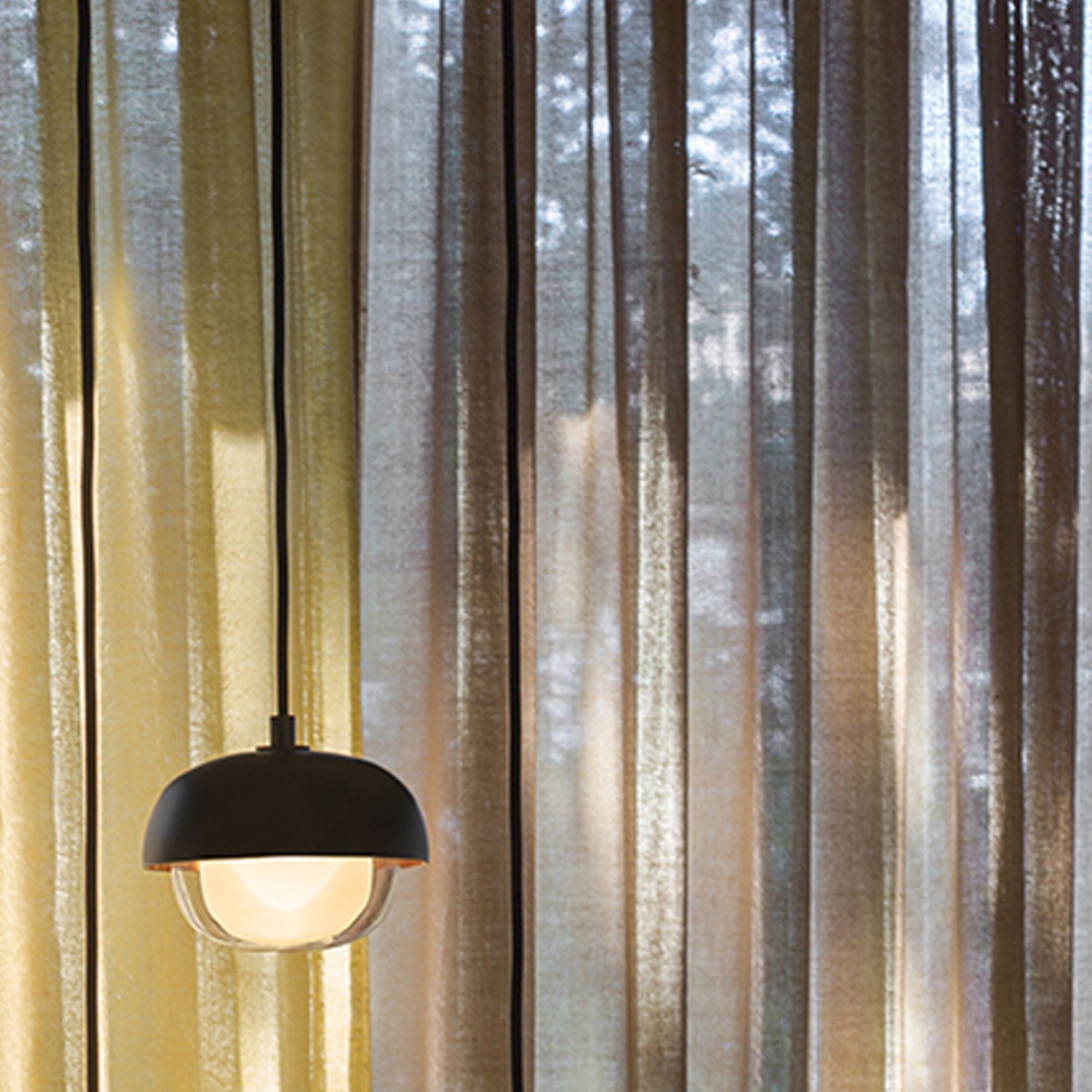 Muse Pendant by TOOY, a refined interplay of metal and glass. Muse features a double-sided borosilicate glass diffuser paired with metal domes, allowing the internal and external surfaces to be finished in contrasting colours or materials. Painted finishes can be combined with polished brass or bright copper interiors, creating rich textural depth and a distinctive decorative presence suited to residential and hospitality interiors.