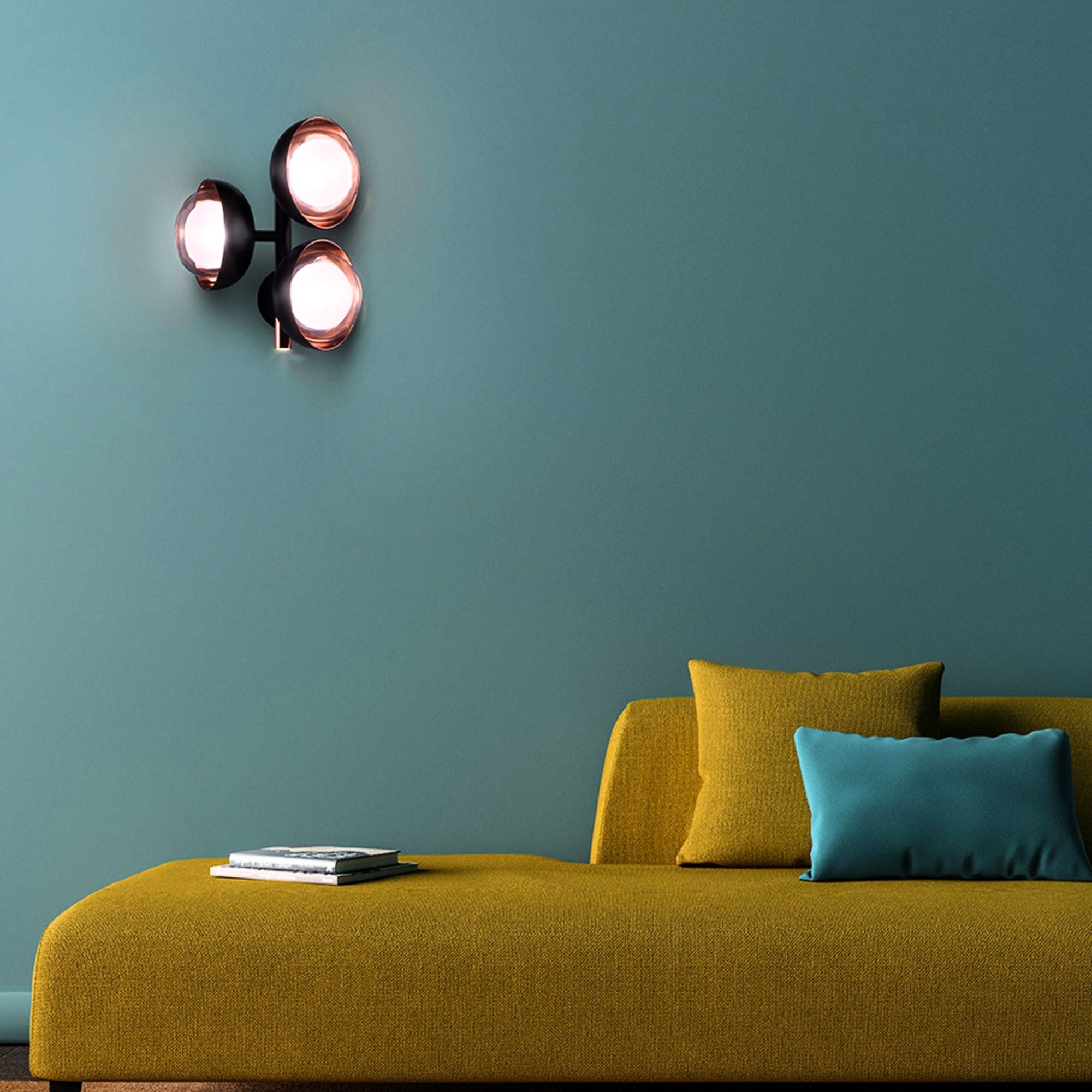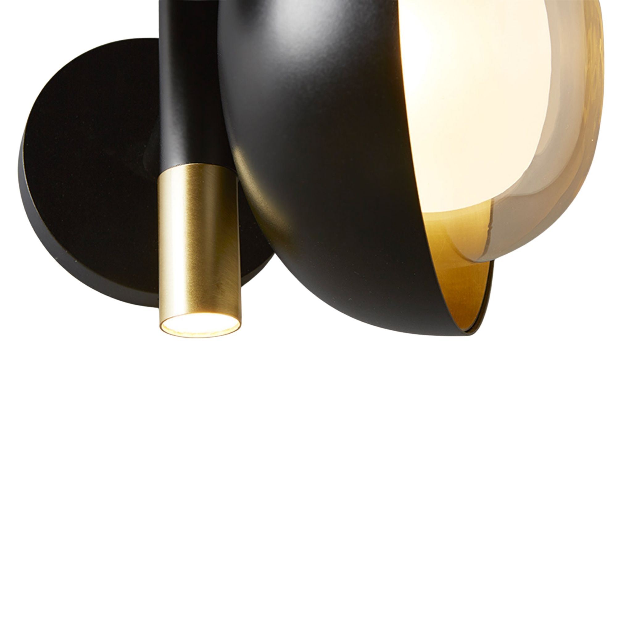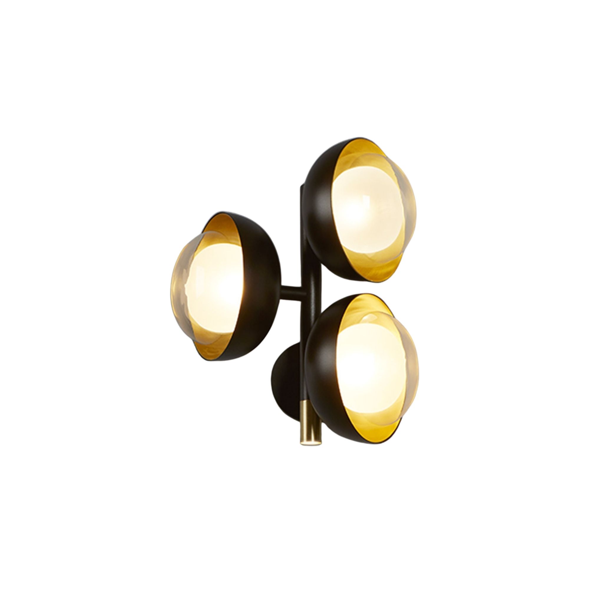 Muse Wall Sconce by TOOY. Part of the neo-vintage Muse collection, this wall light explores the expressive contrast between metal and glass through a sculptural multi-element composition. Each diffuser is formed from double-sided borosilicate glass paired with metal domes, allowing the internal and external surfaces to be finished in contrasting colours or materials. The wall version integrates an additional G9 light source positioned in the lower part of the fitting, enhancing both decorative depth and functional illumination for residential and hospitality interiors.
