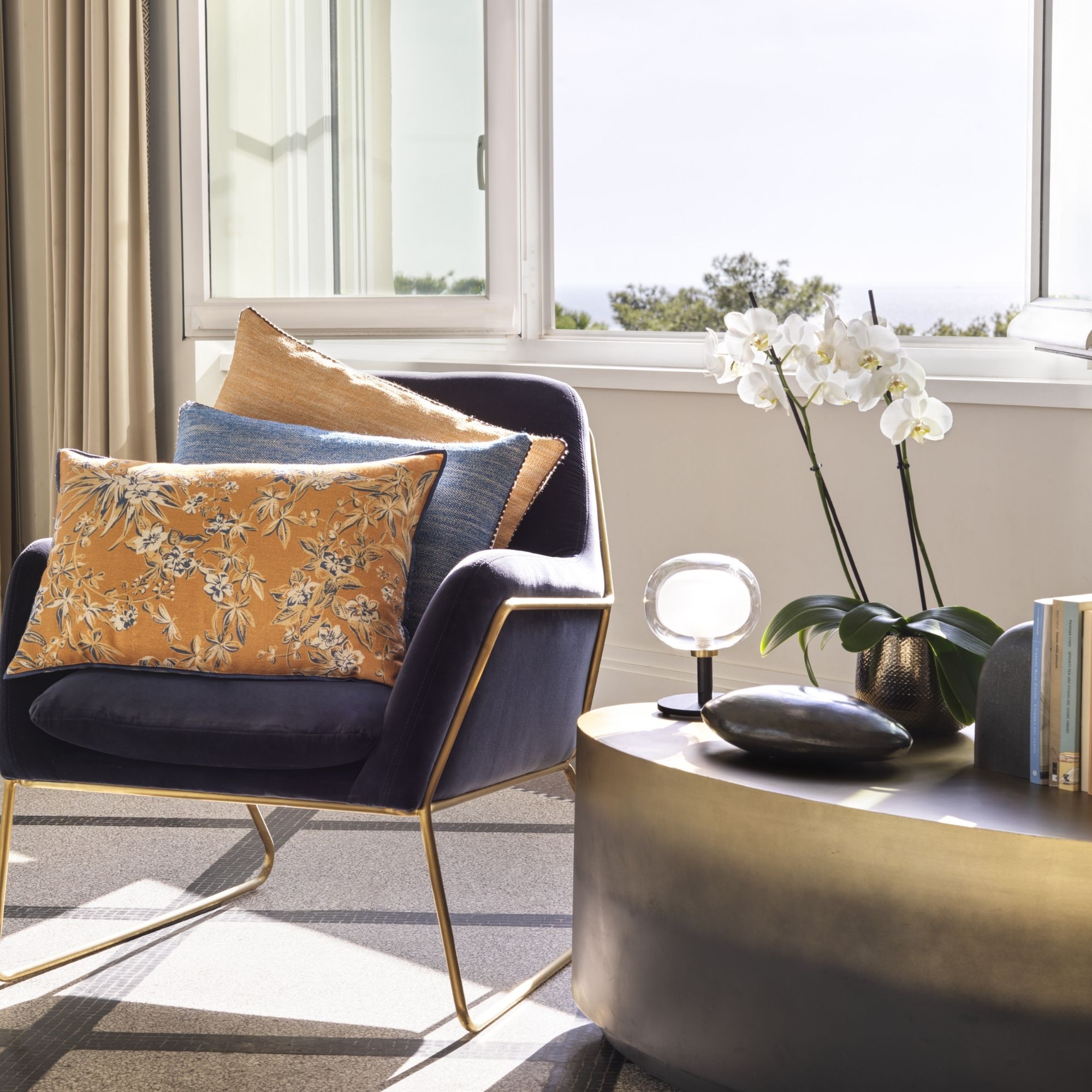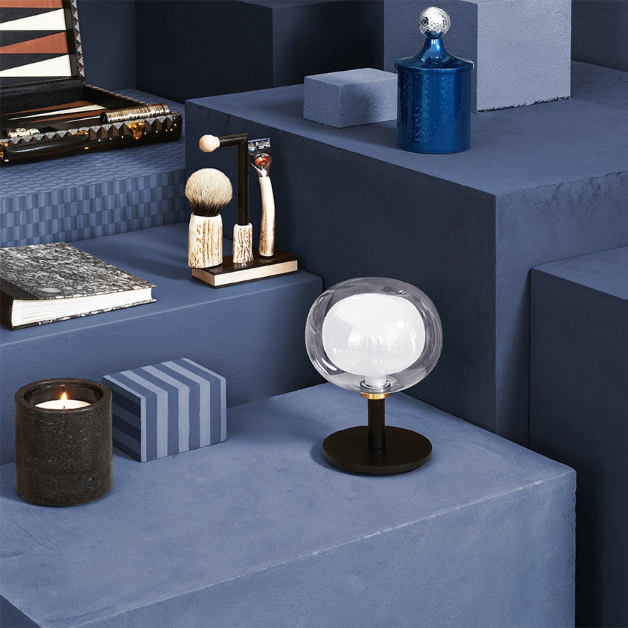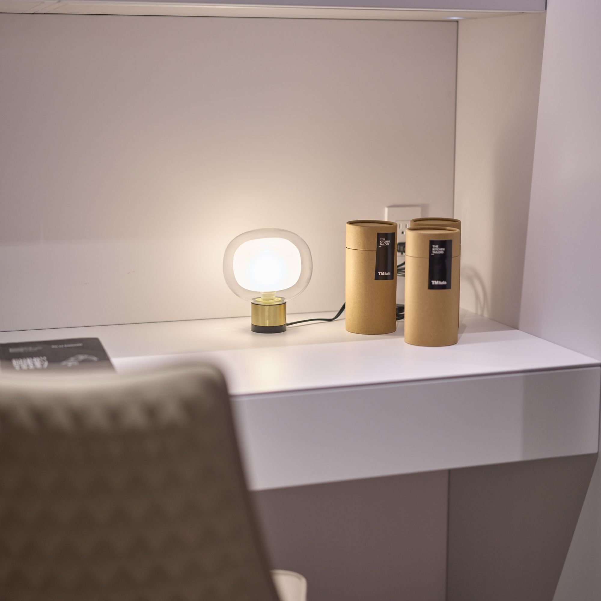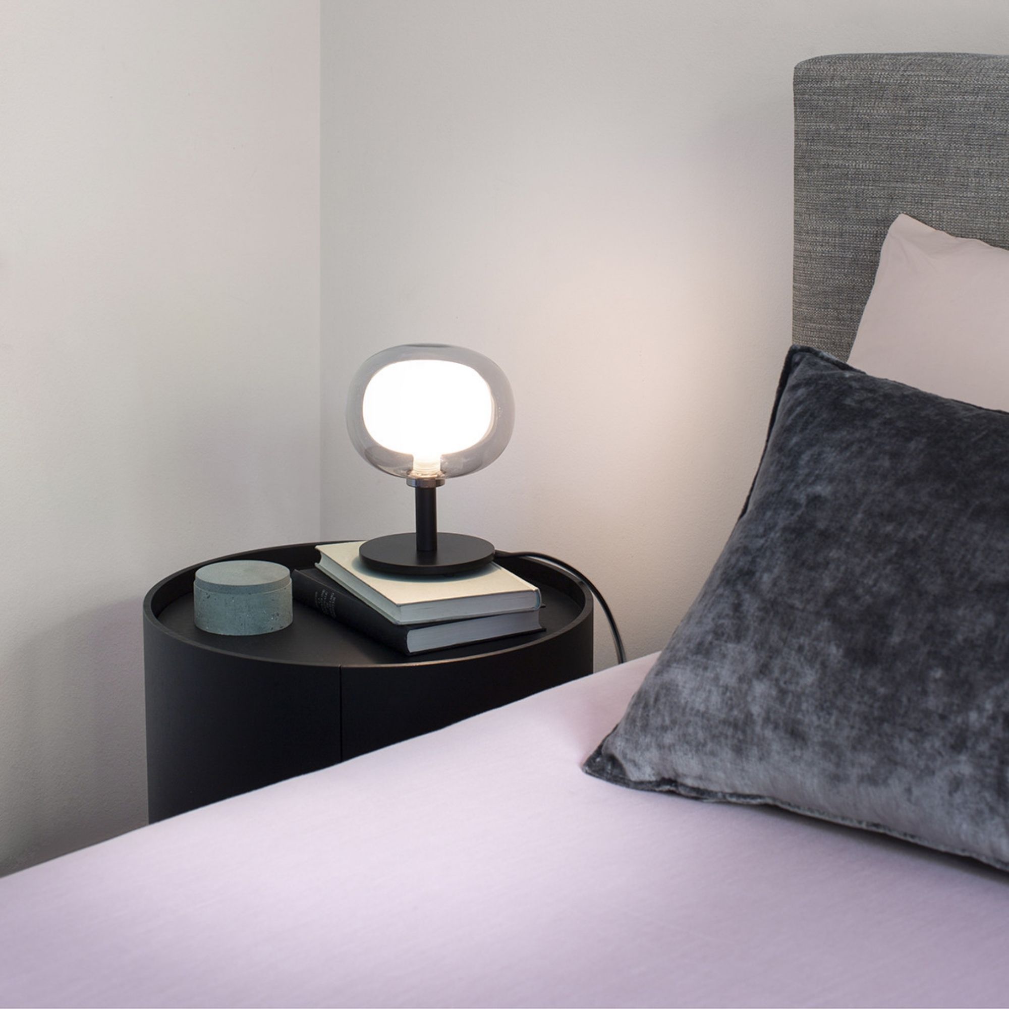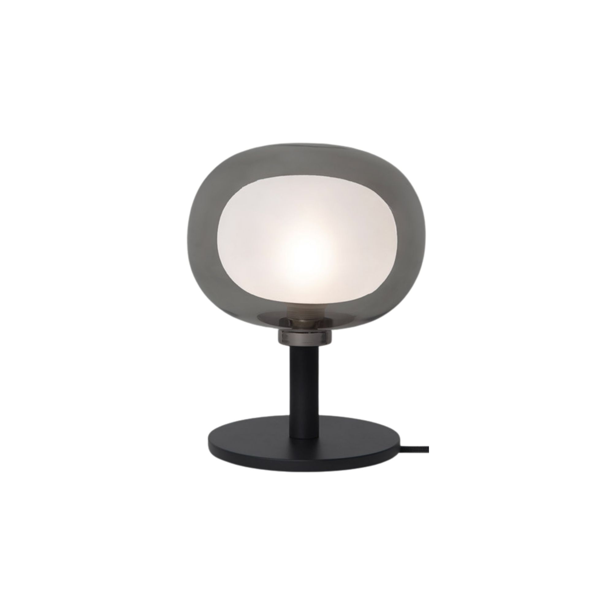 Nabila Side Table Lamp by TOOY features a double sided borosilicate glass diffuser paired with a refined metal structure in brushed brass or black chrome. Its soft, sculptural form provides a warm, diffused glow while maintaining a compact footprint suitable for bedside tables, shelving, reception areas, and accent furniture.