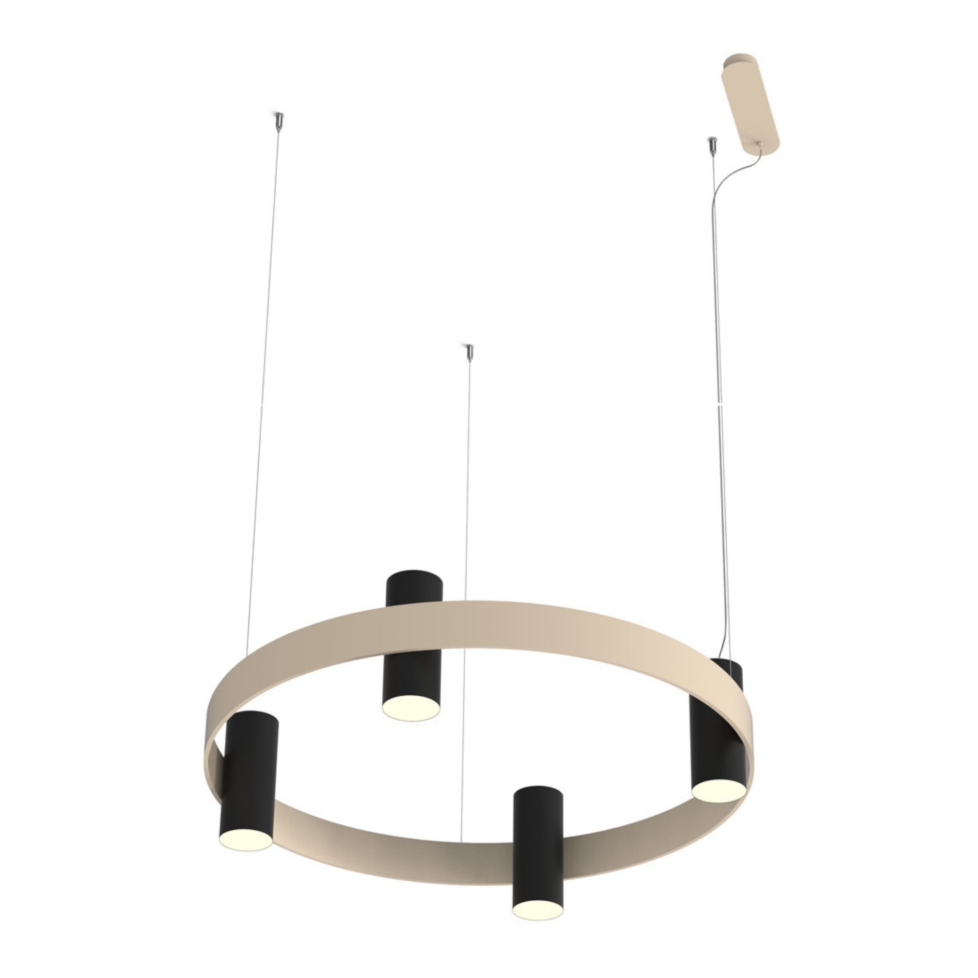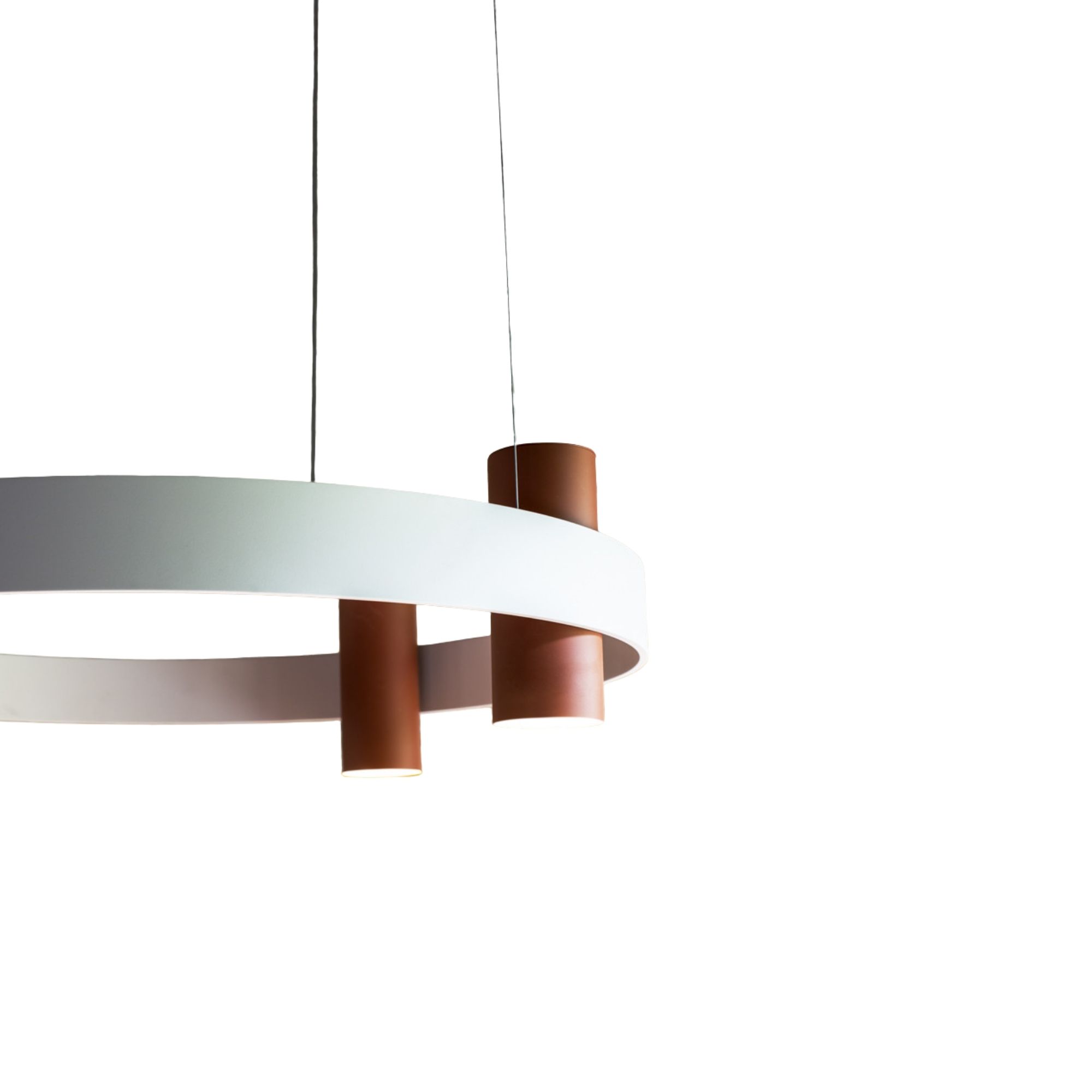 Nastro Chandelier by TOOY features a circular aluminium band structure balanced by cylindrical weights and illuminated by integrated LED sources. Its clean architectural silhouette and soft diffused light make it suitable for residential and commercial interiors. The ring form is available in multiple diameters, with light cylinders positioned within the band to create a refined and contemporary composition.