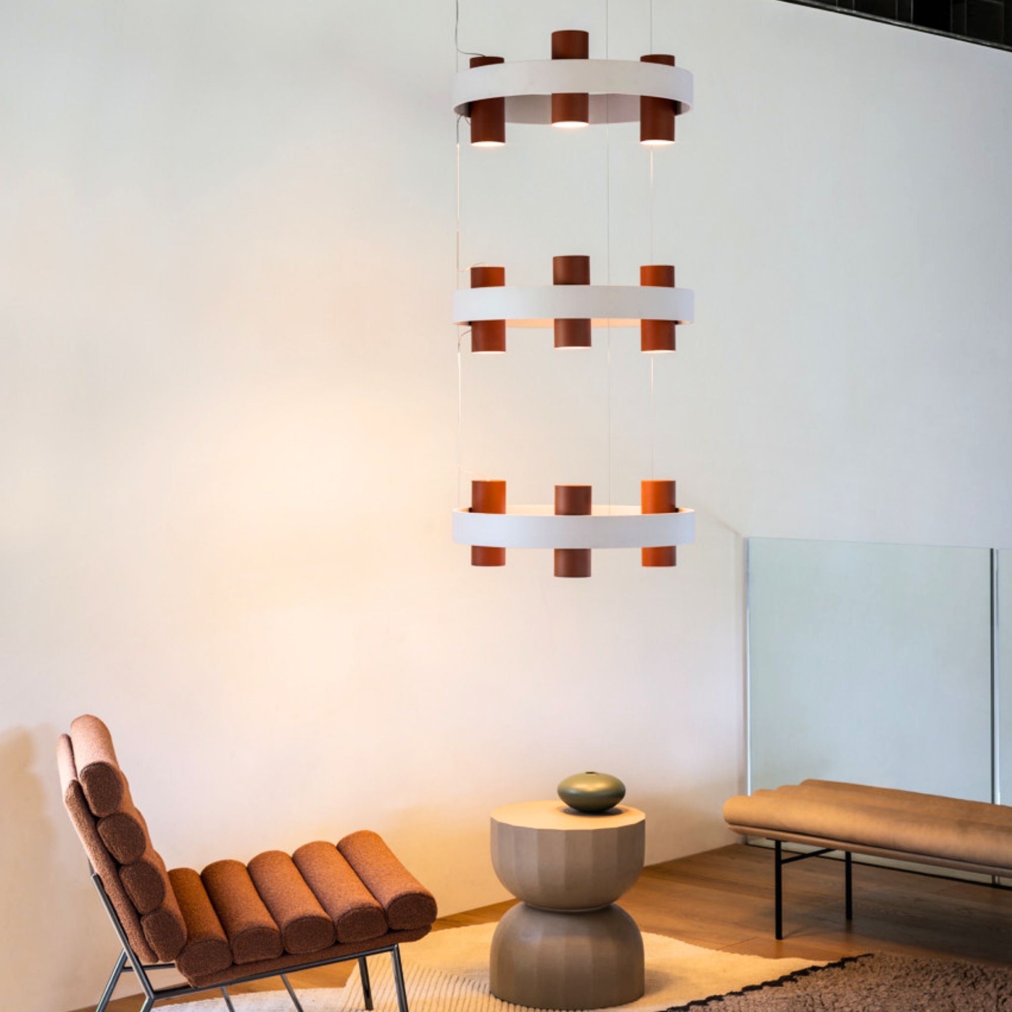 Nastro Tier Chandelier by TOOY reinterprets the balance between structure and movement through stacked circular bands in epoxy-painted aluminium, each paired with cylindrical brass light elements. The composition creates a strong scenographic presence, combining rhythm, depth and material contrast. Designed for statement residential and hospitality interiors, the chandelier features an integrated LED system with adjustable suspension cables for on-site configuration.