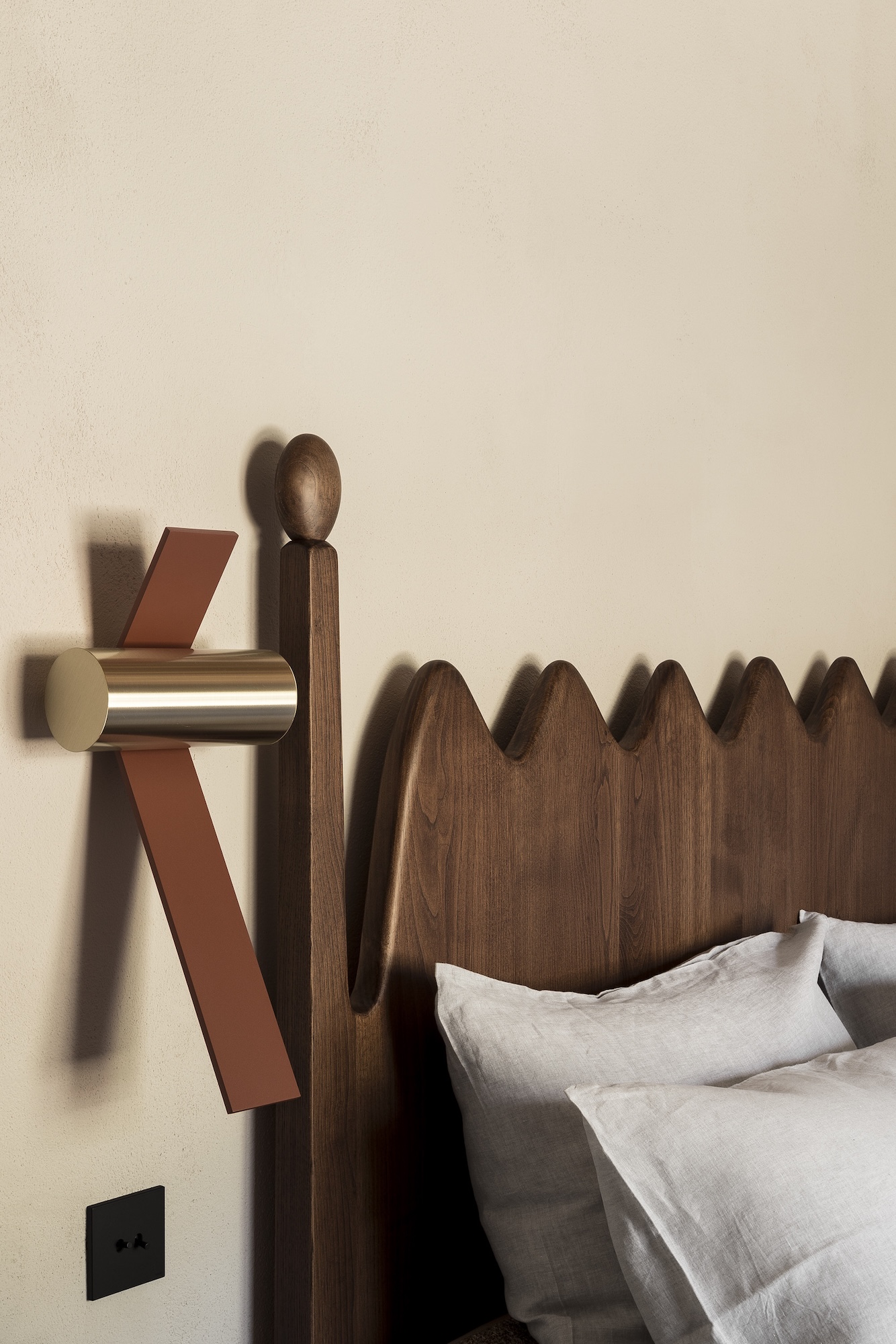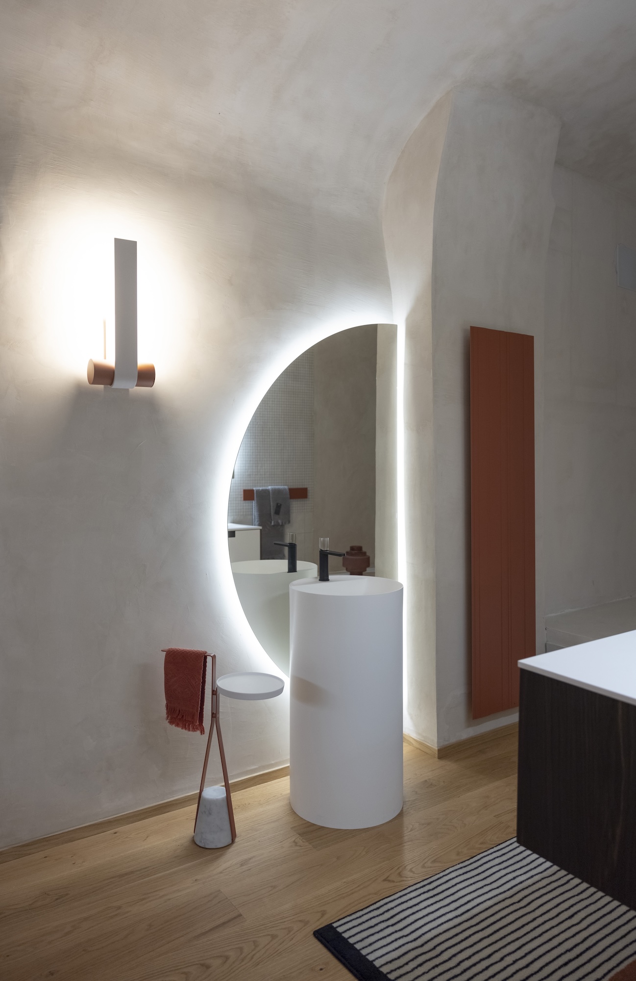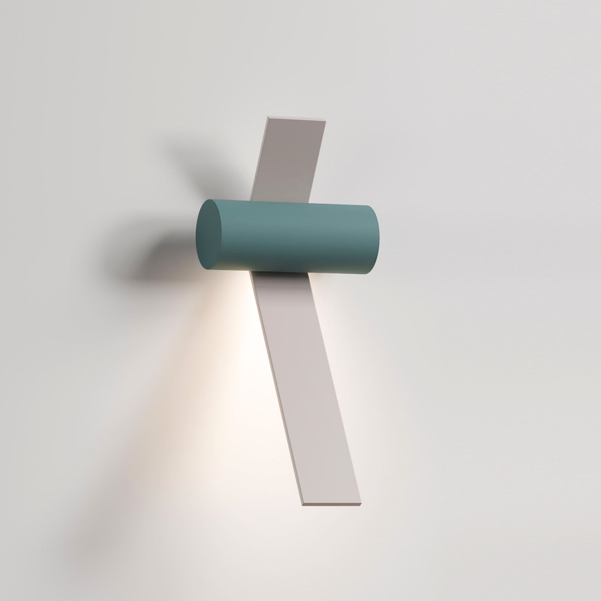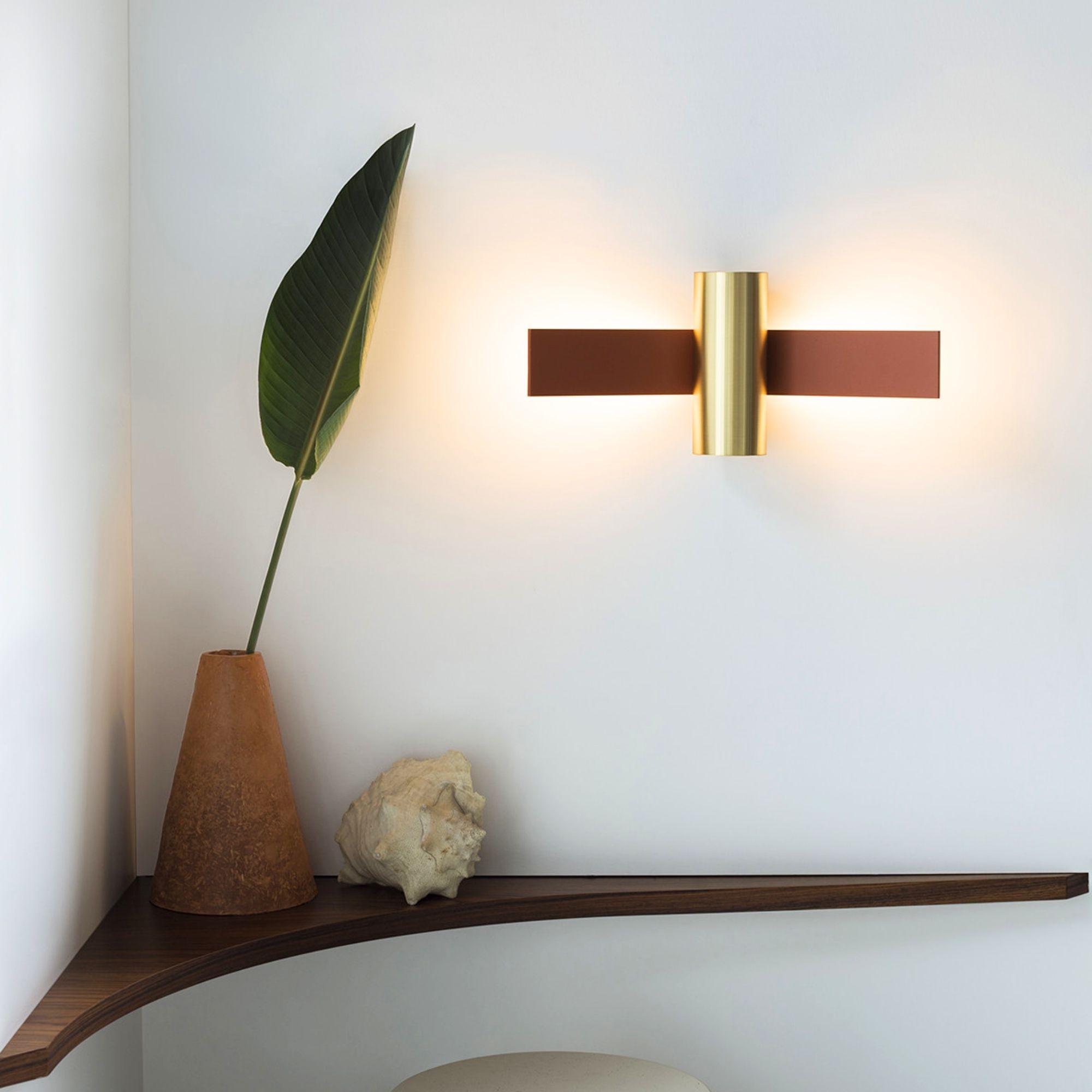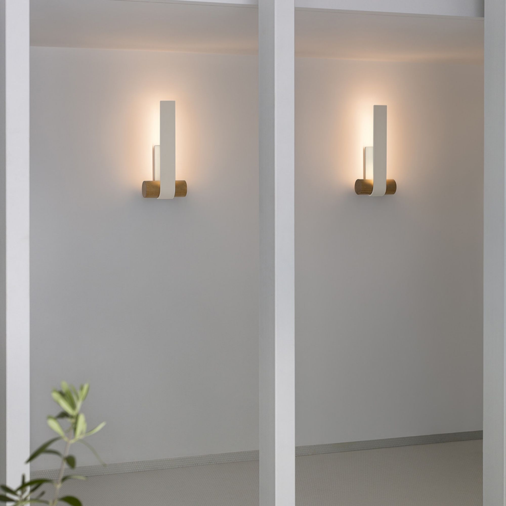 Nastro Wall Sconce by TOOY features an epoxy powder coated aluminium band structure balanced by a cylindrical weight, creating a refined visual equilibrium. The integrated dimmable LED strip emits a soft, diffused light, while the sculptural form allows installation in multiple orientations depending on the version.