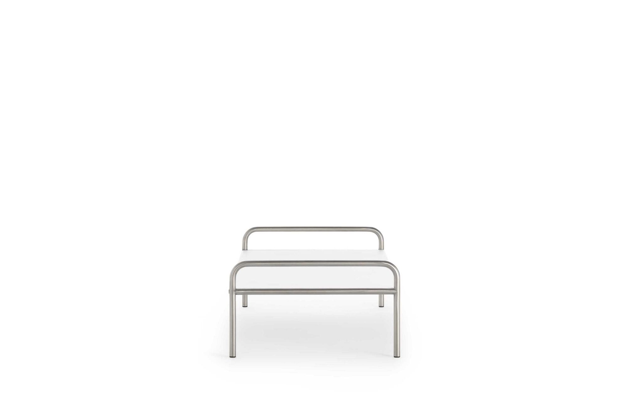 Onsen coffee table by Gandiablasco has a structure made of satin stainless steel tubes with no additional coatings, keeping the natural state of the material.