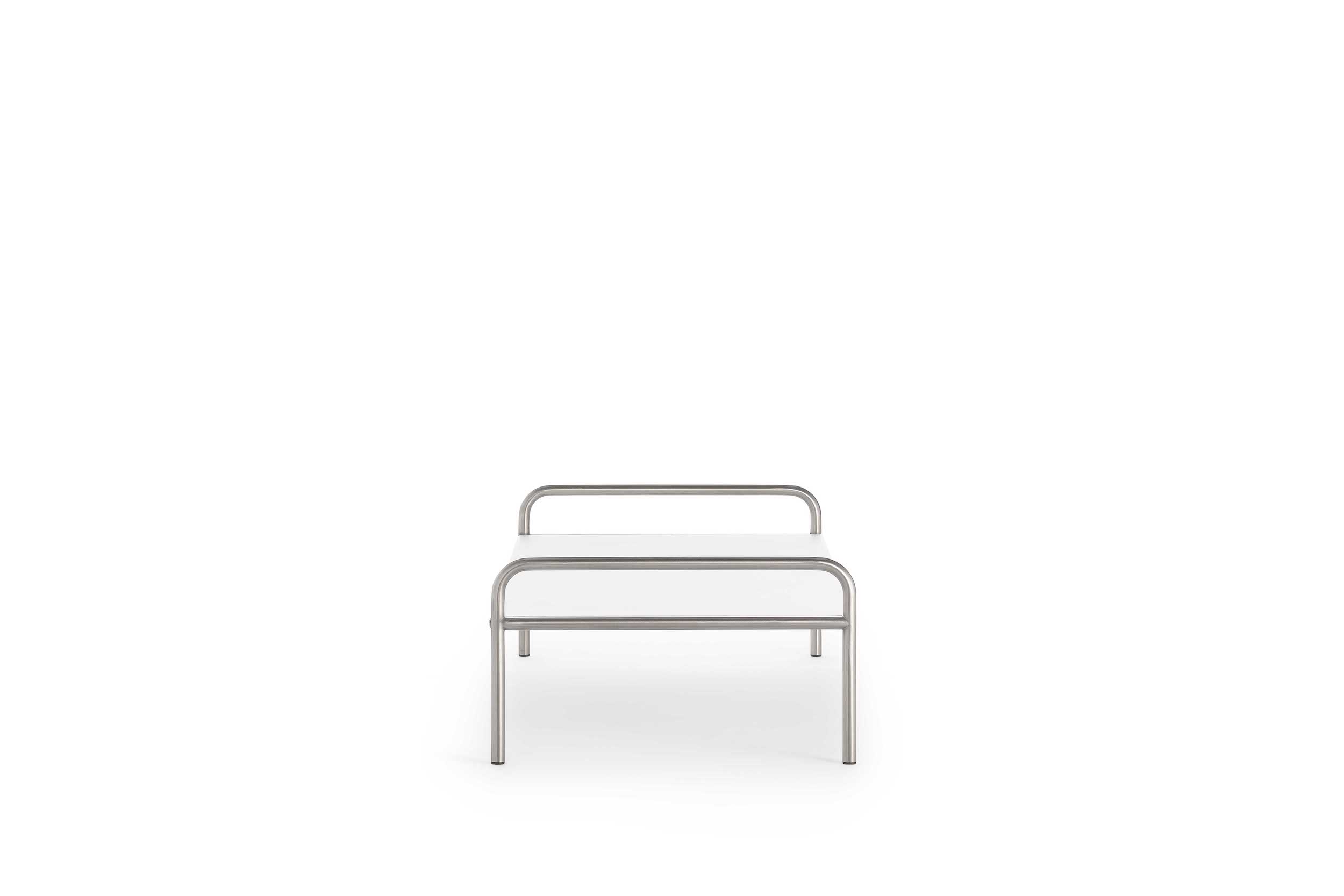 Onsen Coffee Table by Gandiablasco has a structure made of satin stainless steel tubes with no additional coatings, keeping the natural state of the material.