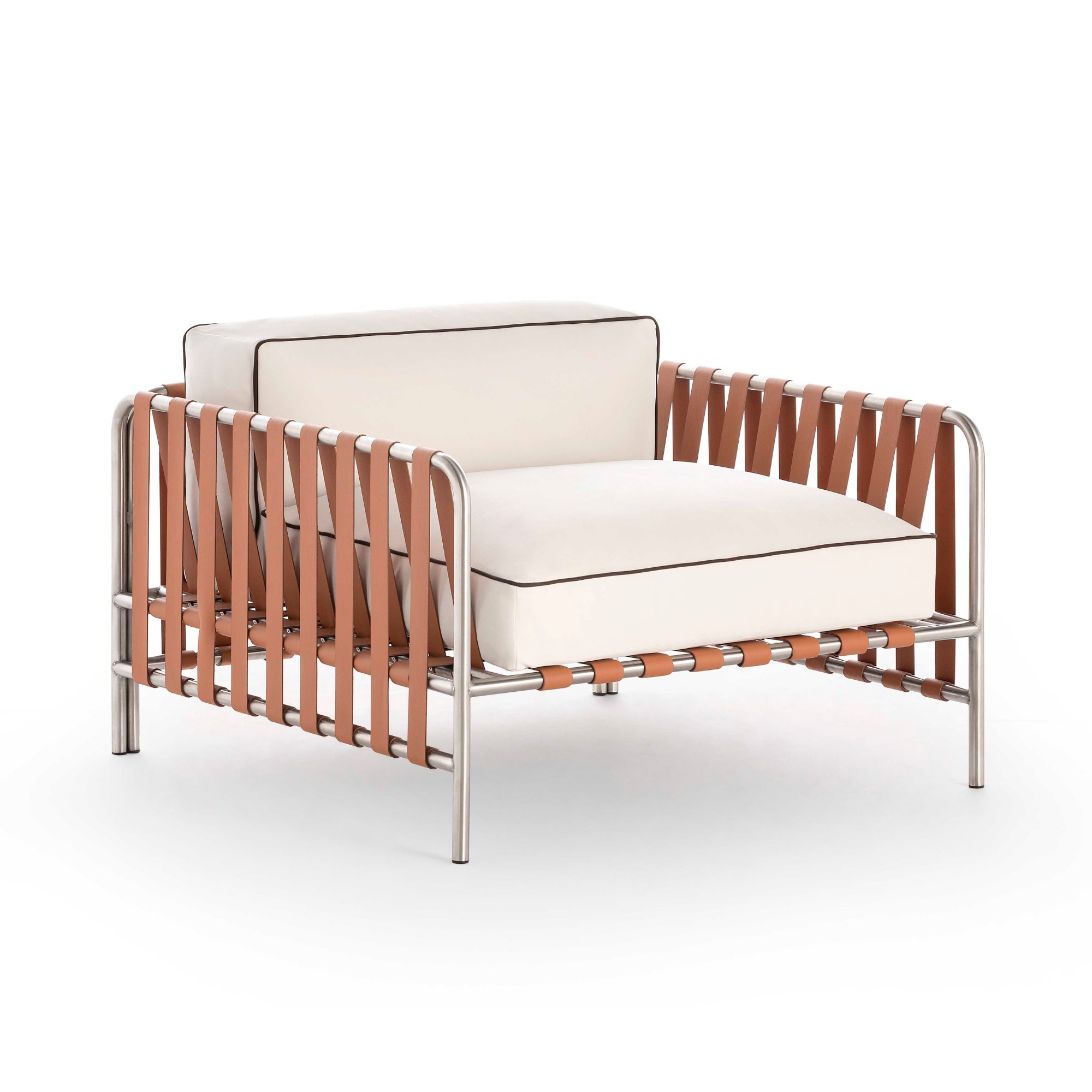 Onsen lounge chair by Gandiablasco is designed with a structure made from natural stainless steel tubes, without any additional treatments.