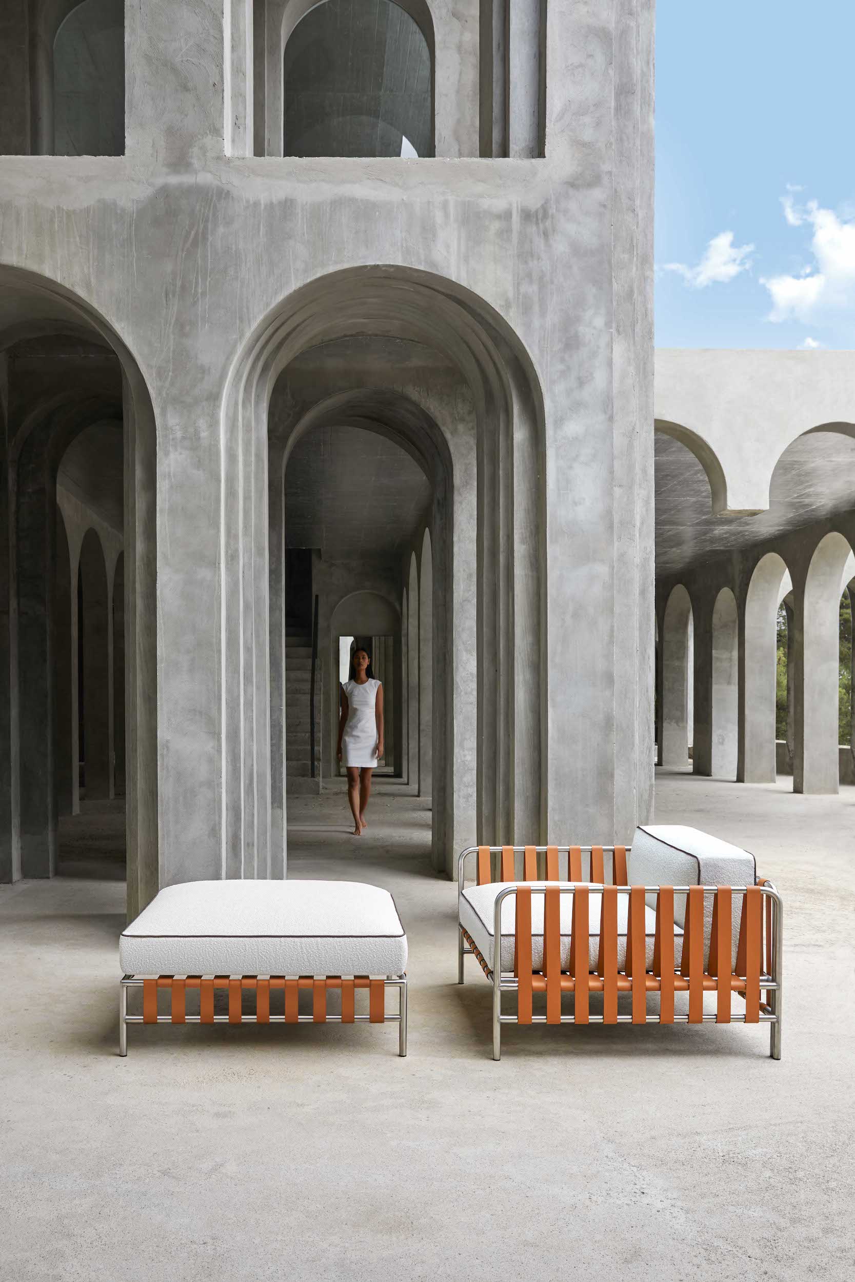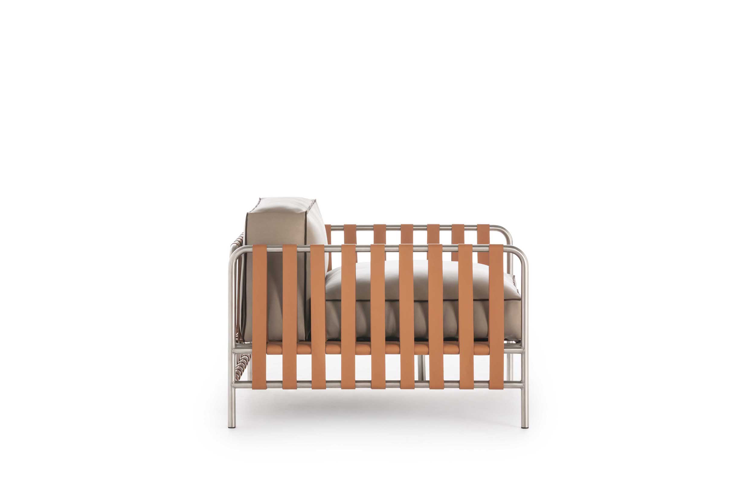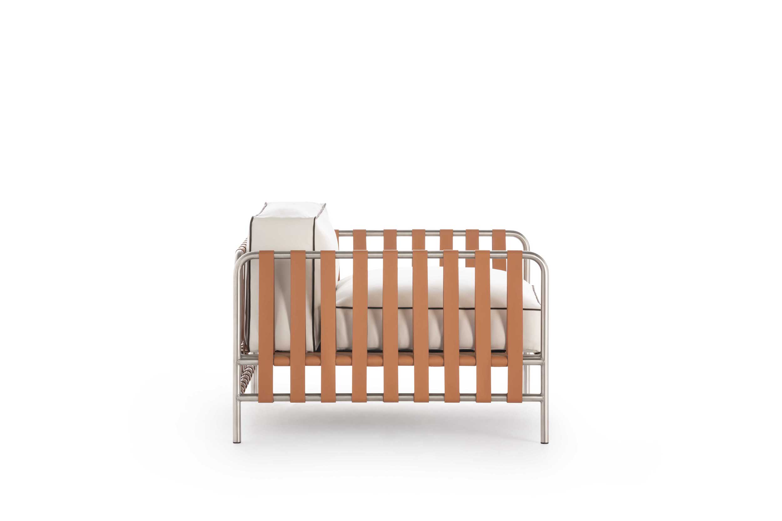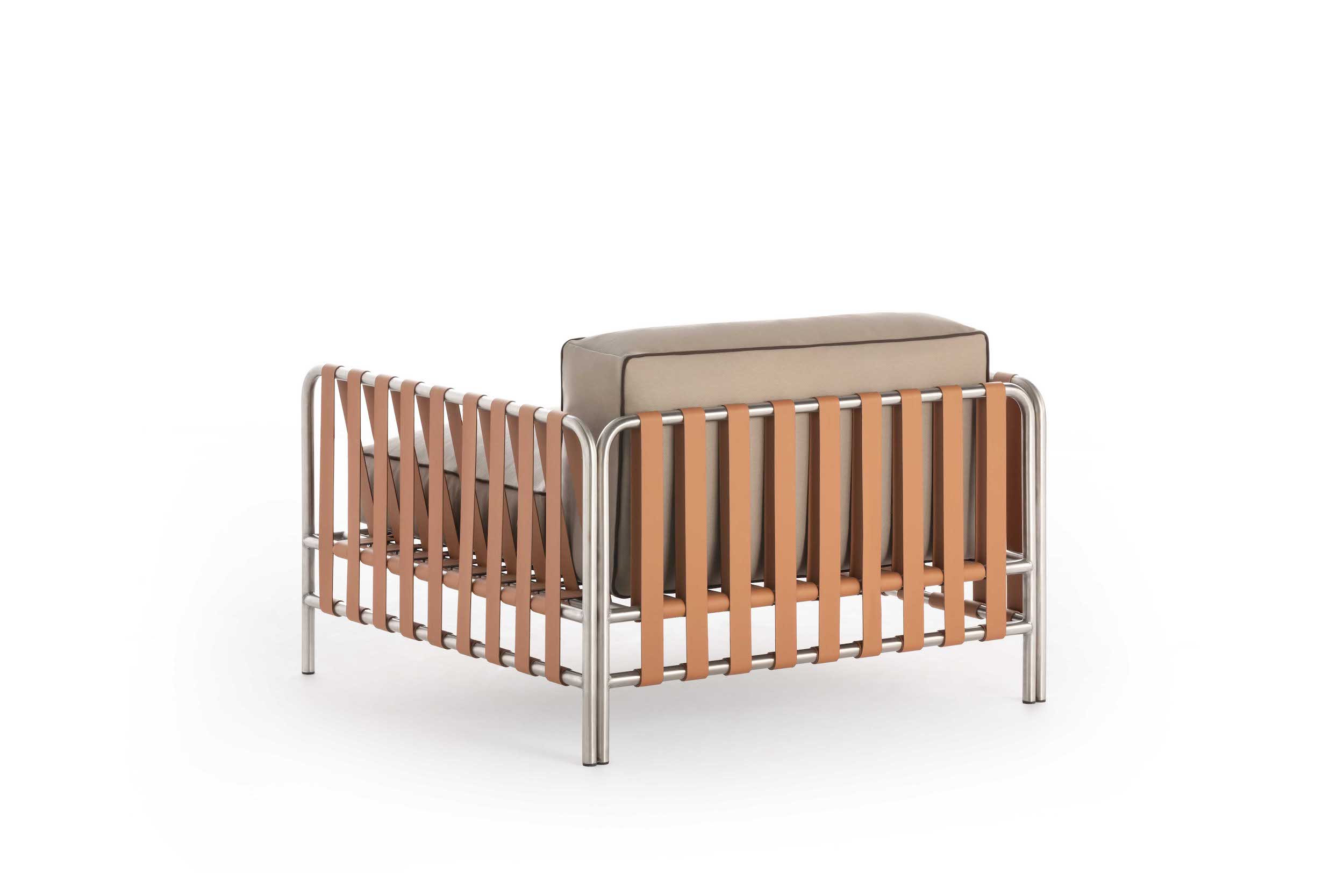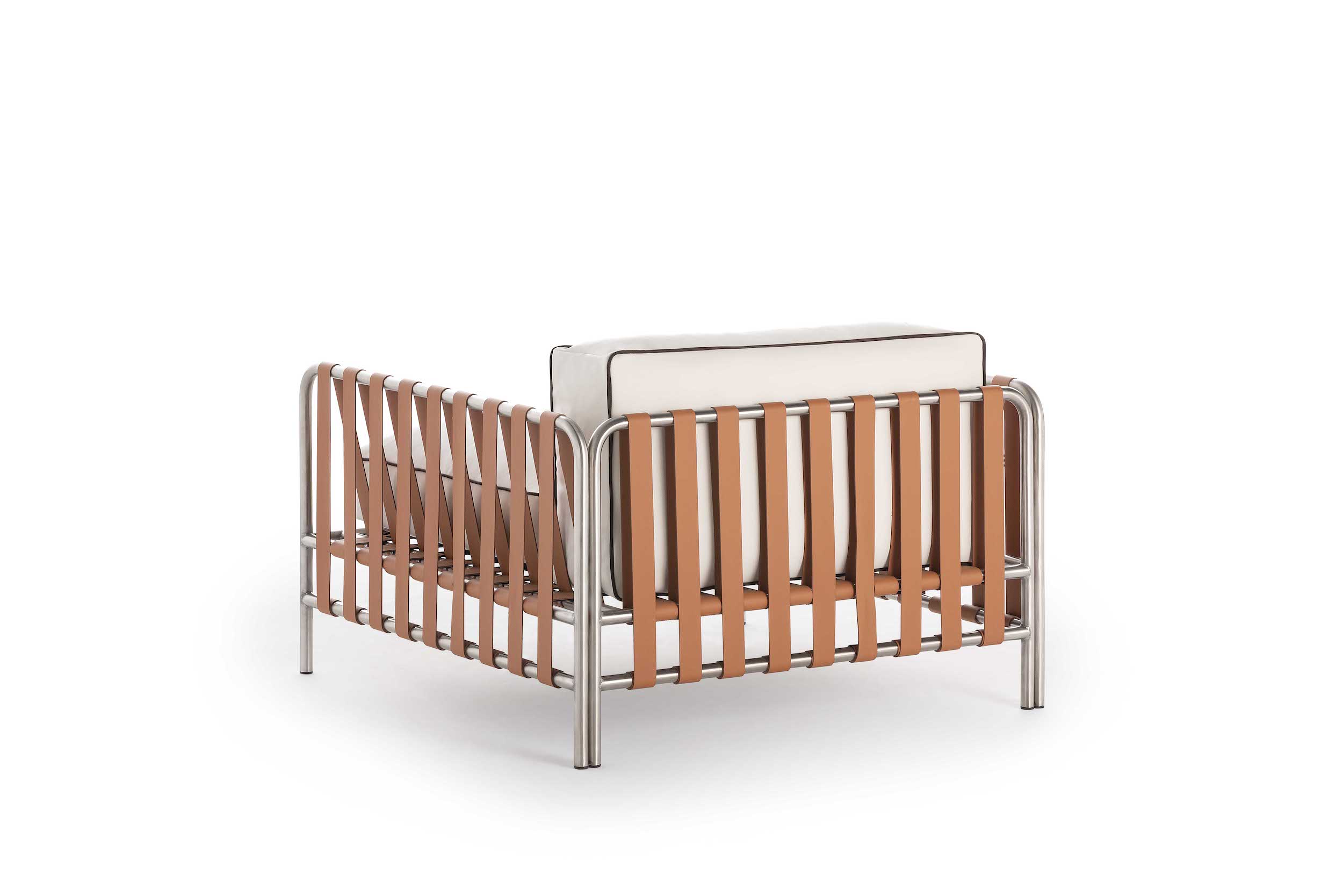 Onsen Lounge Chair by Gandiablasco is designed with a structure made from natural stainless steel tubes, without any additional treatments. The straps that connect its arms, backrest, and seat are made of a vinyl material that resembles leather but is more resistant, giving this chair great functionality.