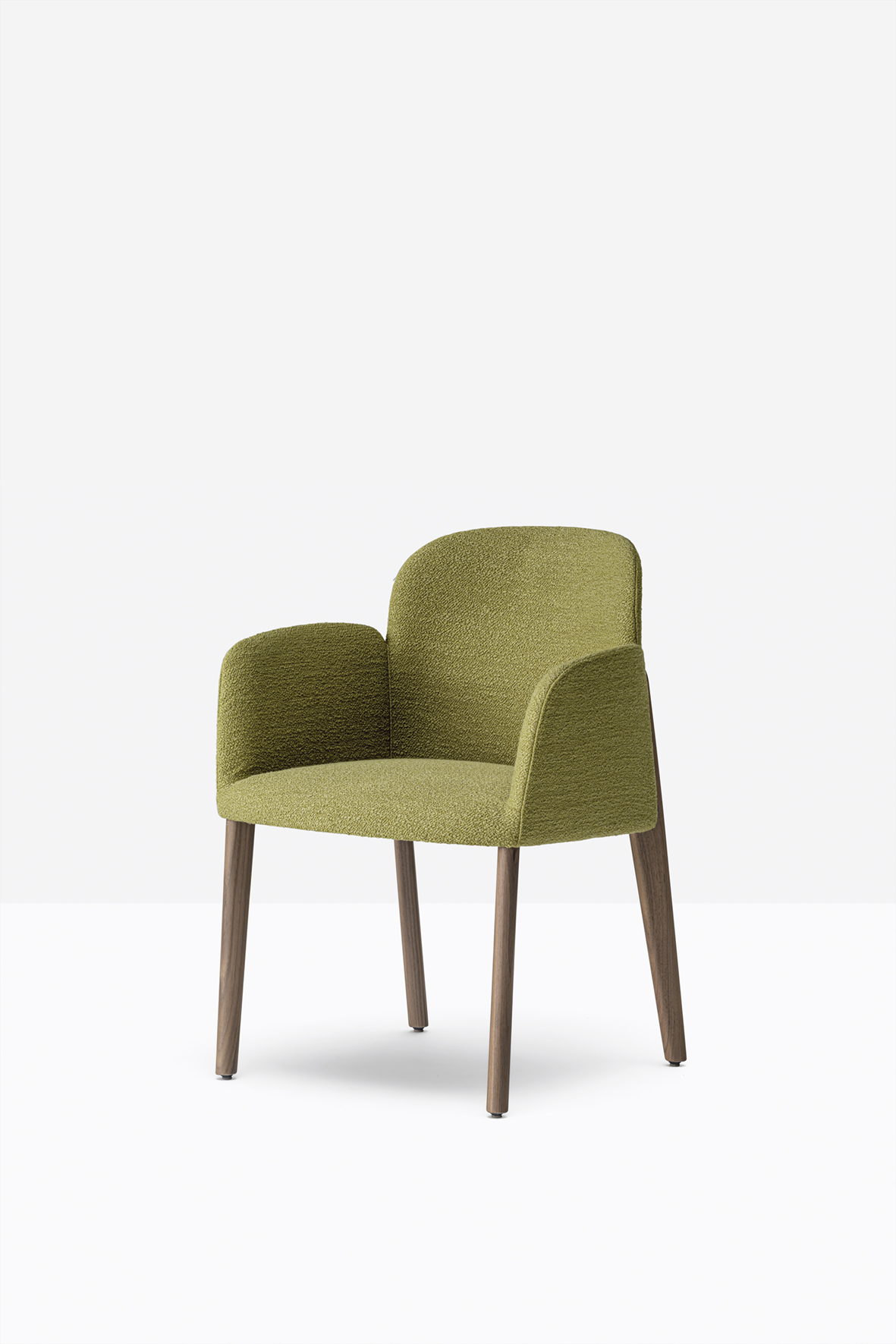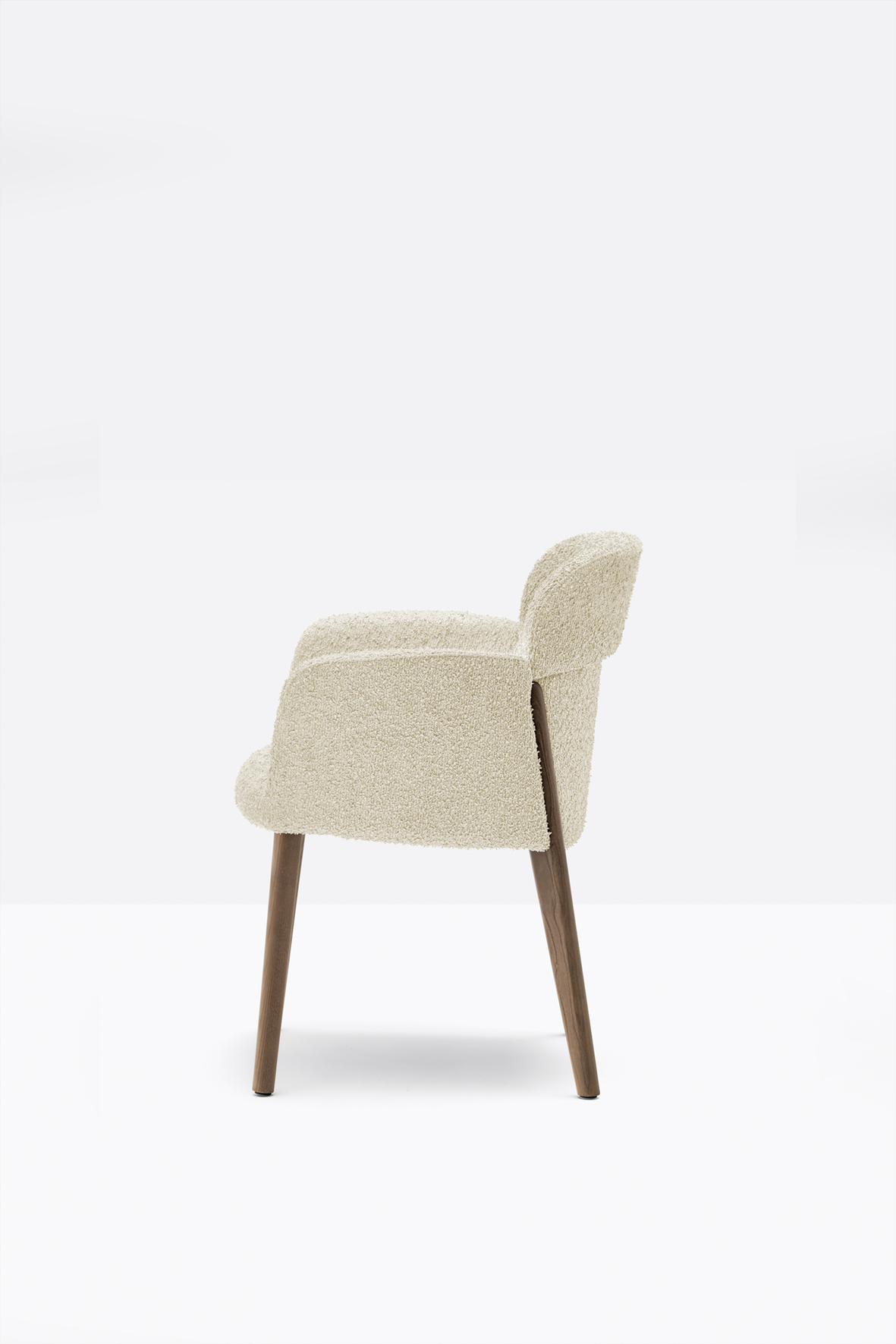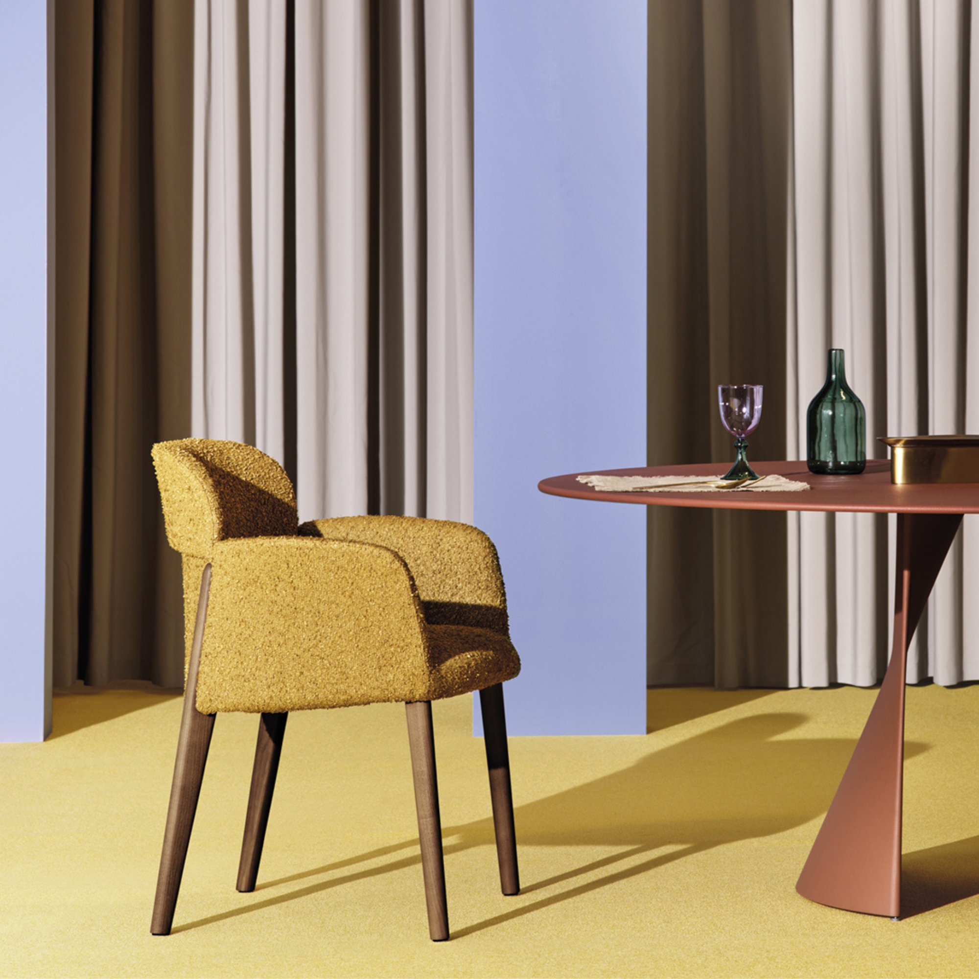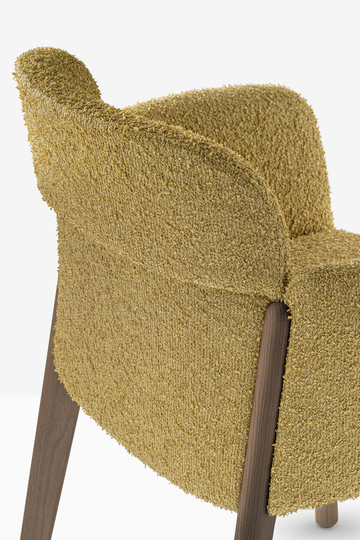 Its shapes are soft and organic. The junction of the leg, armrest and backrest forms a subtle joint that defines the core of the chair’s silhouette. The oval shape of the solid ash wood or walnut legs gradually tapers downwards into a round section. The seat features elastic belts, while the backrest and armrests, made of injected polyurethane foam, ensure balanced proportions. A functional handle integrated into the rear of the backrest blends into the armchair’s silhouette, enhancing its three-dimensional look.