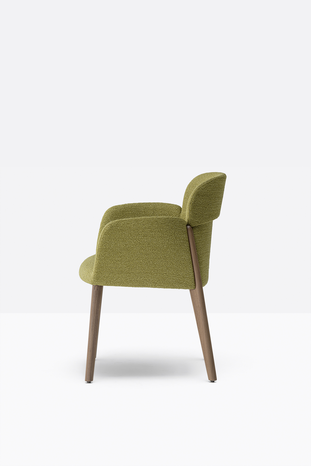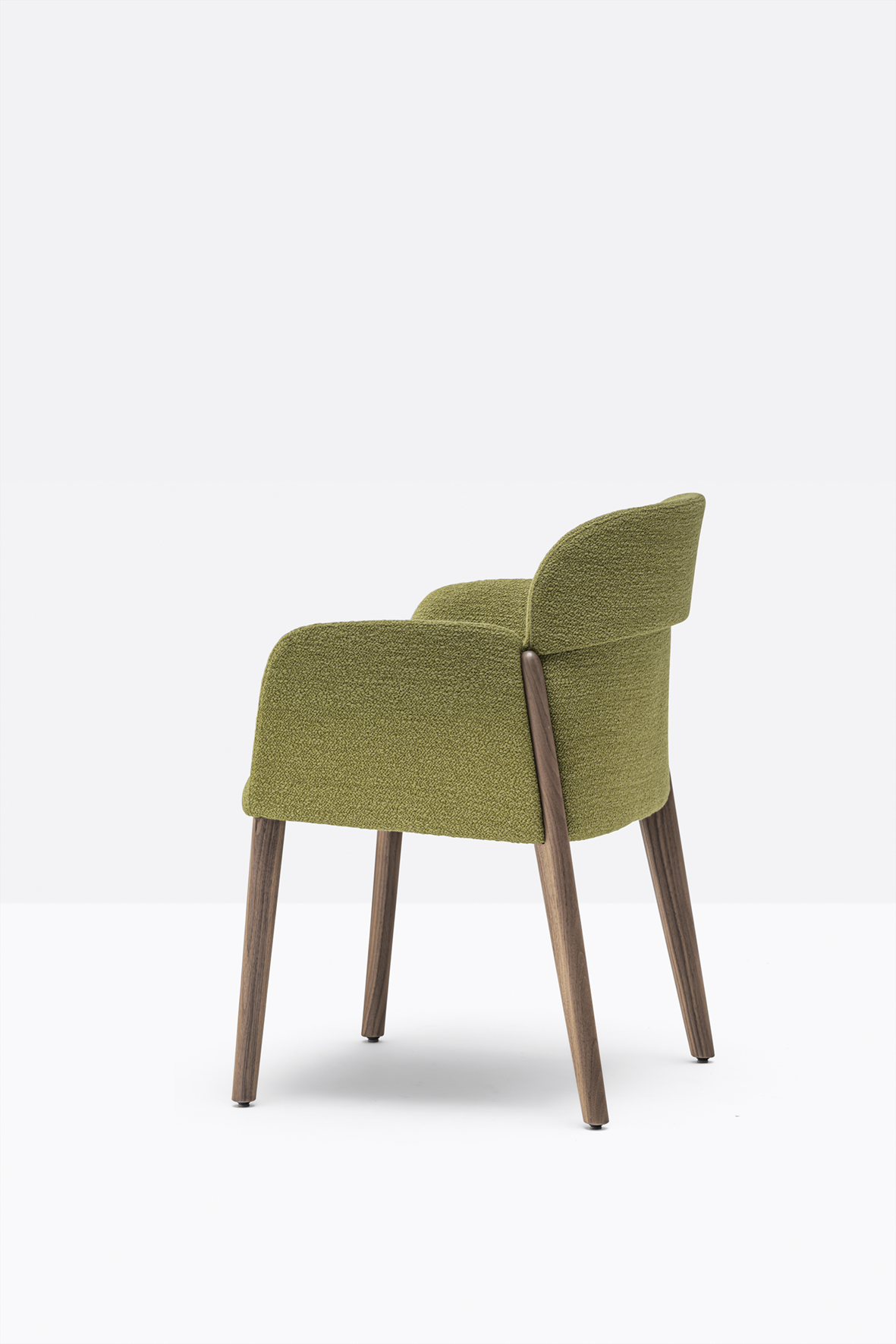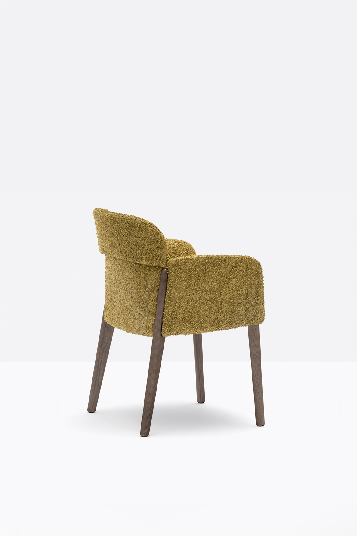 Its shapes are soft and organic. The junction of the leg, armrest and backrest forms a subtle joint that defines the core of the chair’s silhouette. The oval shape of the solid ash wood or walnut legs gradually tapers downwards into a round section. The seat features elastic belts, while the backrest and armrests, made of injected polyurethane foam, ensure balanced proportions. A functional handle integrated into the rear of the backrest blends into the armchair’s silhouette, enhancing its three-dimensional look.