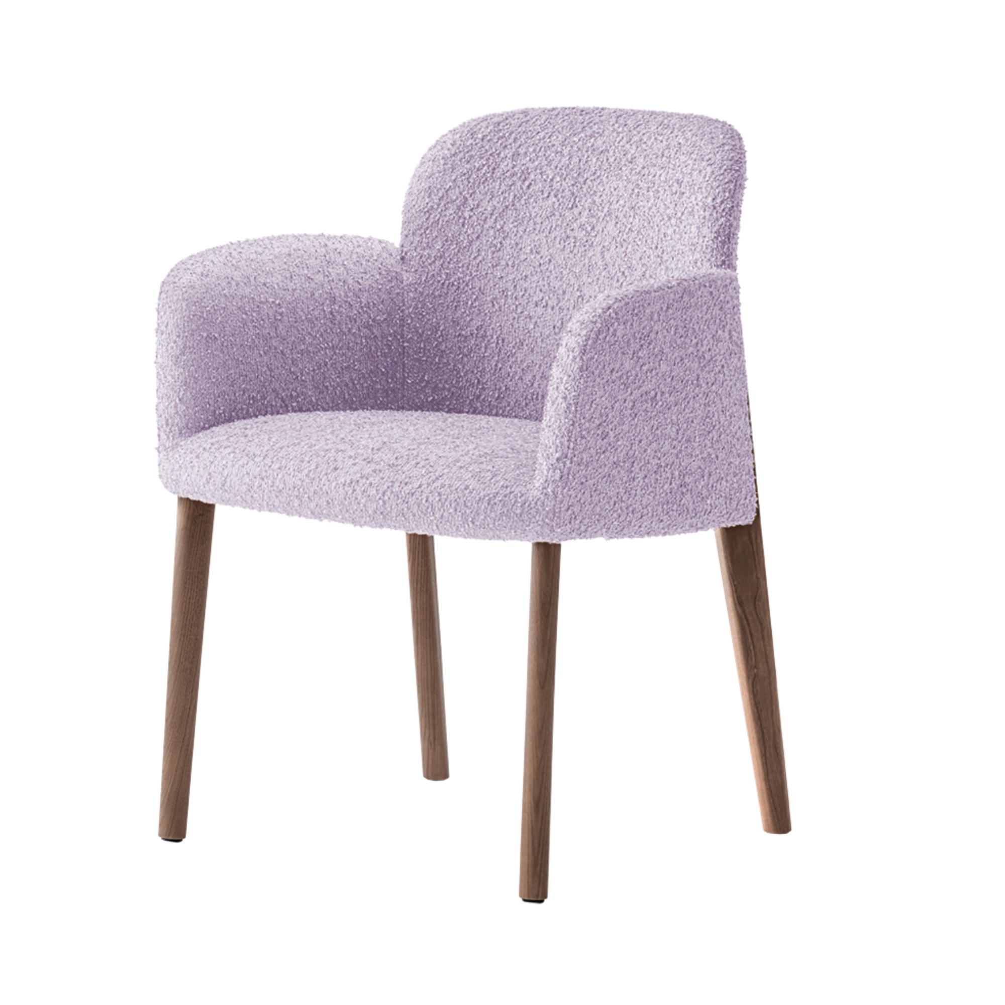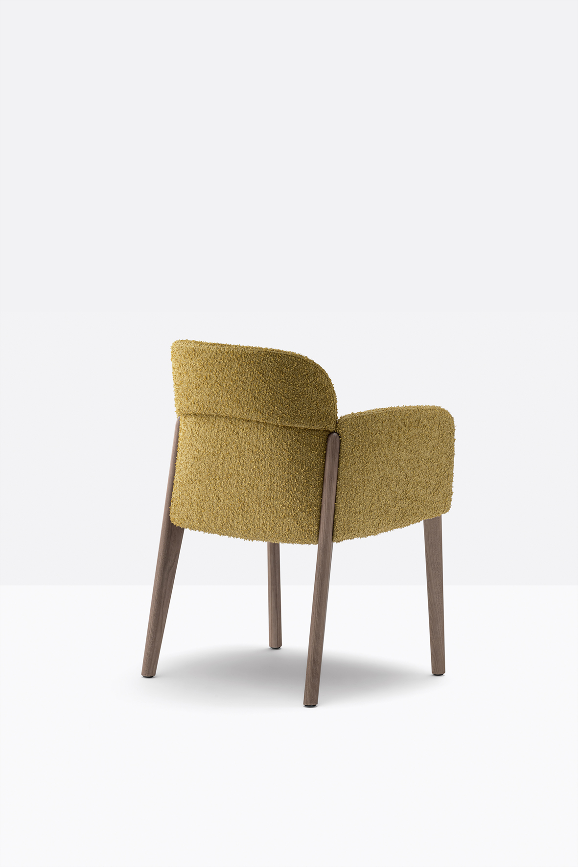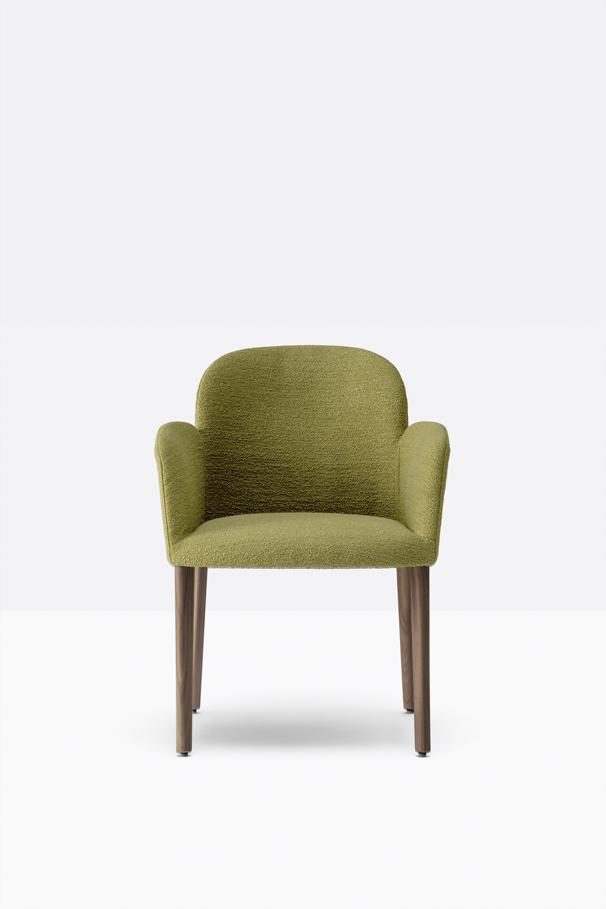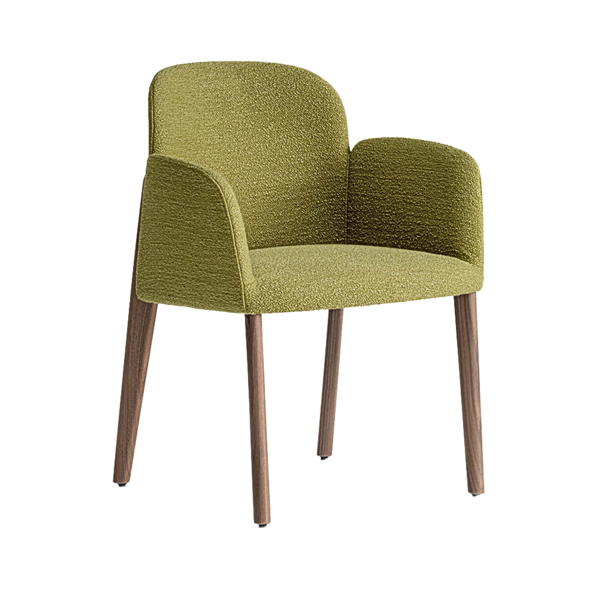 Its shapes are soft and organic. The junction of the leg, armrest and backrest forms a subtle joint that defines the core of the chair’s silhouette. The oval shape of the solid ash wood or walnut legs gradually tapers downwards into a round section. The seat features elastic belts, while the backrest and armrests, made of injected polyurethane foam, ensure balanced proportions. A functional handle integrated into the rear of the backrest blends into the armchair’s silhouette, enhancing its three-dimensional look.
