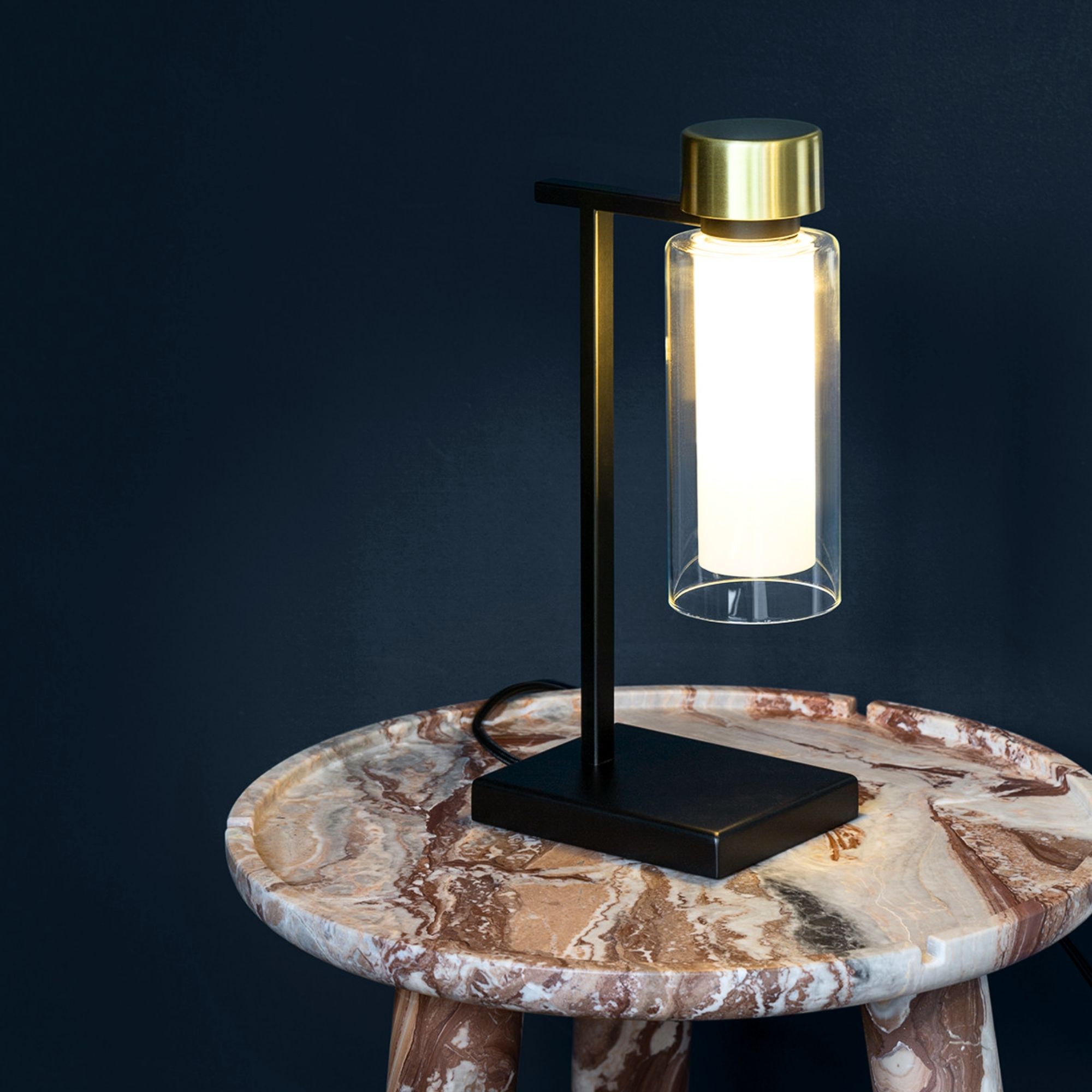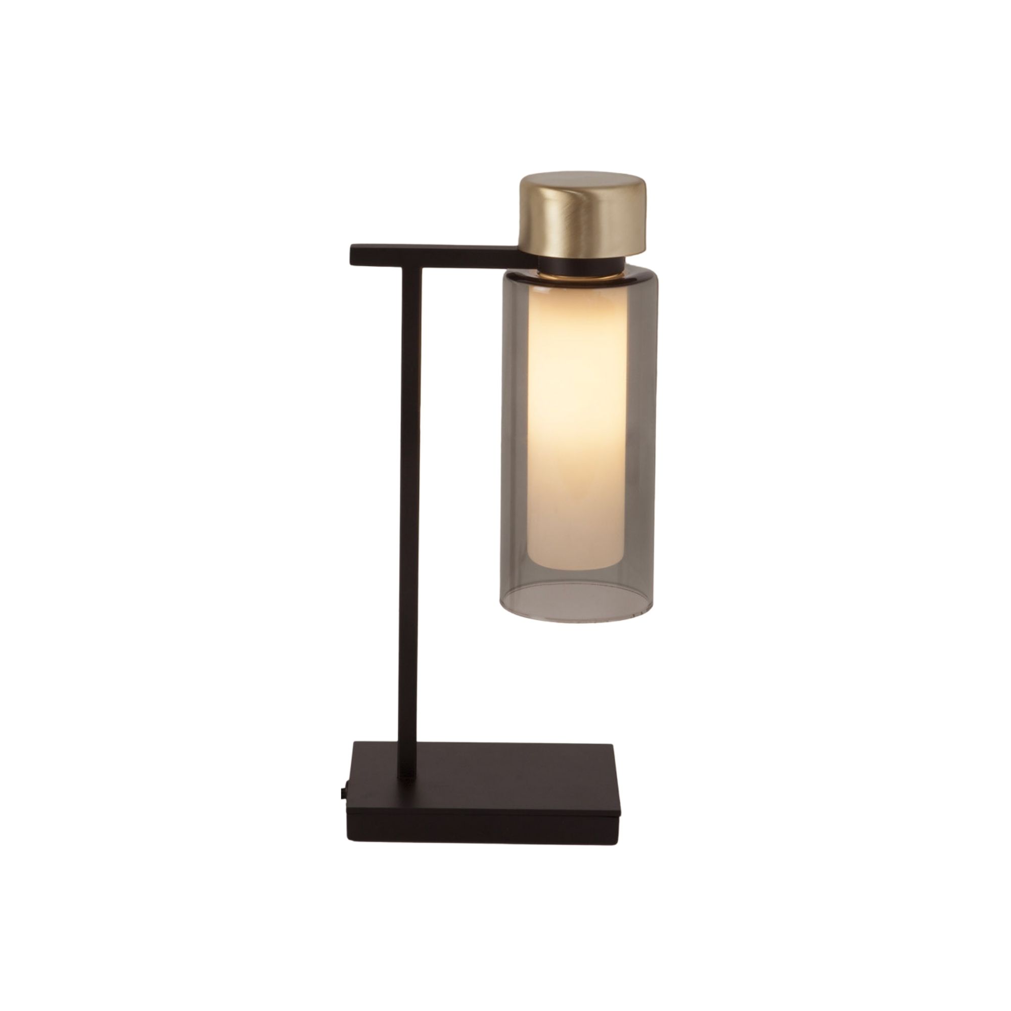 Osman Side Table Lamp by TOOY features a refined cylindrical glass diffuser paired with brushed metallic details. Its orthogonal, minimalist structure produces a soft and harmonious light effect while maintaining a contemporary, sculptural presence suited to bedside, desk, or ambient table applications.